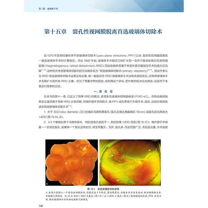 本书是在原来的《视网膜脱离显微手术学》基础上扩展而来,新增了大量需要玻璃体手术的没有视网膜脱离的眼底疾病。本书在原来三十章视网膜脱离显微手术学基础上,调整和新增加了十一个章节。共分为三篇四十章:第一篇论述了眼底疾病诊断和手术治疗的基础知识,包含了新增加的眼底疾病激光治疗和玻璃体腔内注药两章。第二篇是视网膜脱离外路显微手术,详细论述了显微镜下视网膜脱离外路手术的基本原理和手术技术,新增了大量手术范例,便于初学者对照学习。第三篇是玻璃体手术,全面系统地介绍了新的微创全玻璃体切除手术。