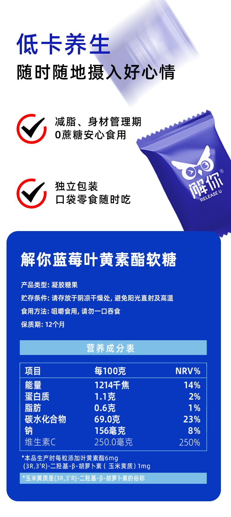 【粉丝专享特惠】解你Release U 蓝莓叶黄素酯软糖眼睛视力营养叶黄体素成人儿童老人120g/瓶(4g*30粒)