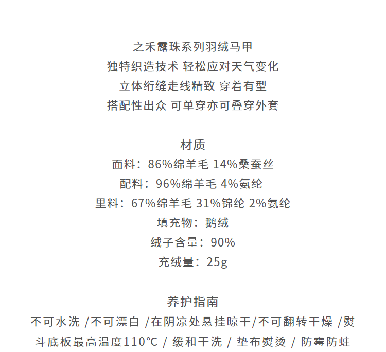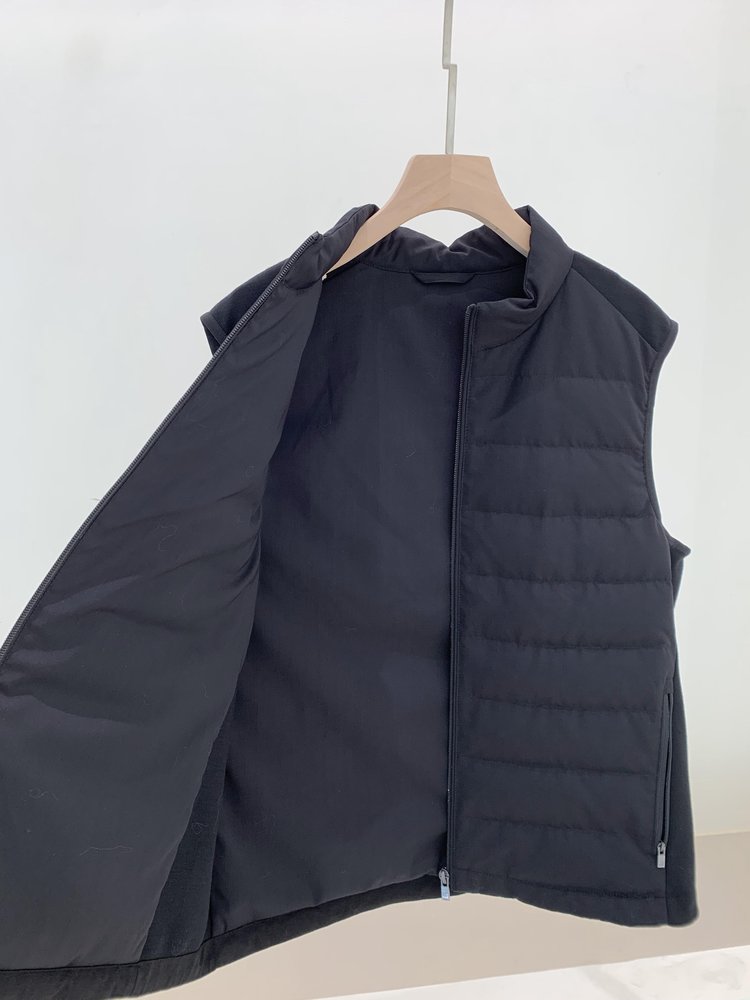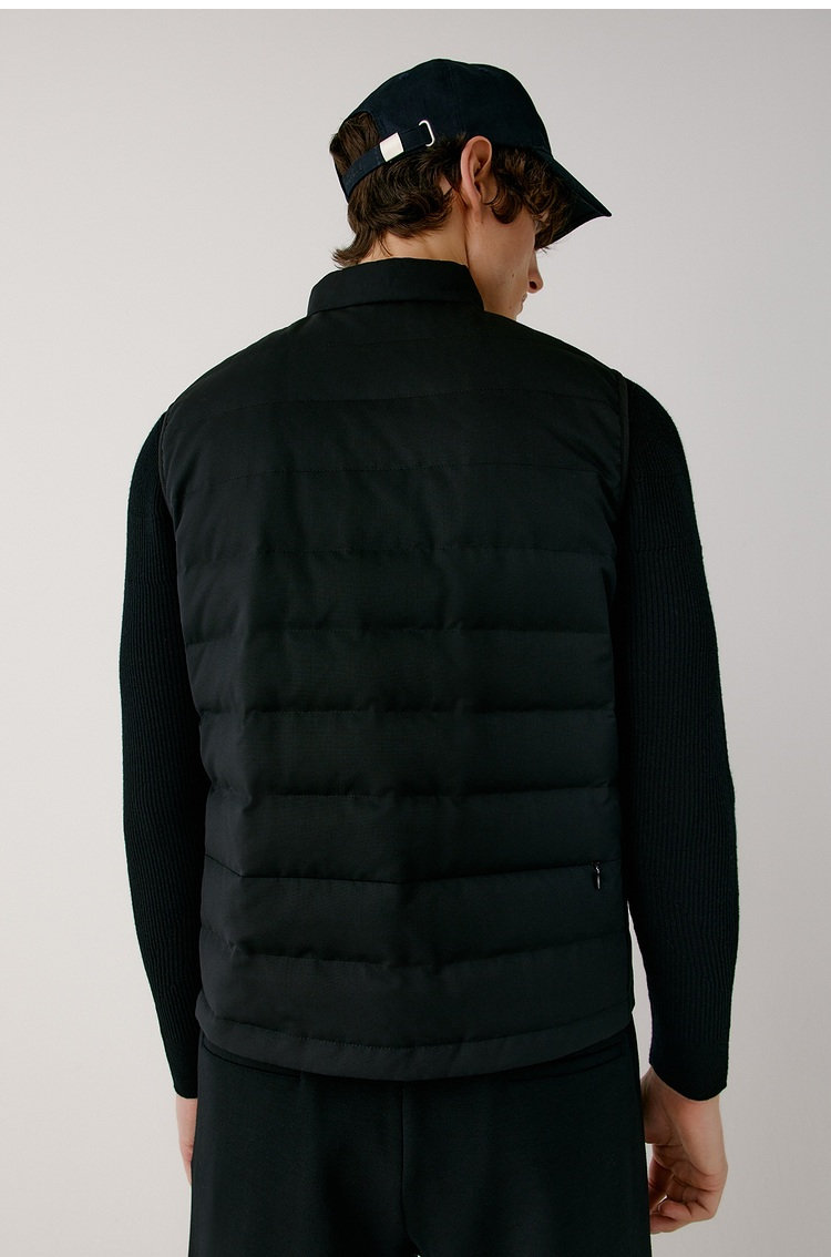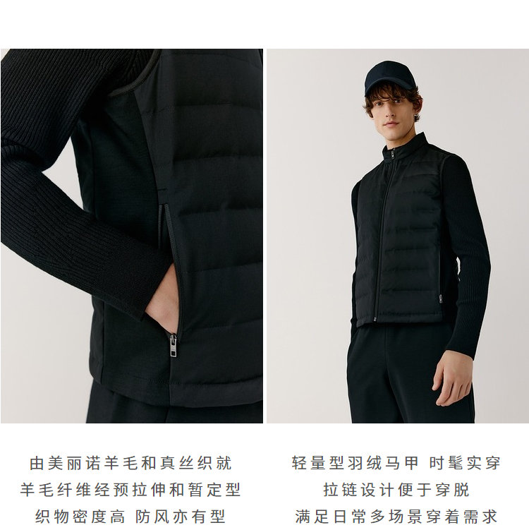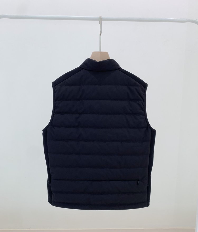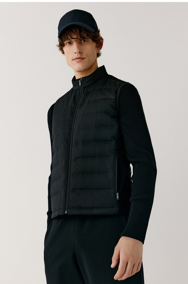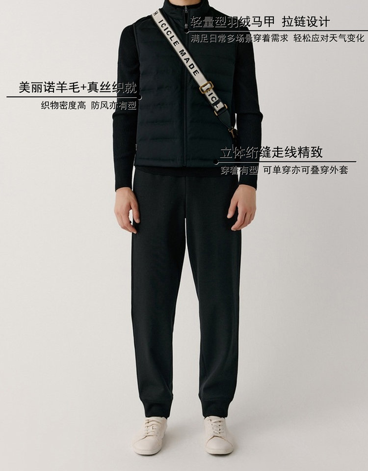 露珠系列羽绒马甲 男款丝羊毛精纺平纹布 立体绗缝走线精致 桑蚕丝+绵羊毛混纺纱线 直身H版型 实穿百搭 精致圆立领设计