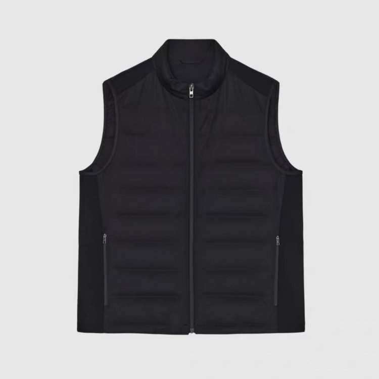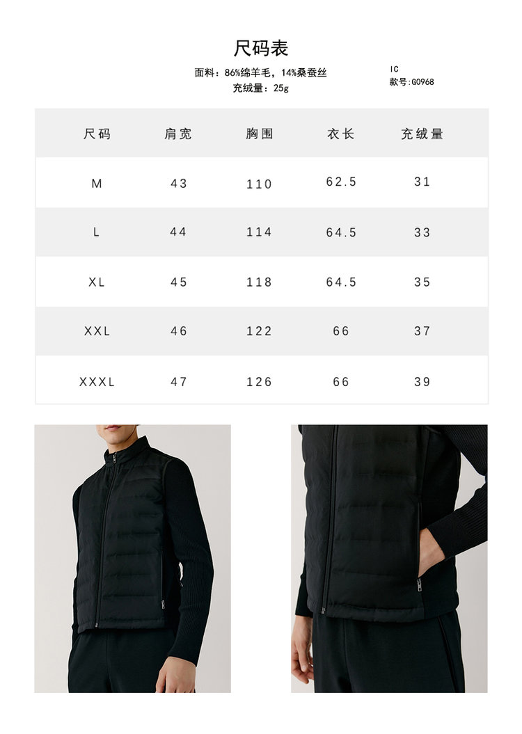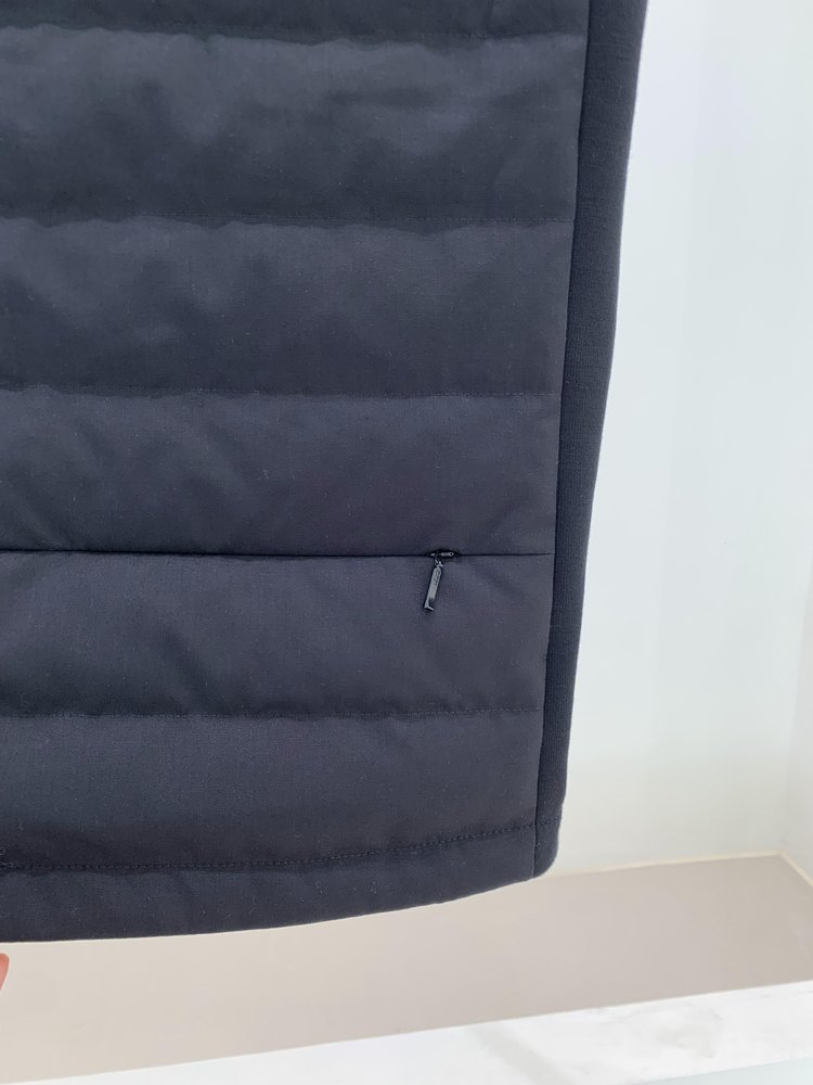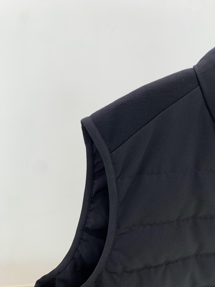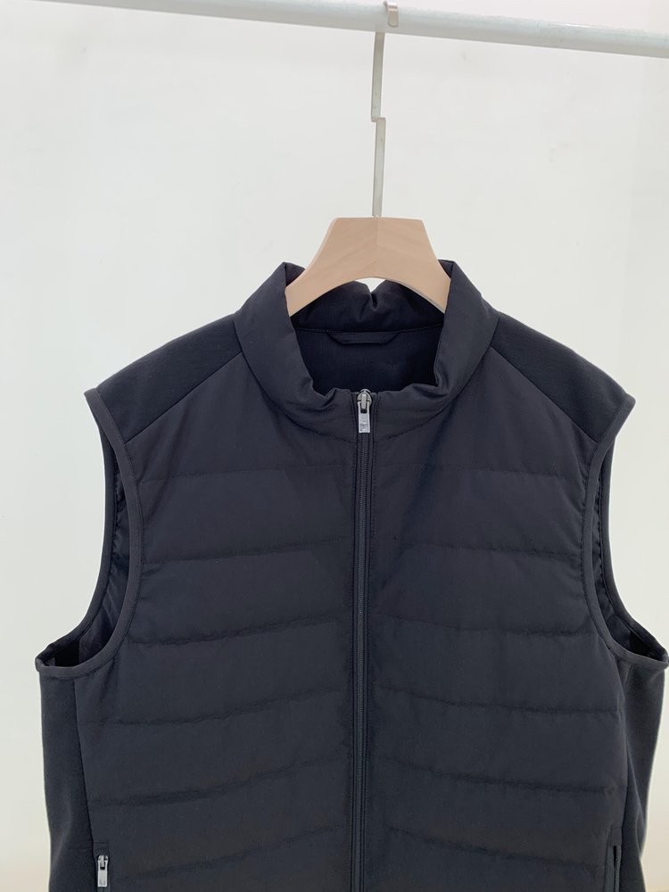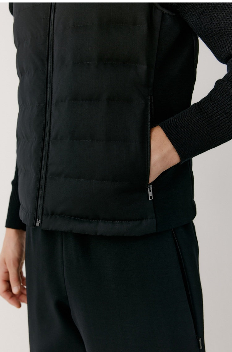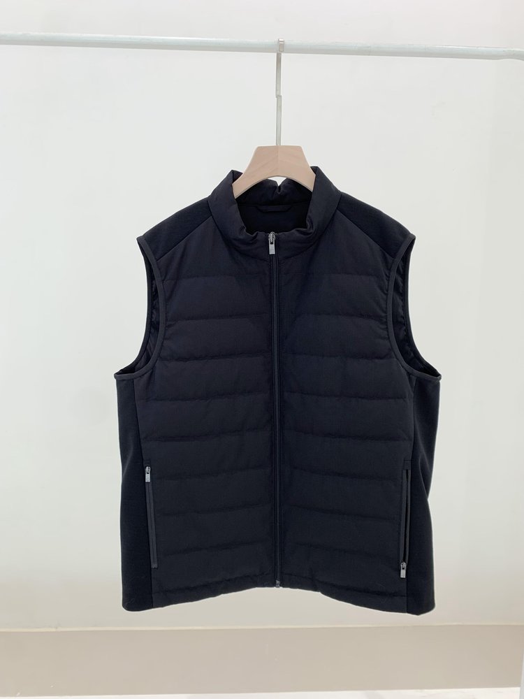 露珠系列羽绒马甲 男款丝羊毛精纺平纹布 立体绗缝走线精致 桑蚕丝+绵羊毛混纺纱线 直身H版型 实穿百搭 精致圆立领设计