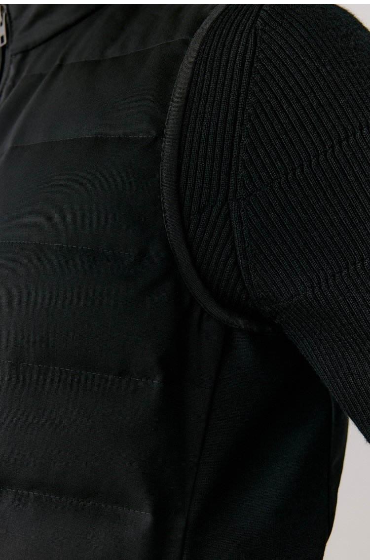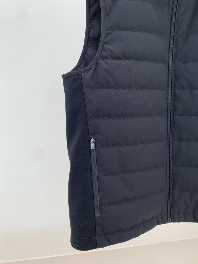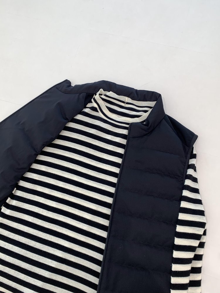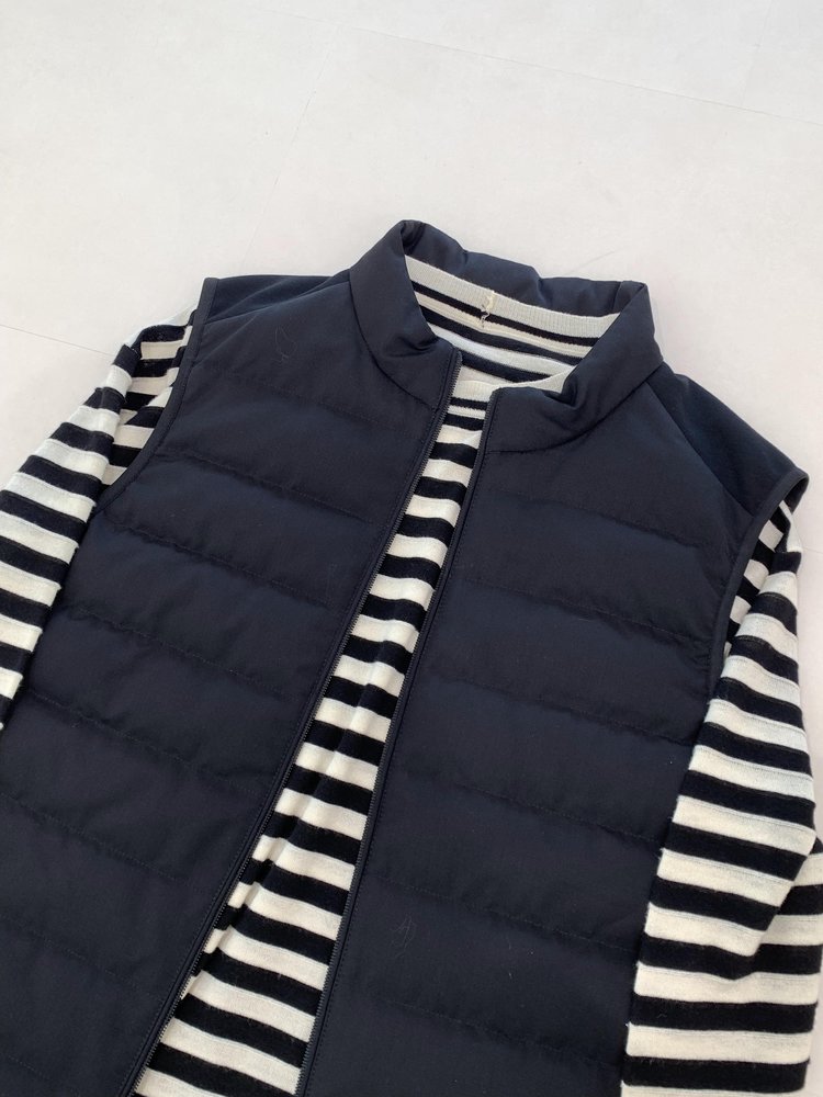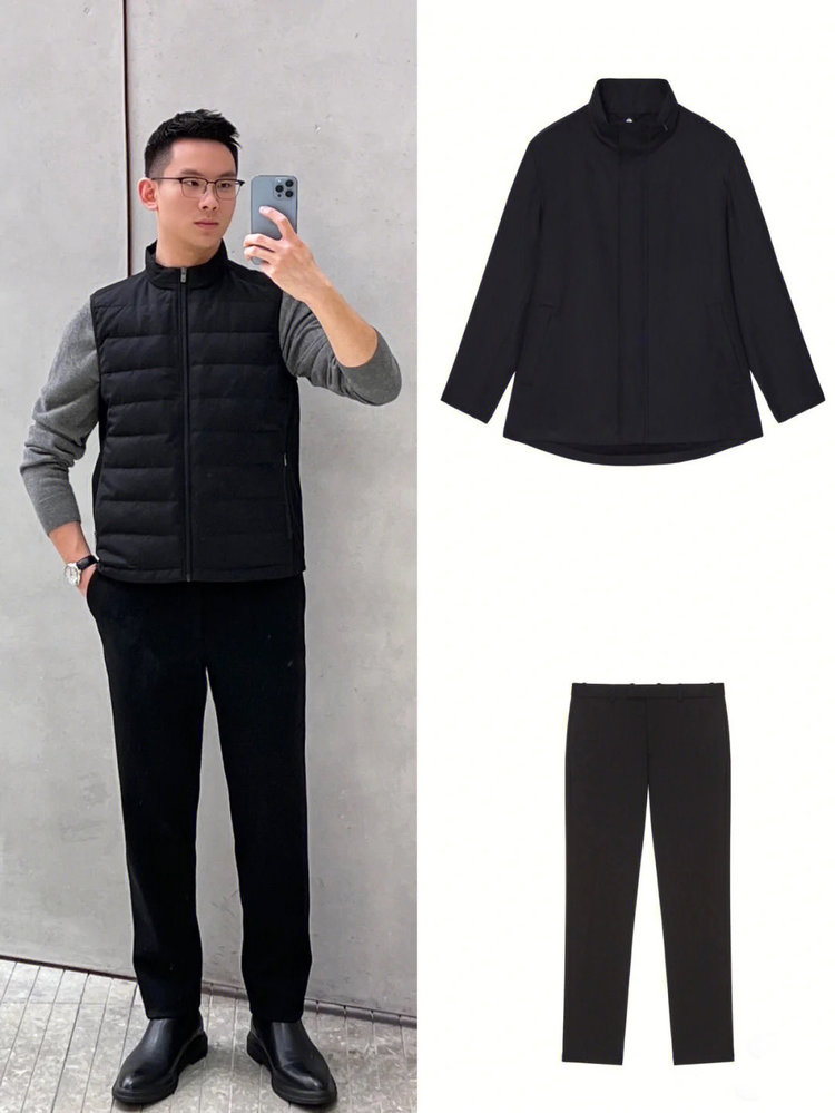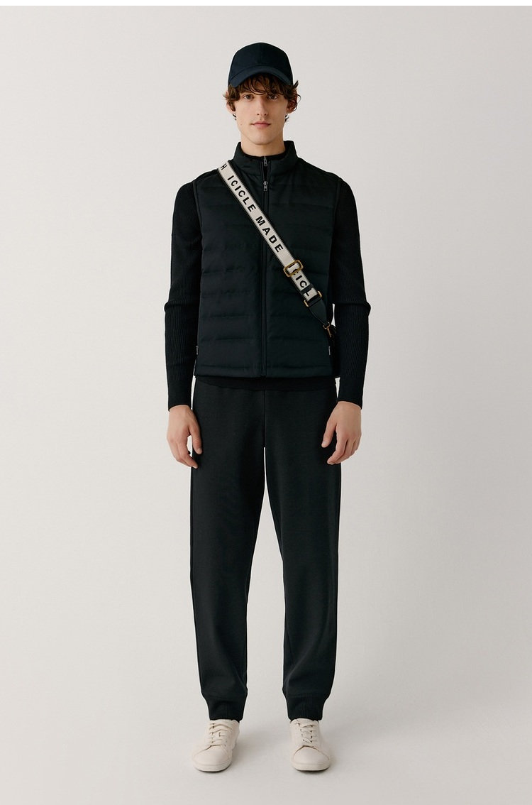 露珠系列羽绒马甲 男款丝羊毛精纺平纹布 立体绗缝走线精致 桑蚕丝+绵羊毛混纺纱线 直身H版型 实穿百搭 精致圆立领设计