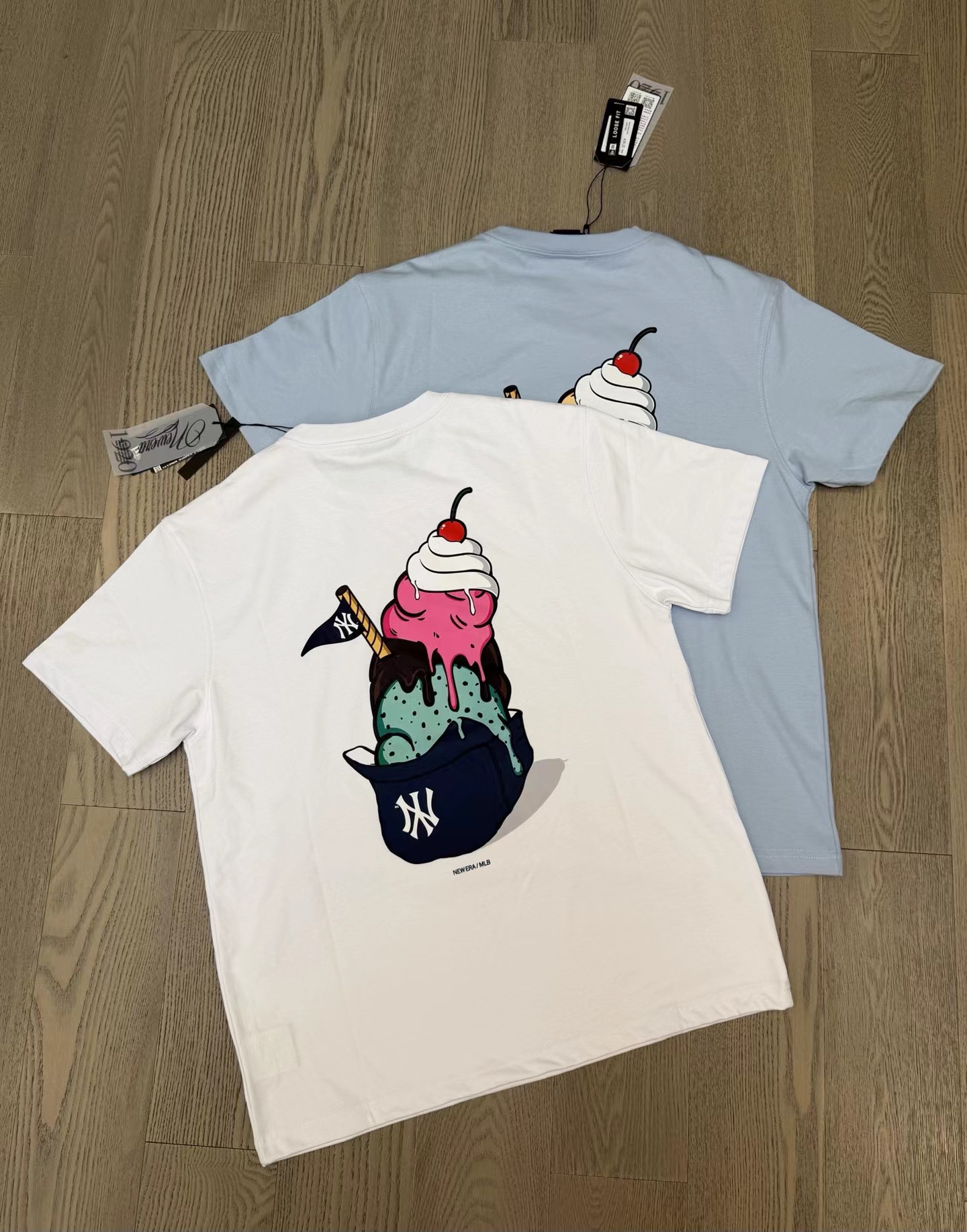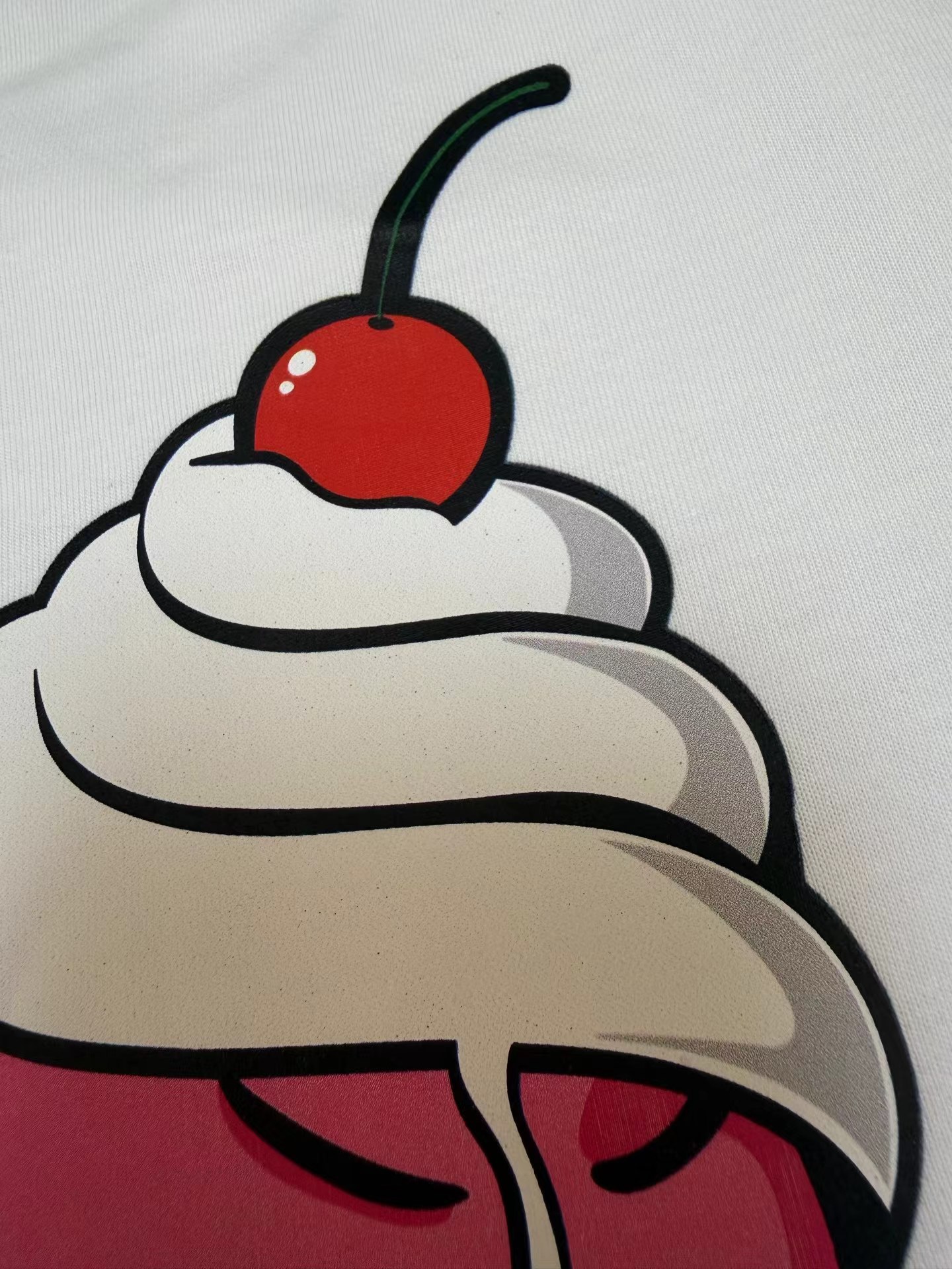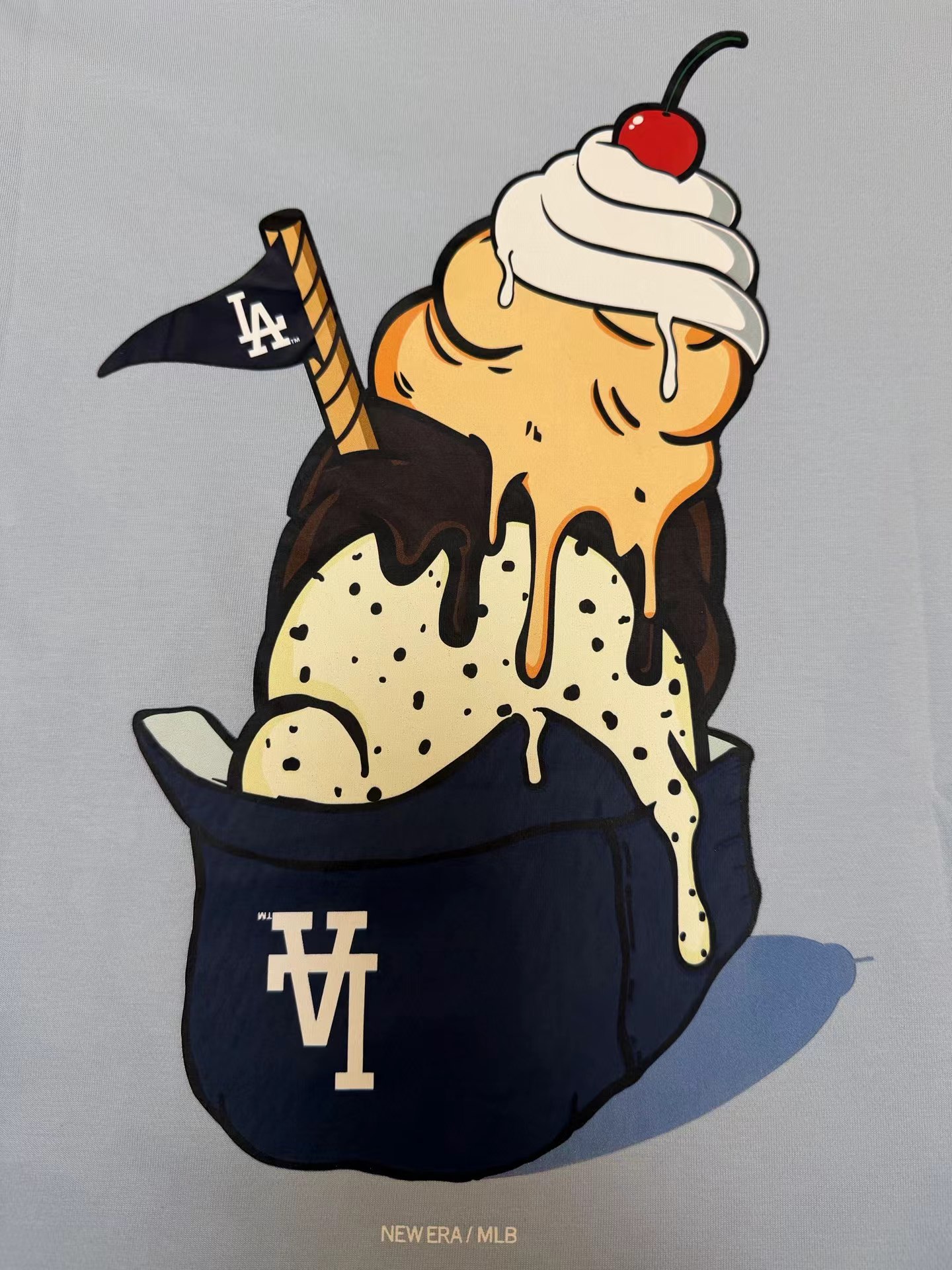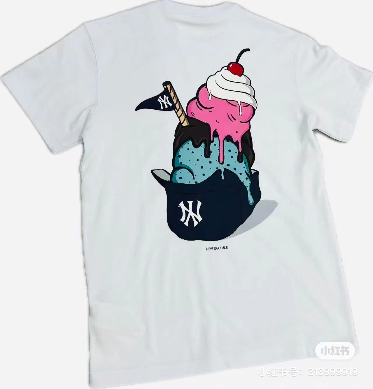 新春圆领短袖T恤男女潮,左胸处学院风的球队队标logo印花+肩袖口徽标刺绣。后背是球场美食主题的美食图案设计印花,一个可爱的冰淇淋图案印花,有趣又时尚,潮流感满满。宽松廓形,不挑身材,松弛氛围感。年轻 自由…..品牌客供的科技特殊定制COOLERA面料,正面是光滑的,内层有点点像网眼布一样的细孔,穿起来更舒服透气。