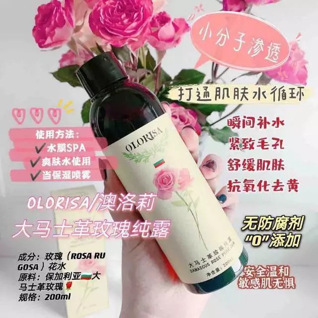 澳洛莉大马士革玫瑰纯露是「植物的花水」。润物细无声,清爽无负担玫瑰纯露是蒸馏玫瑰而得,成分纯粹,不会添加色素,香精、保湿剂,质地就像白开水,比一般化妆水清爽好几倍。轻拍上脸,几乎一下就被皮肤吸收了,完全无负担~