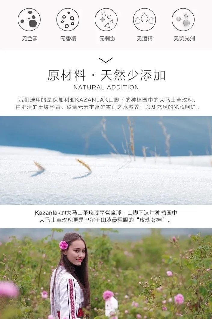 无人工色素、香料、酒精、防腐剂等化学添加物,自然玫瑰精华,敏感肌及孕妇也可放心使用。