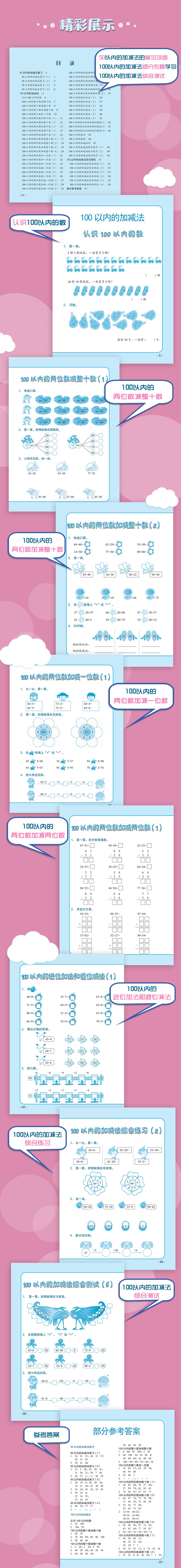 2. 本书的主要内容包括"50以内的加减法复习” "100以内的加减法” "100以内的加减法综合测试”,帮助儿童对100以内各数的认识、加减法的口算技法等方面进行学习。