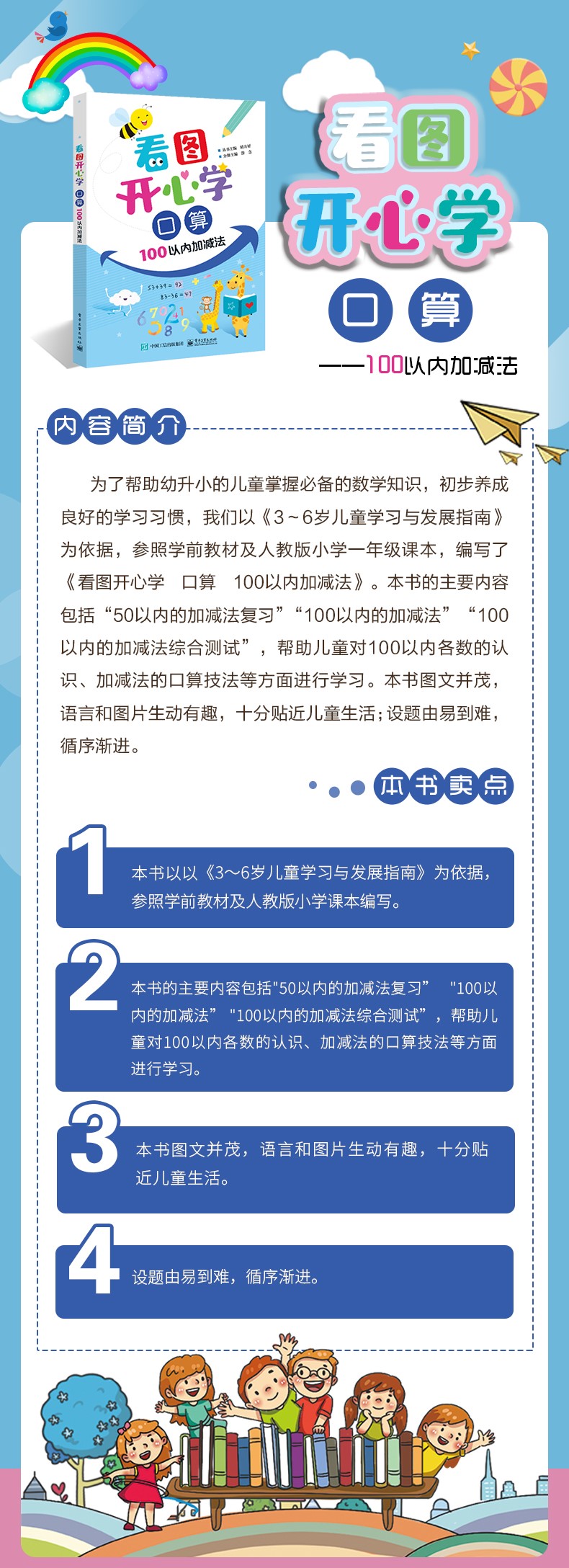 为了帮助幼升小的儿童掌握必备的数学知识,初步养成良好的学习习惯,我们以《3~6岁儿童学习与发展指南》为依据,参照学前教材及人教版小学课本,编写了《看图开心学 口算 100以内加减法》。本书的主要内容包括"50以内的加减法复习” "100以内的加减法” "100以内的加减法综合测试”,帮助儿童对100以内各数的认识、加减法的口算技法等方面进行学习。本书图文并茂,语言和图片生动有趣,十分贴近儿童生活;设题由易到难,循序渐进。
