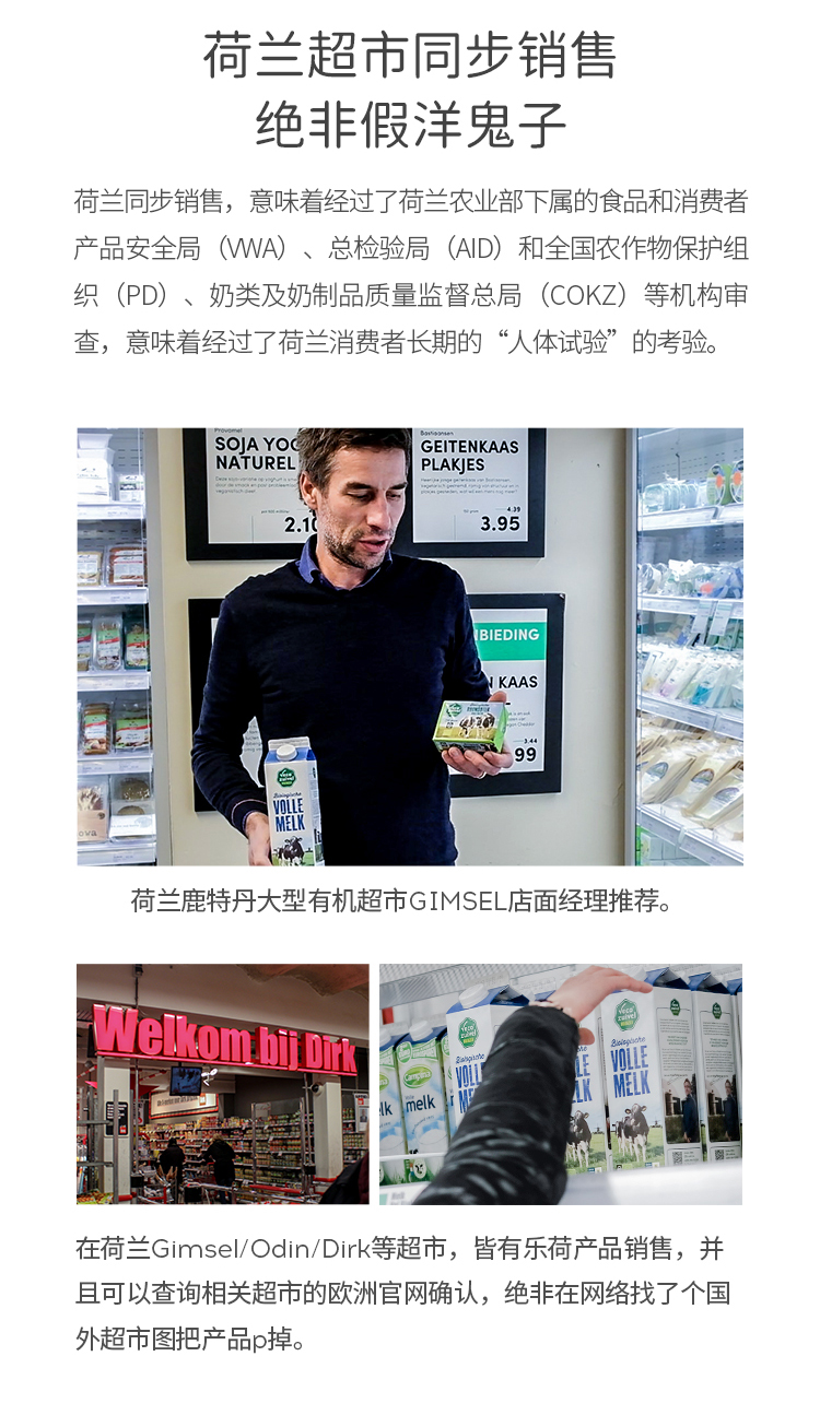 “进口牛奶非进口”在今天的奶制品市场上已经不是什么新鲜事了,很多国外牛奶品牌都是打着国外公司的名头,以高昂的价格,卖着中国本土产的奶。虽说现在国内的很多奶源确实也不错,但毕竟花了进口的价钱,肯定是希望买到真正进口的奶。乐荷在荷兰当地各大超市都是真实有售的,摆满超市货架好几排。品牌进口到国内的每个批次的牛奶都有正规的进口报关单和检疫报告,每一盒牛奶都是从荷兰远道而来的原装进口,日期新鲜。但因为生产标准严苛,对环境、奶牛的质量要求都很高,乐荷每年的产量都是有限的,经常不定期断货,大家有货的时候记得要囤哦!保质期1年那么久呢!