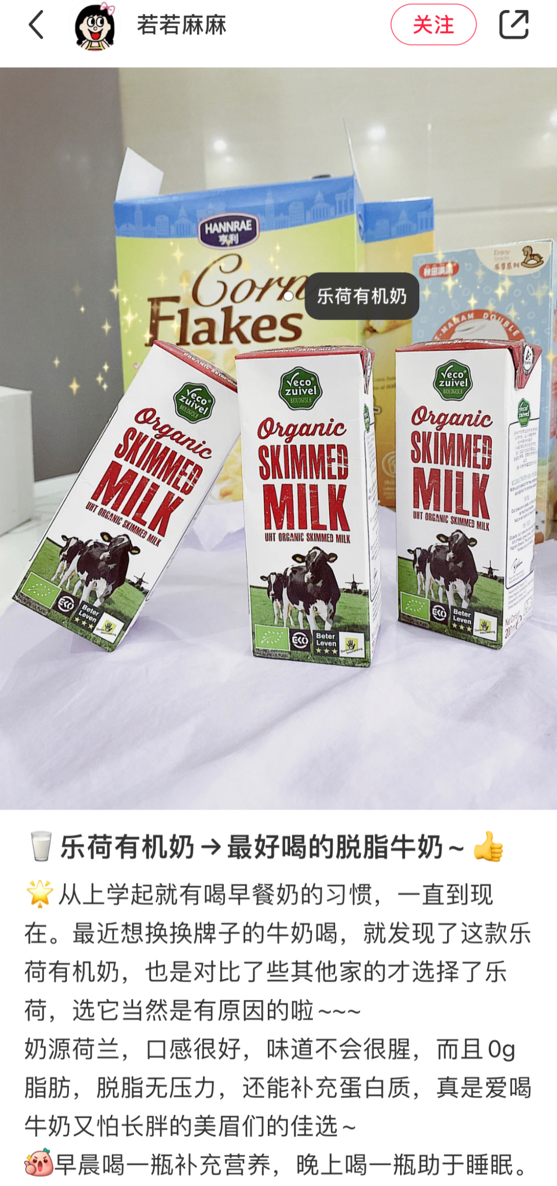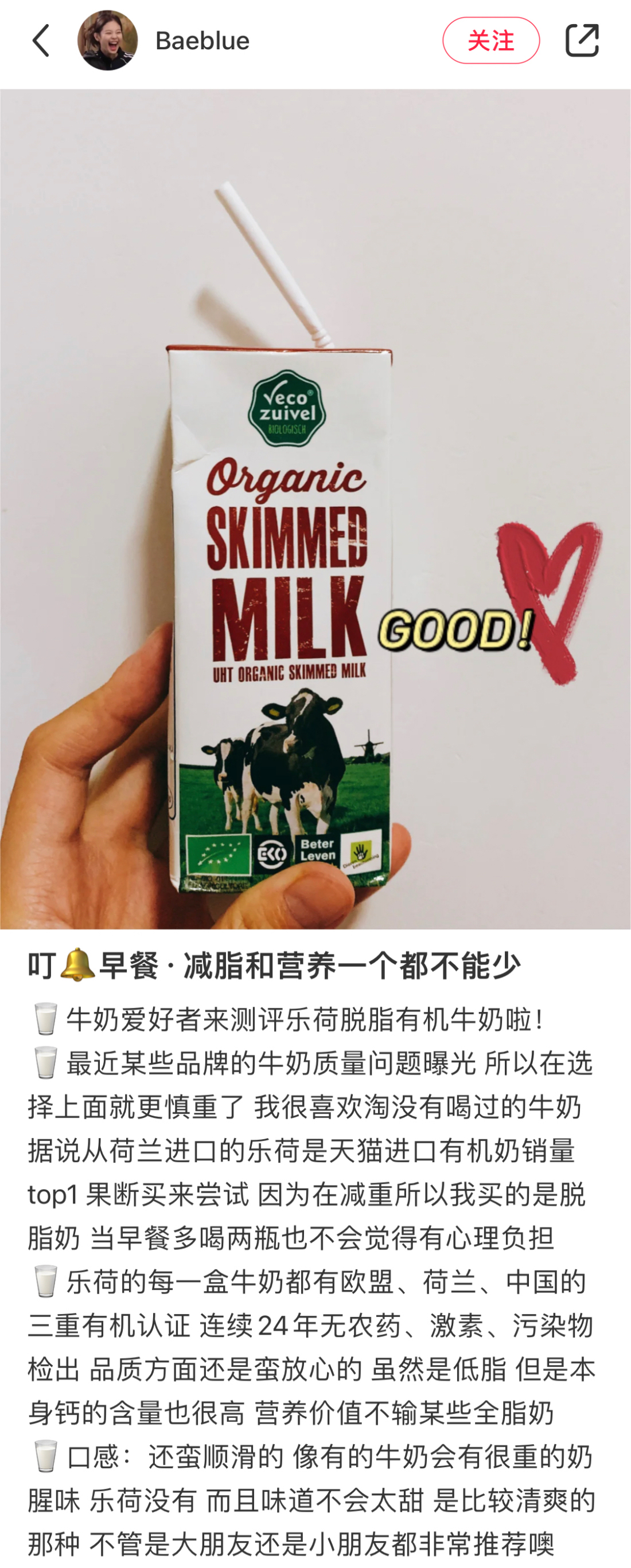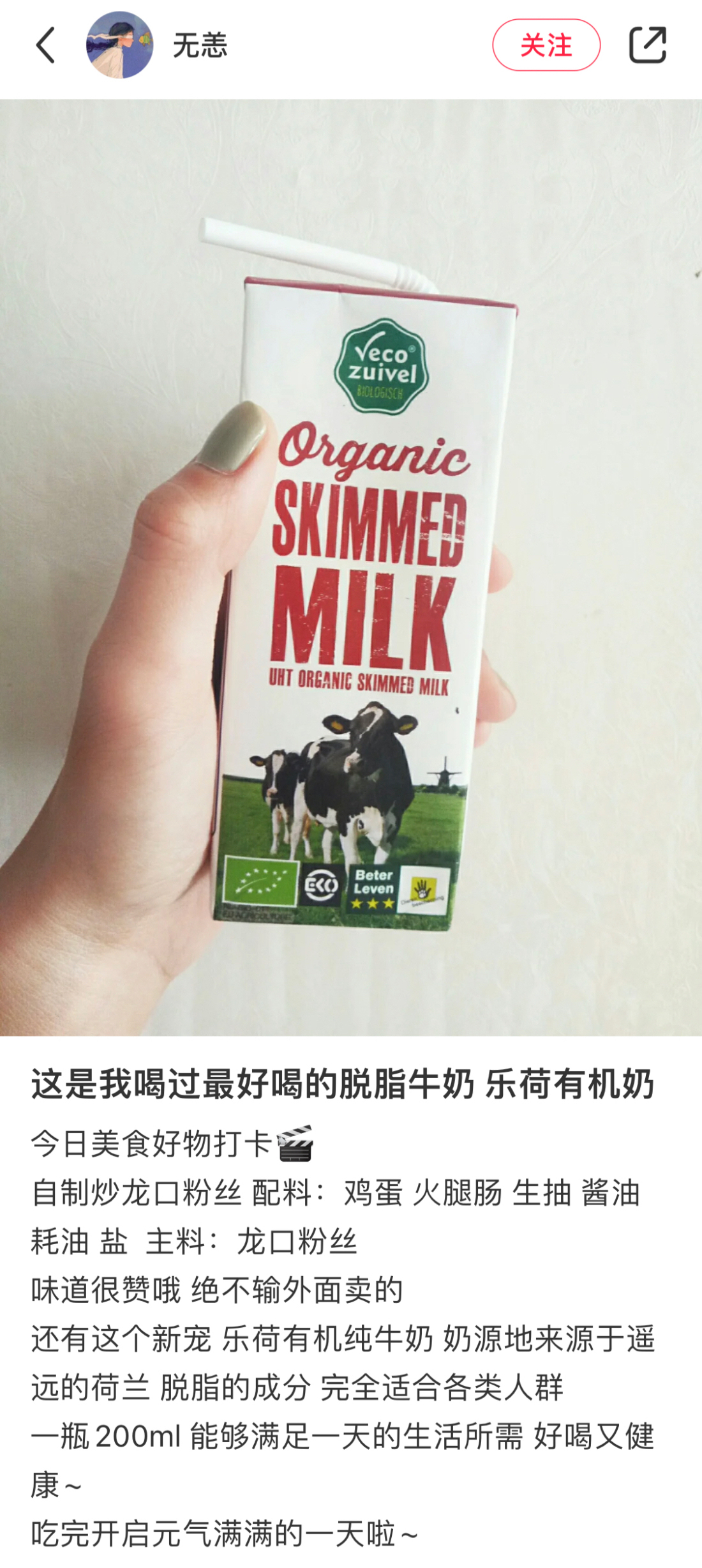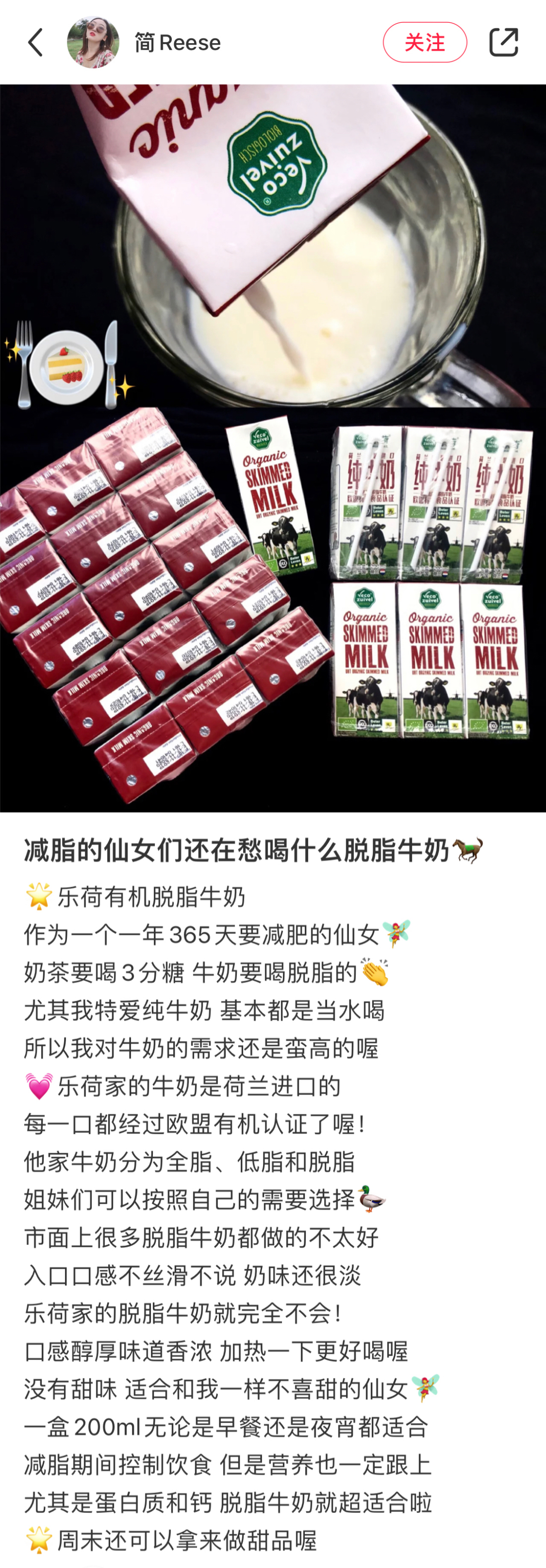 自从上了百菲酪,我几乎就没喝过普通牛奶了,所以一直也没再选新的。上周囤乐荷黄油的时候,品牌方按头推荐了他们家的有机脱脂奶,是产自google地图上都能看见的乐荷开放牧场,真有机,真0脂,真进口的荷兰牛奶!本着对乐荷黄油的爱,就也来上一上!特别适合减脂期喝喝!