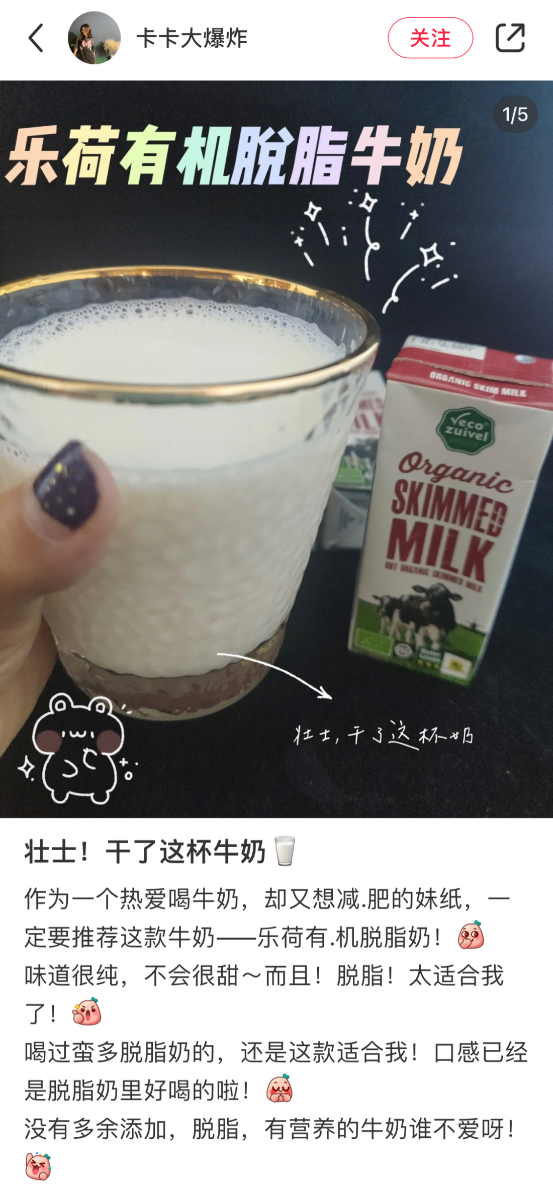 乐荷牛奶其实有好几款,之所以选了脱脂奶,主要还是考虑到健身减肥人群的需求。虽然脱脂奶没有全脂奶醇厚顺滑,但乐荷算是我喝过的口感比较棒的了,奶香浓郁,无论是用来泡麦片、泡咖啡还是用来做奶茶、酸奶、水果奶昔,都好喝!因为乐荷采用了UHT杀菌技术,所以开封前是无需冷藏的,这就特别适合像我这样的爱囤货星人,要喝的时候开一瓶,1L够撑2-3天了!