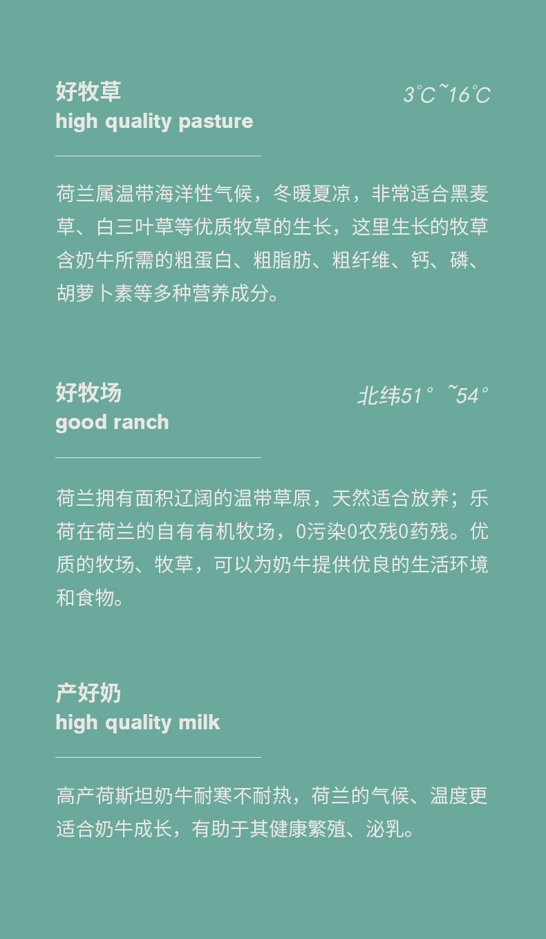 虽说市场上有机奶多如牛毛,但乐荷的奶是实打实经过了欧盟、荷兰、中国三重有机认证,这可不是一件容易的事情哦!要知道,“有机牛奶”强调的是天然无污染,也就是说从奶牛吃的草、喝的水开始,就要严格把控,不允许使用化肥、农药、激素、生长调节剂等人工合成的化学物质。也就是说,乐荷的奶牛,每天都在度假。人不如牛系列……乐荷牧场的每头牛都有自己的电子项圈来检测身体情况,只有当奶牛身体健康的时候才会由温柔的挤奶机器无接触挤奶,挤完之后马上冷链货车运输到公司进行灭菌包装,脱脂奶则再多一道脱脂的程序,整个过程有机无污染可追溯,喝起来才会更放心。