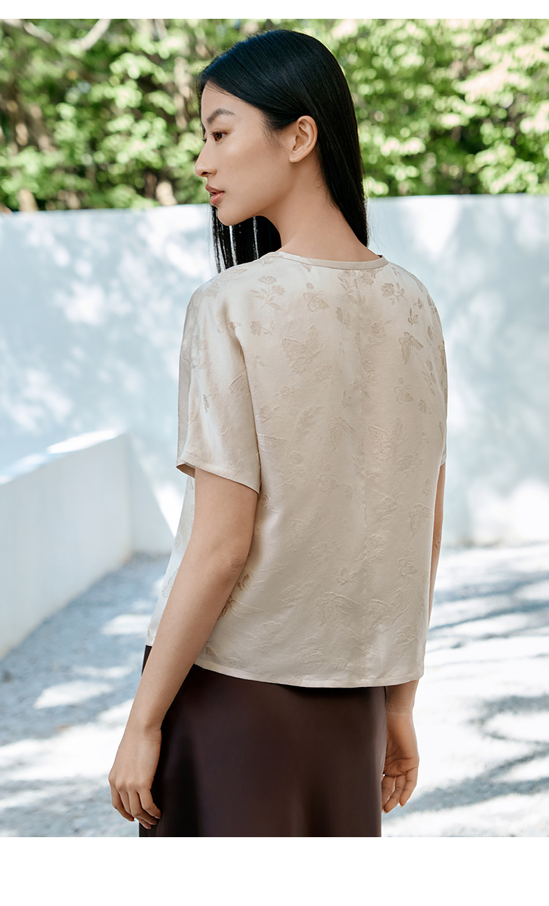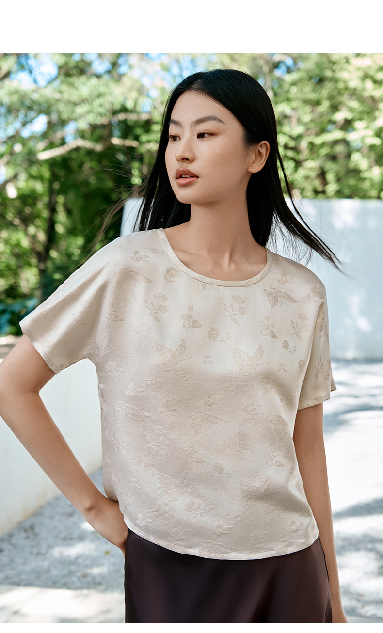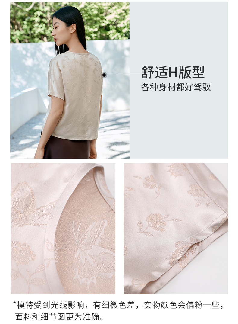 金三塔桑蚕丝小衫女桑波缎提花圆领宽松透气短袖T恤春夏新品 YSFFB703