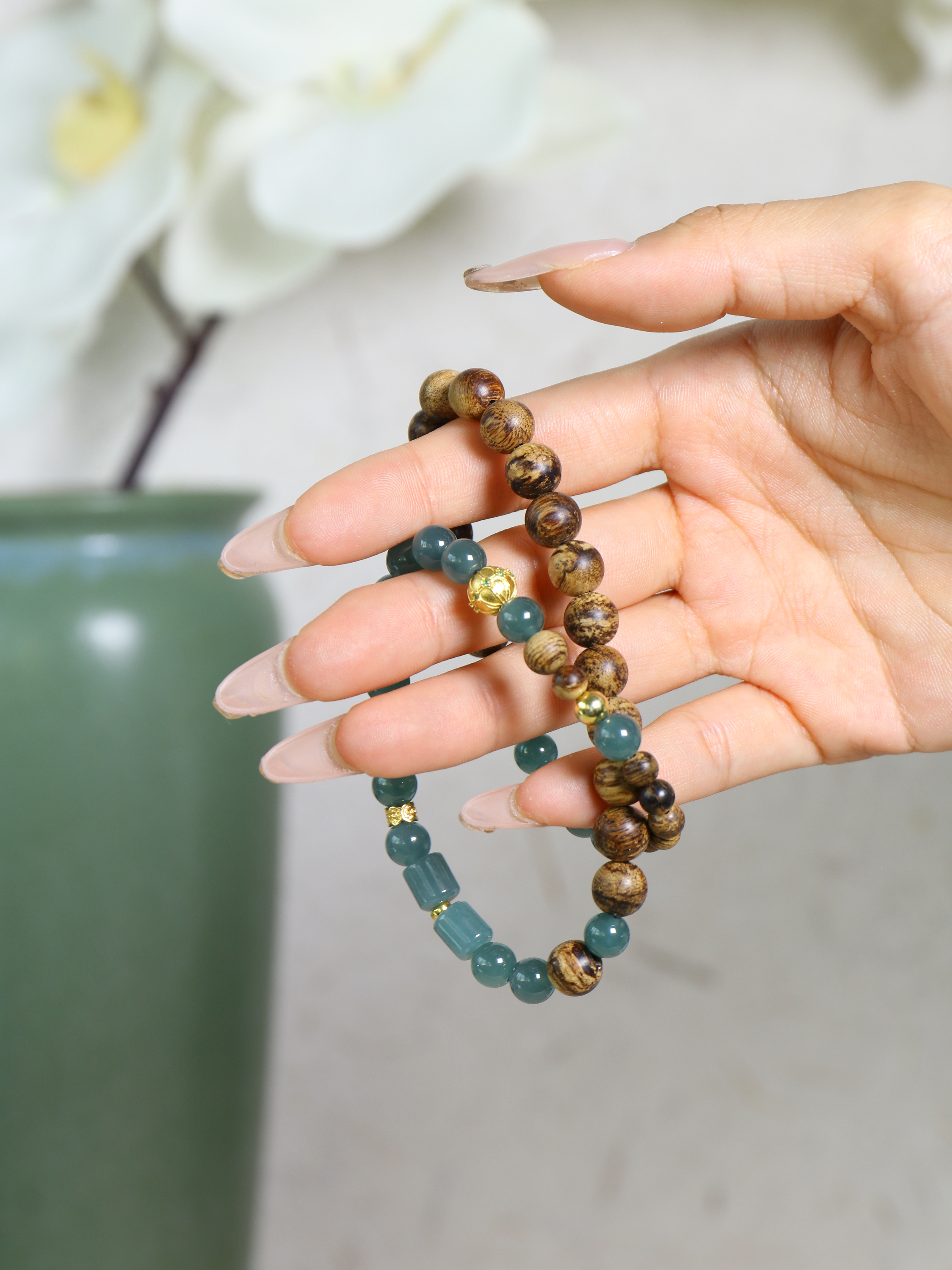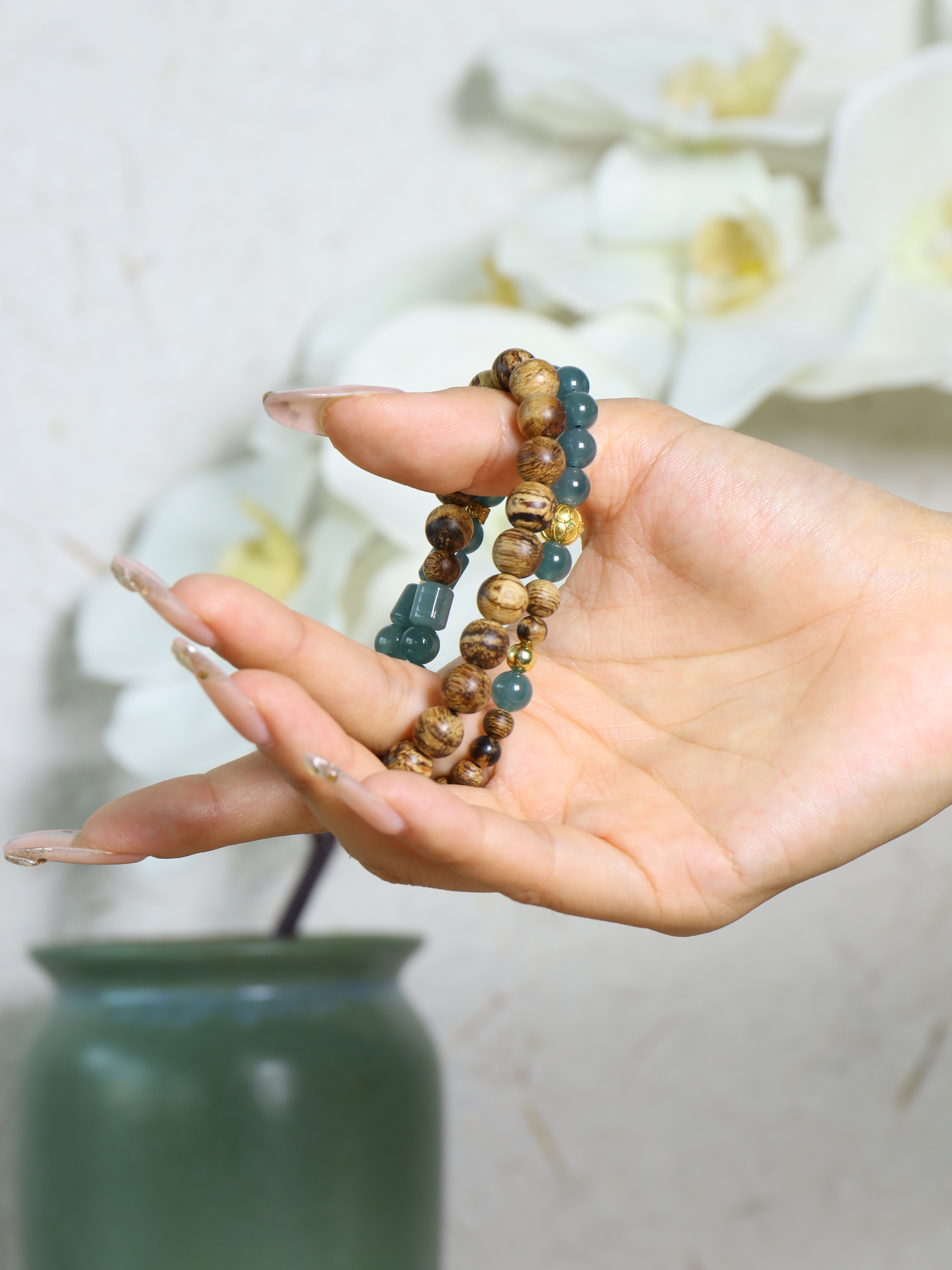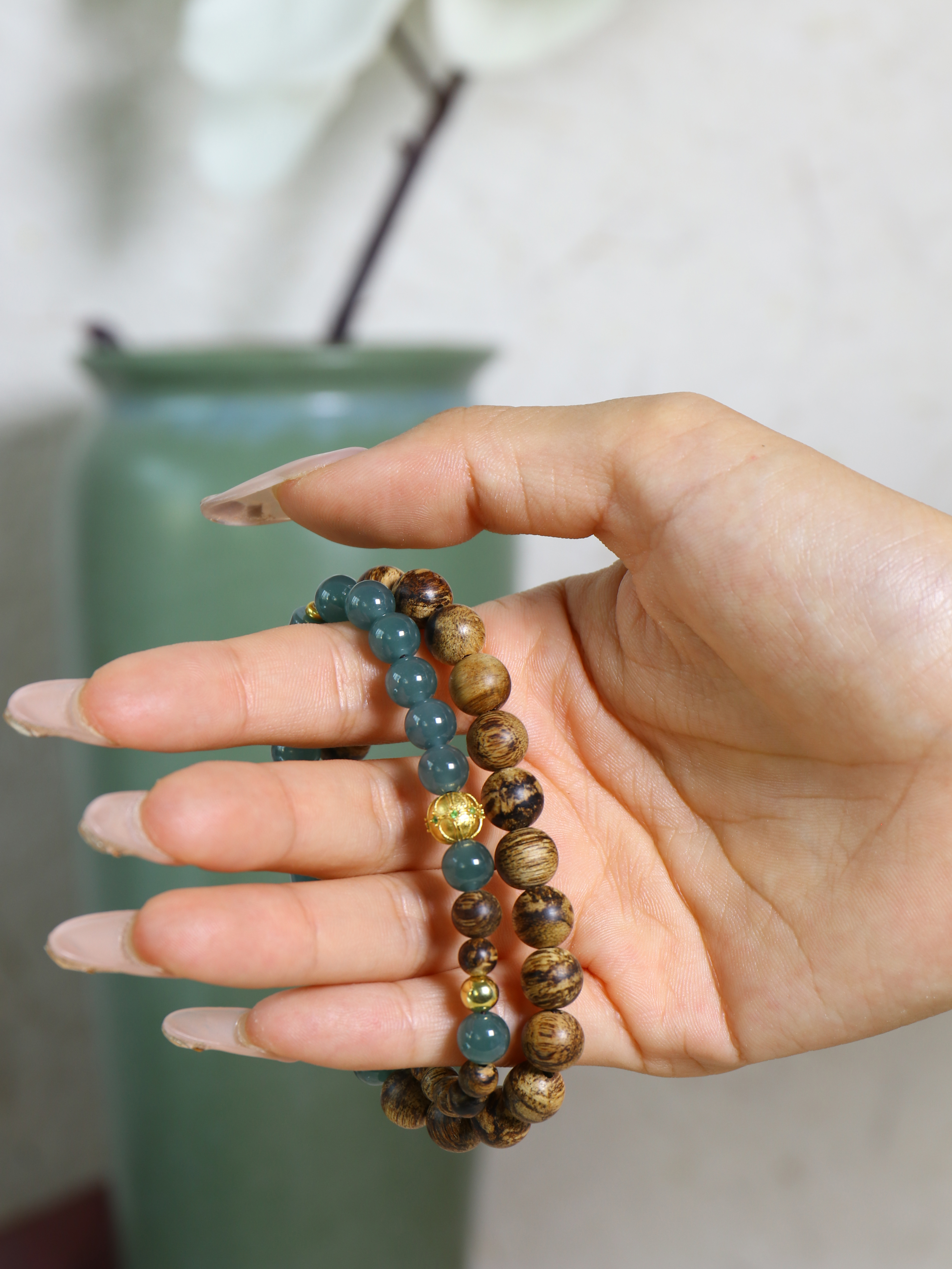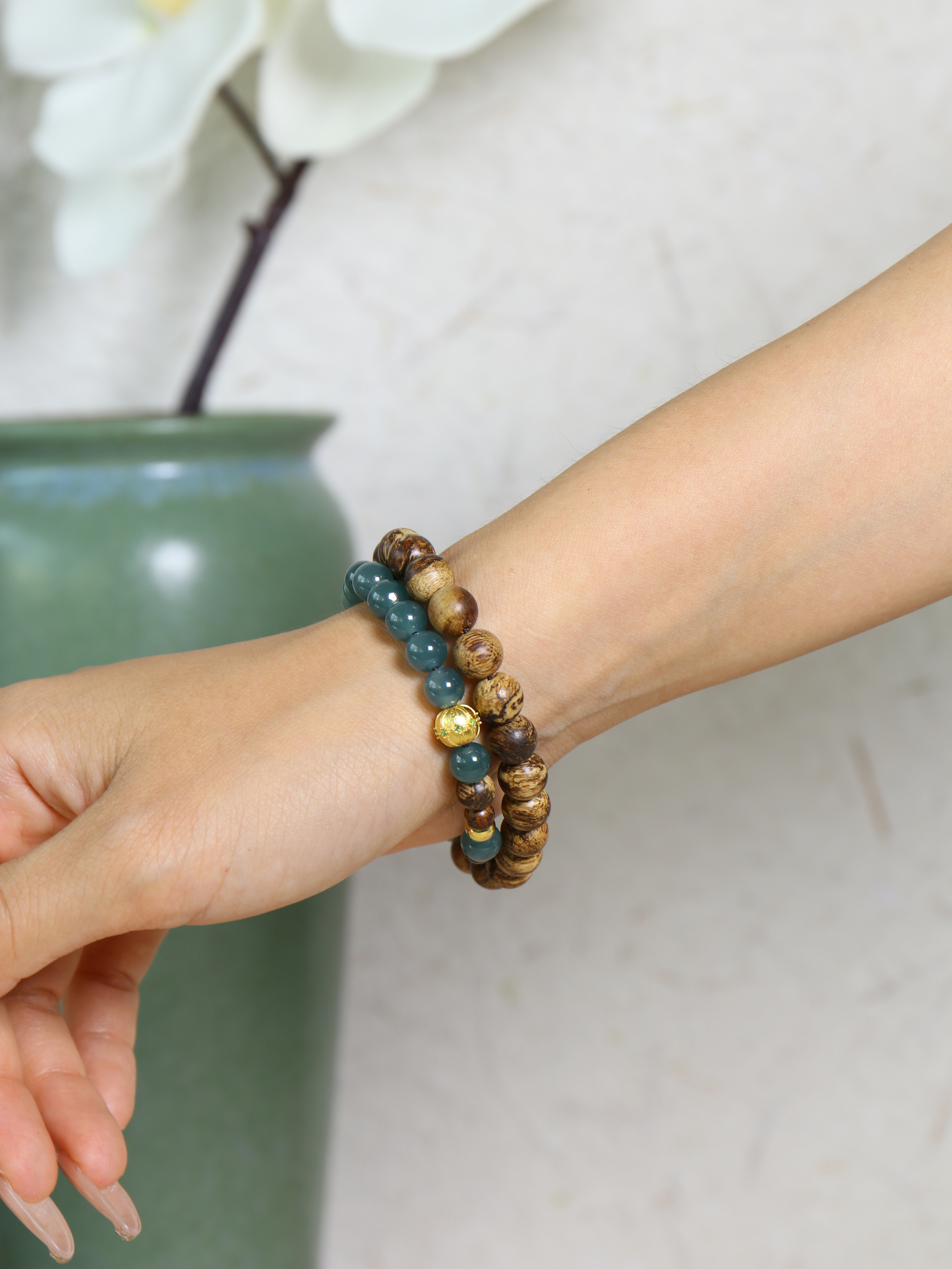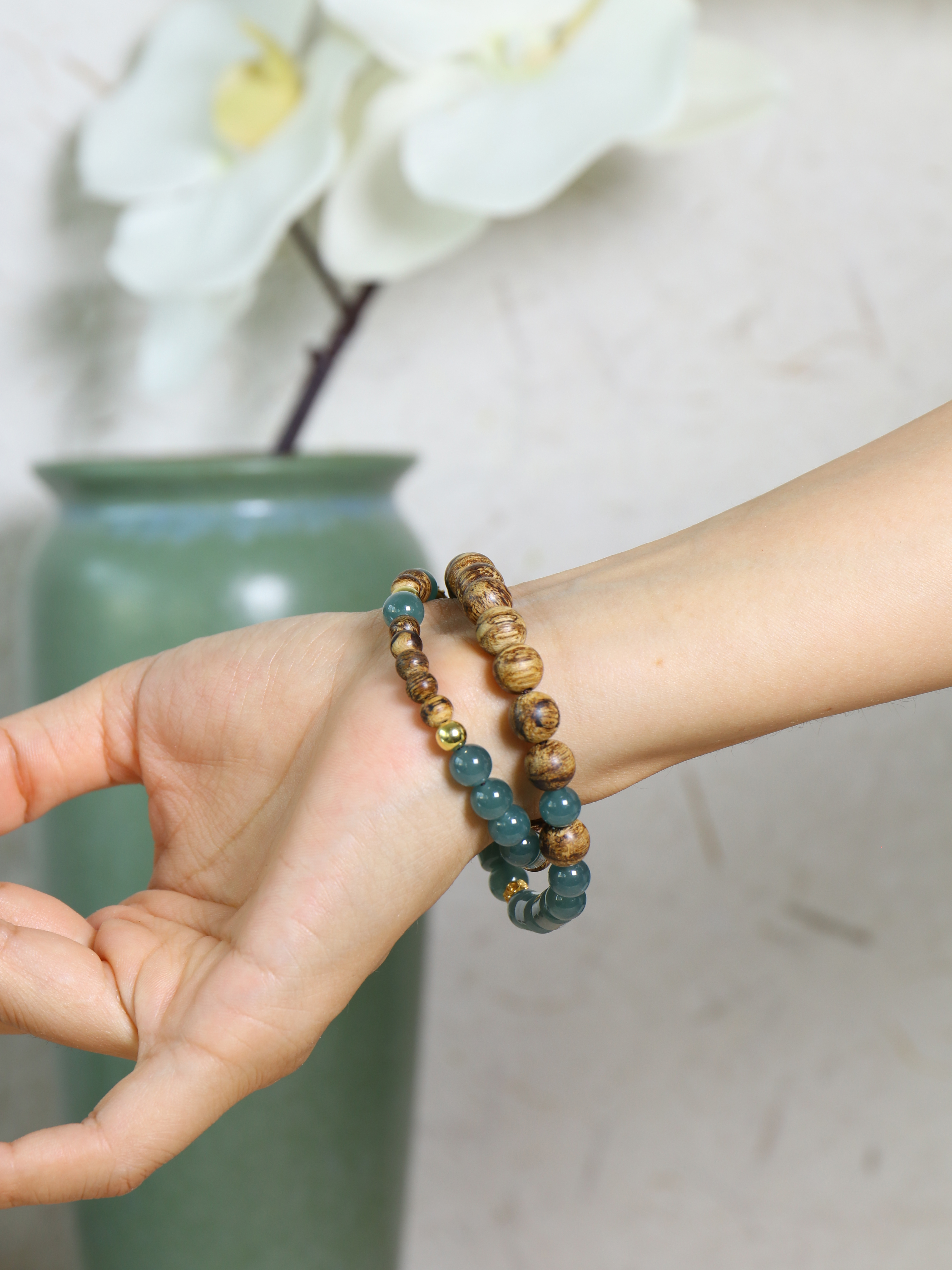 翡翠采用圆珠与桶珠并置,青翠有层次,呼应双圈的节奏轻盈;