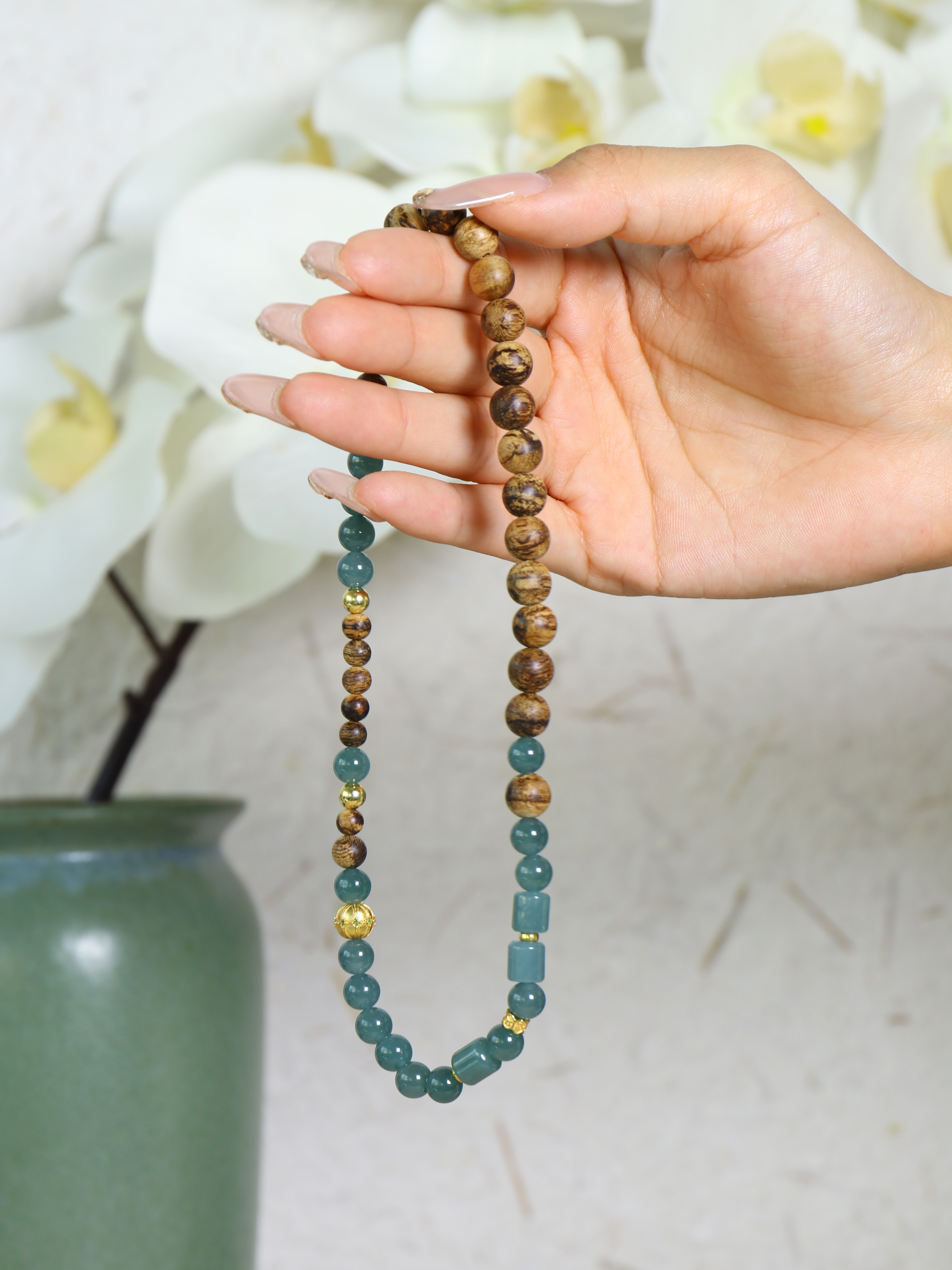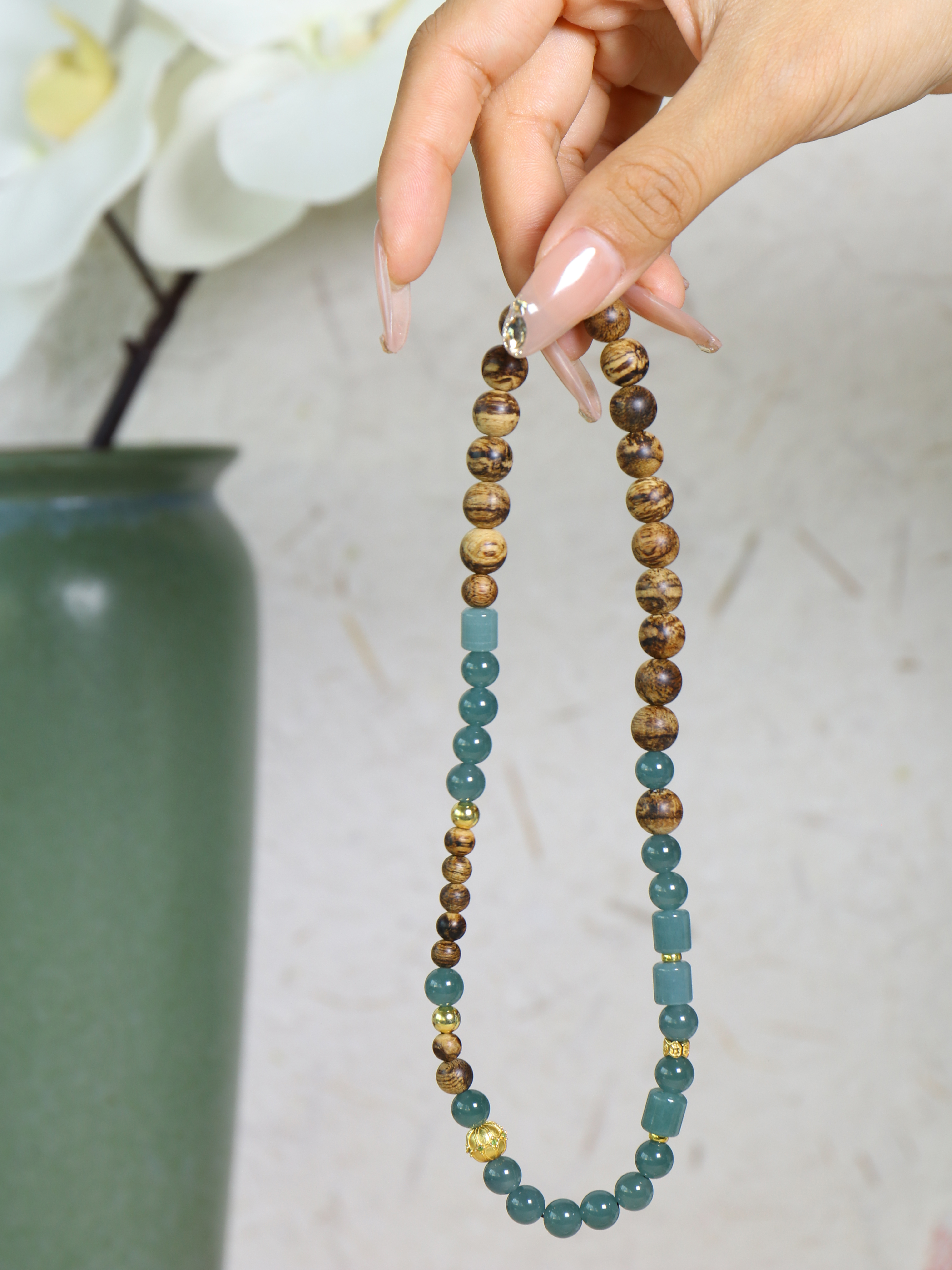 主珠选用马泥涝沉香,纹理细腻,色泽温润,带有天然生命的肌理感;