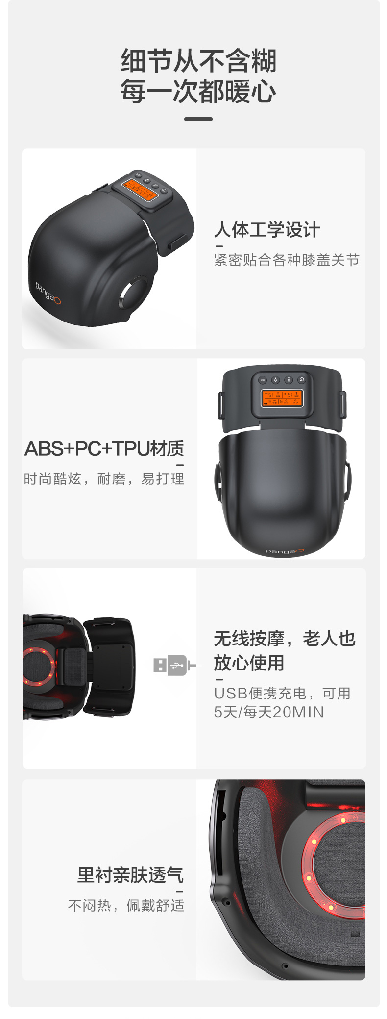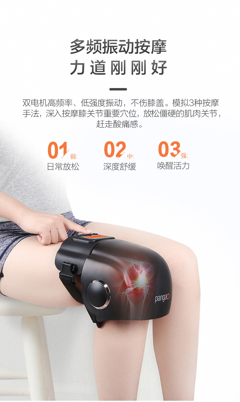 产品明细:名称:护膝宝-智能护膝按摩仪 型号:PG-2015F3 充电电源:DC 5V/ 1A(USB)_x000b_锂电池:DC 3.7V/ 3400mAh 输入功率:10W 重量:约750g