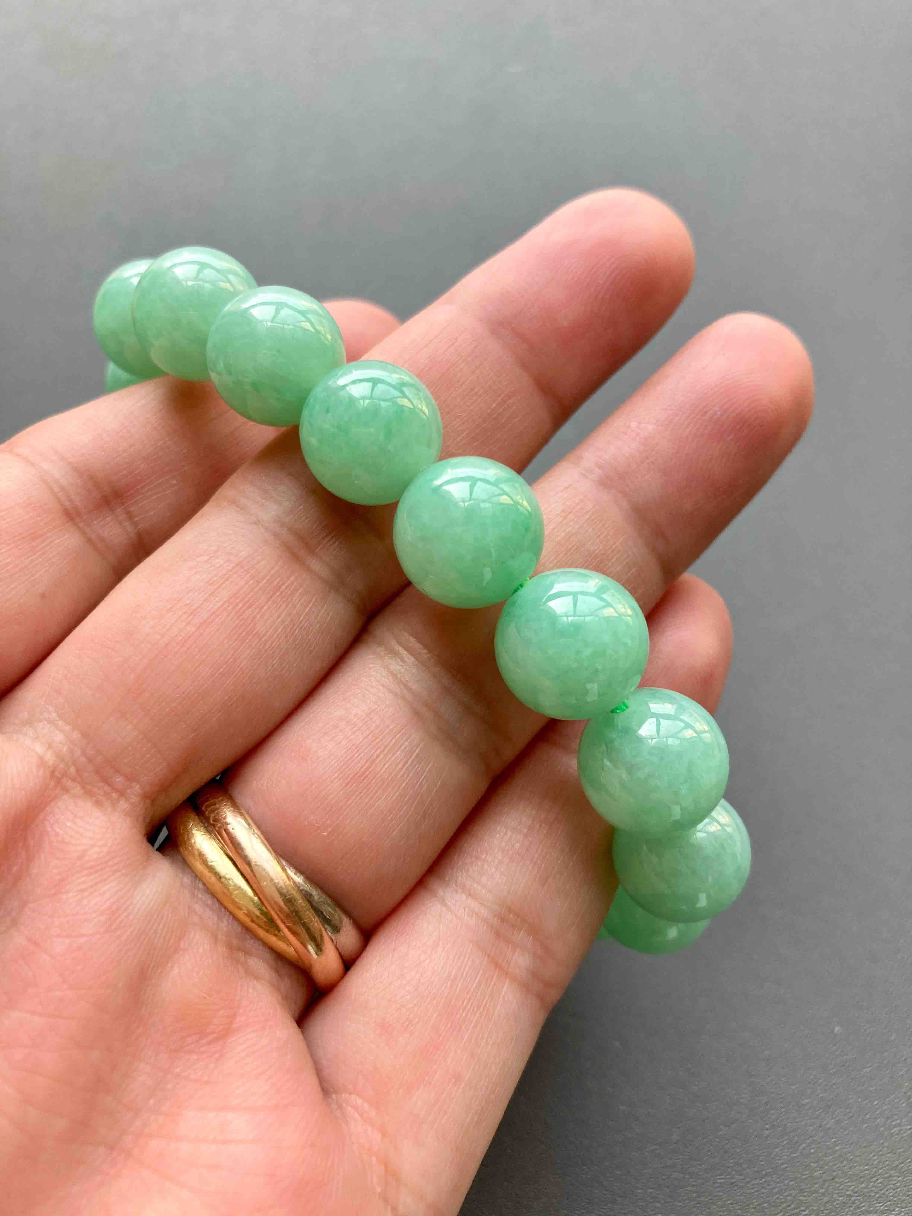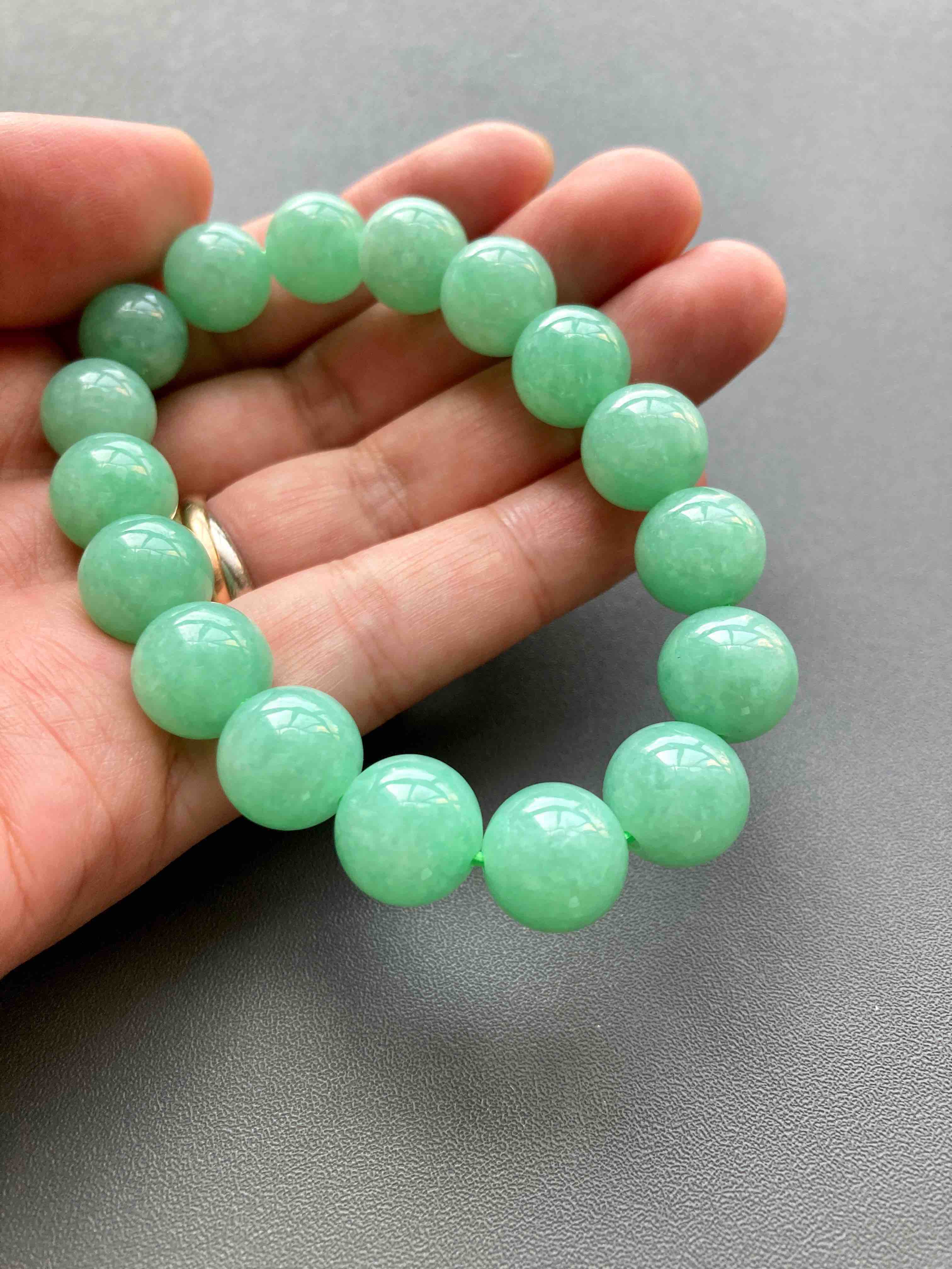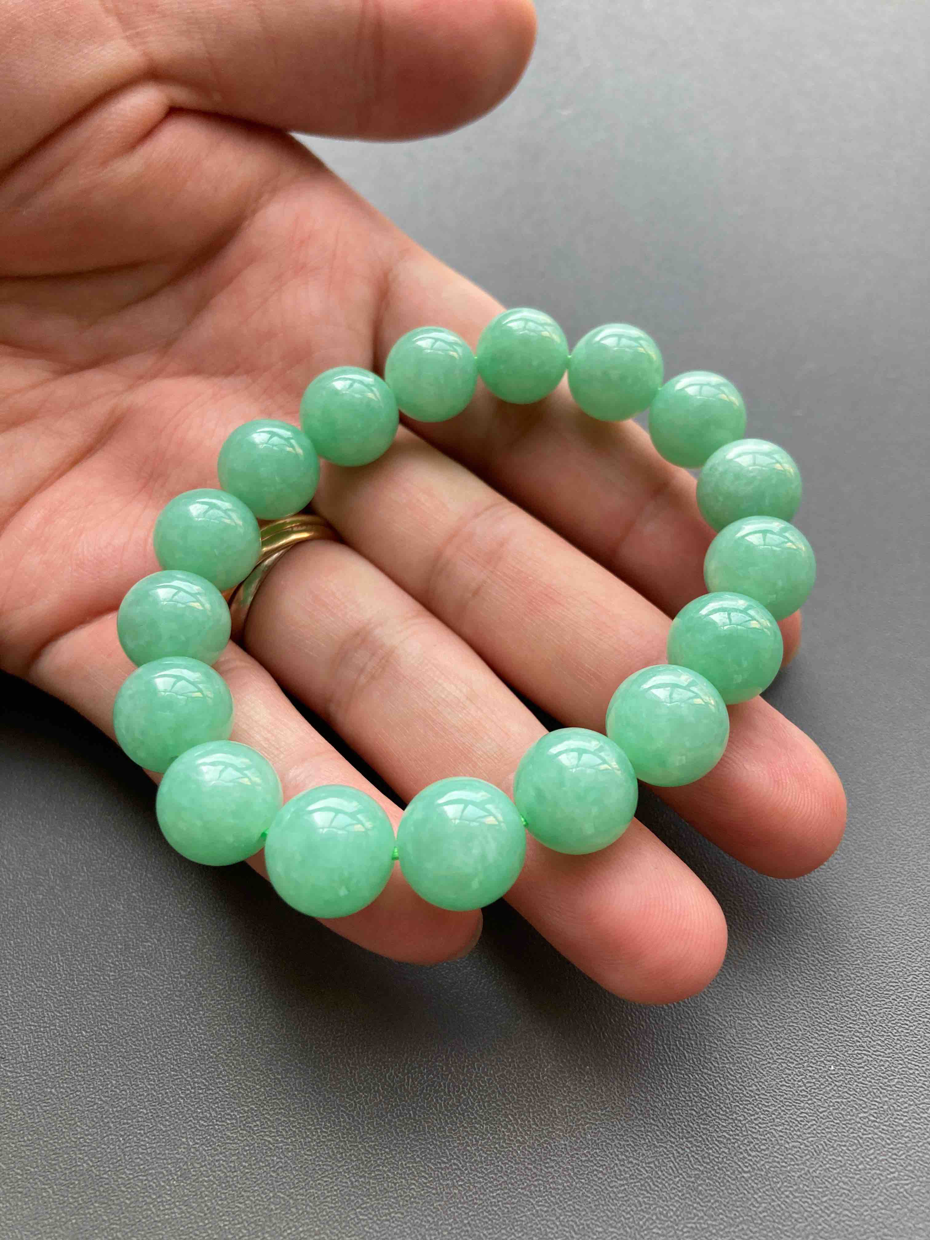苹果绿大珠串,难得有种有色的大珠子,珠子大小11.9mm,有17颗,颜色漂亮,上手特好看,这珠子尺寸太好了,唯一一串,强烈推荐