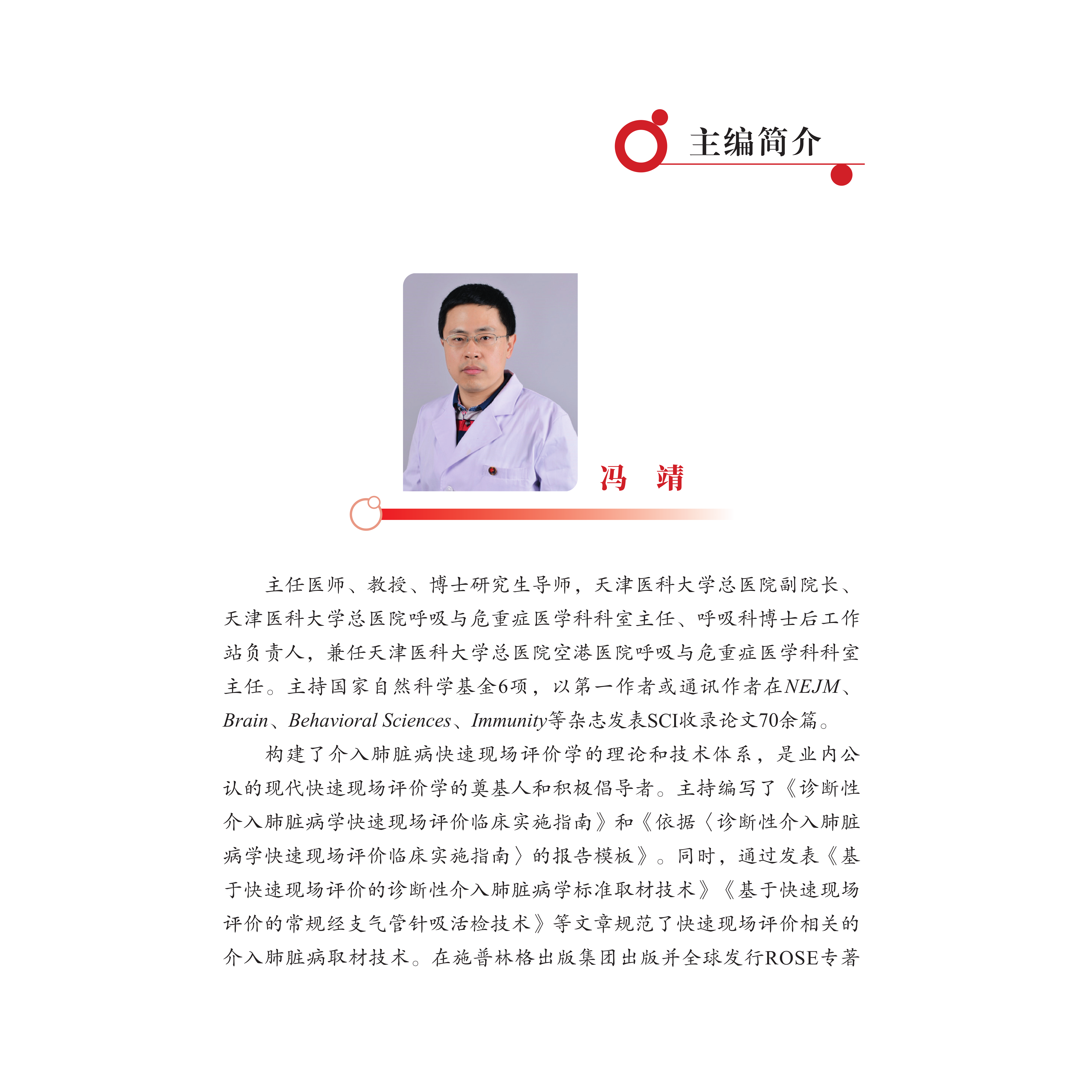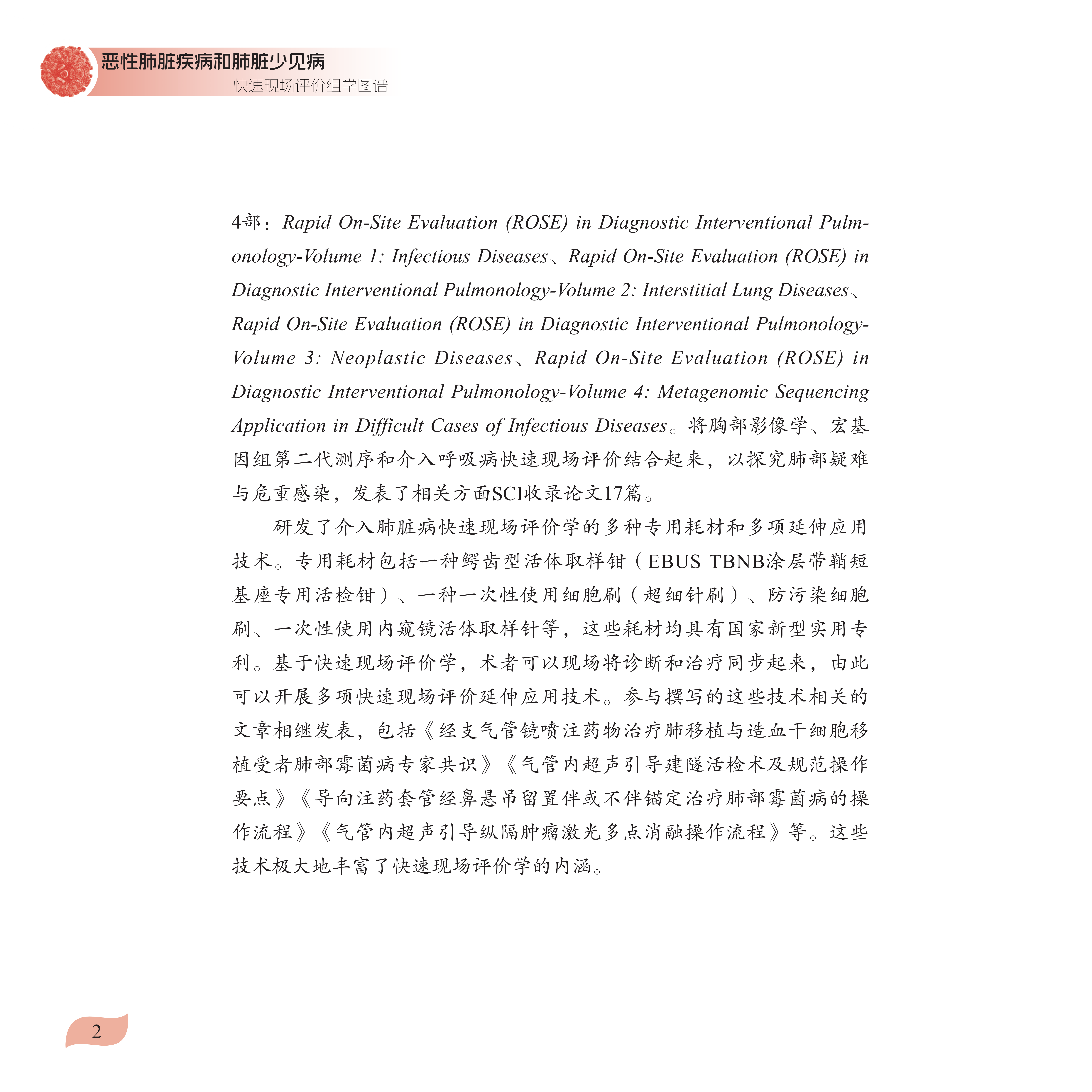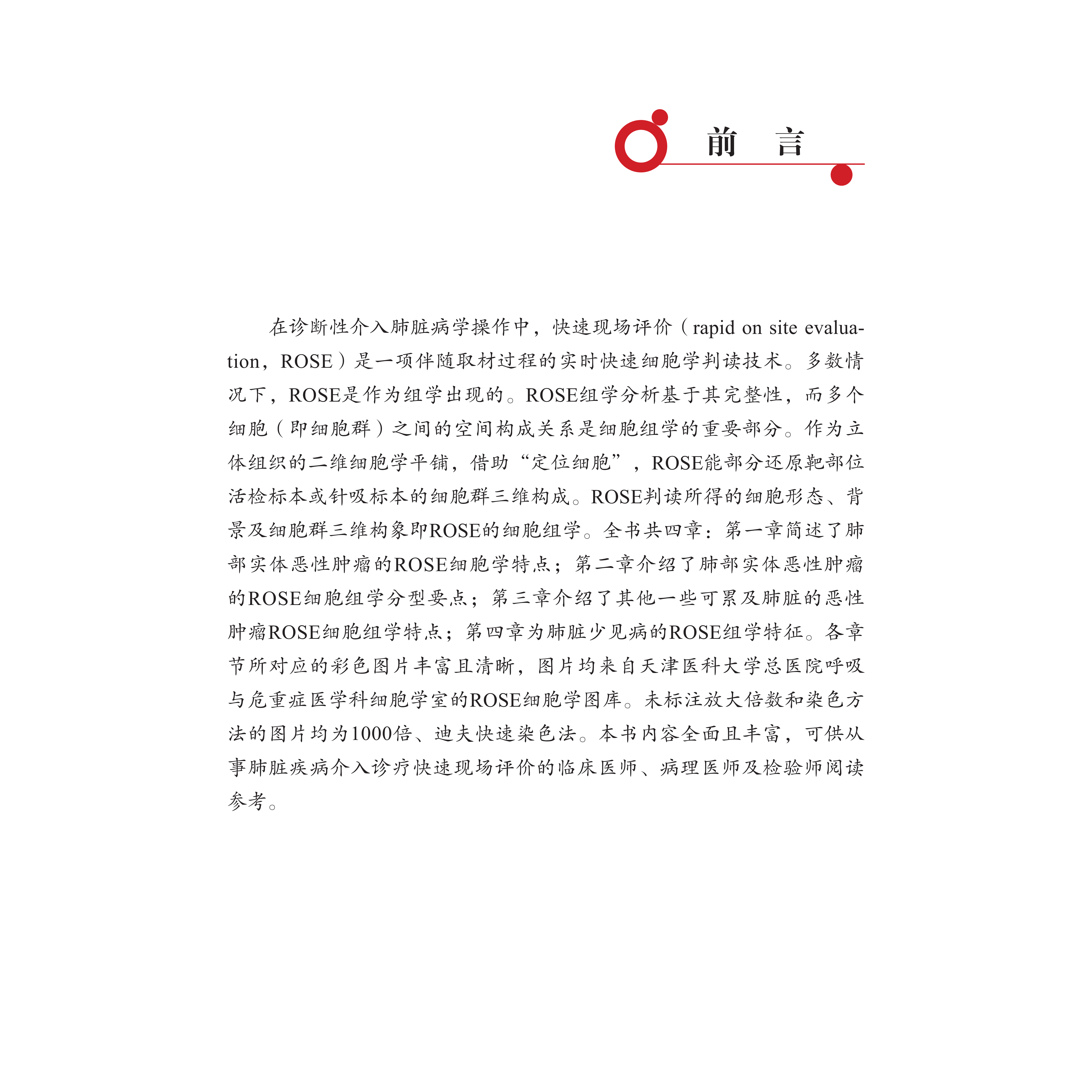 在诊断性介入肺脏病学操作中,快速现场评价(rapid on site evaluation,ROSE)是一项伴随取材过程的实时快速细胞学判读技术。多数情 况下,ROSE是作为组学出现的。ROSE组学分析基于其完整性,而多个 细胞(即细胞群)之间的空间构成关系是细胞组学的重要部分。作为立 体组织的二维细胞学平铺,借助“定位细胞”,ROSE能部分还原靶部位 活检标本或针吸标本的细胞群三维构成。ROSE判读所得的细胞形态、背 景及细胞群三维构象即ROSE的细胞组学。全书共四章:第一章简述了肺 部实体恶性肿瘤的ROSE细胞学特点;第二章介绍了肺部实体恶性肿瘤 的ROSE细胞组学分型要点;第三章介绍了其他一些可累及肺脏的恶性 肿瘤ROSE细胞组学特点;第四章为肺脏少见病的ROSE组学特征。各章 节所对应的彩色图片丰富且清晰,图片均来自天津医科大学总医院呼吸 与危重症医学科细胞学室的ROSE细胞学图库。未标注放大倍数和染色方 法的图片均为1000倍、迪夫快速染色法。本书内容全面且丰富,可供从 事肺脏疾病介入诊疗快速现场评价的临床医师、病理医师及检验师阅读参考。