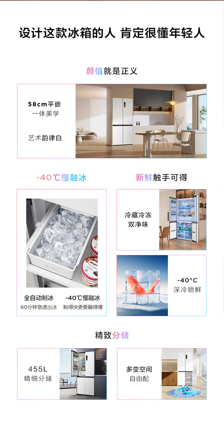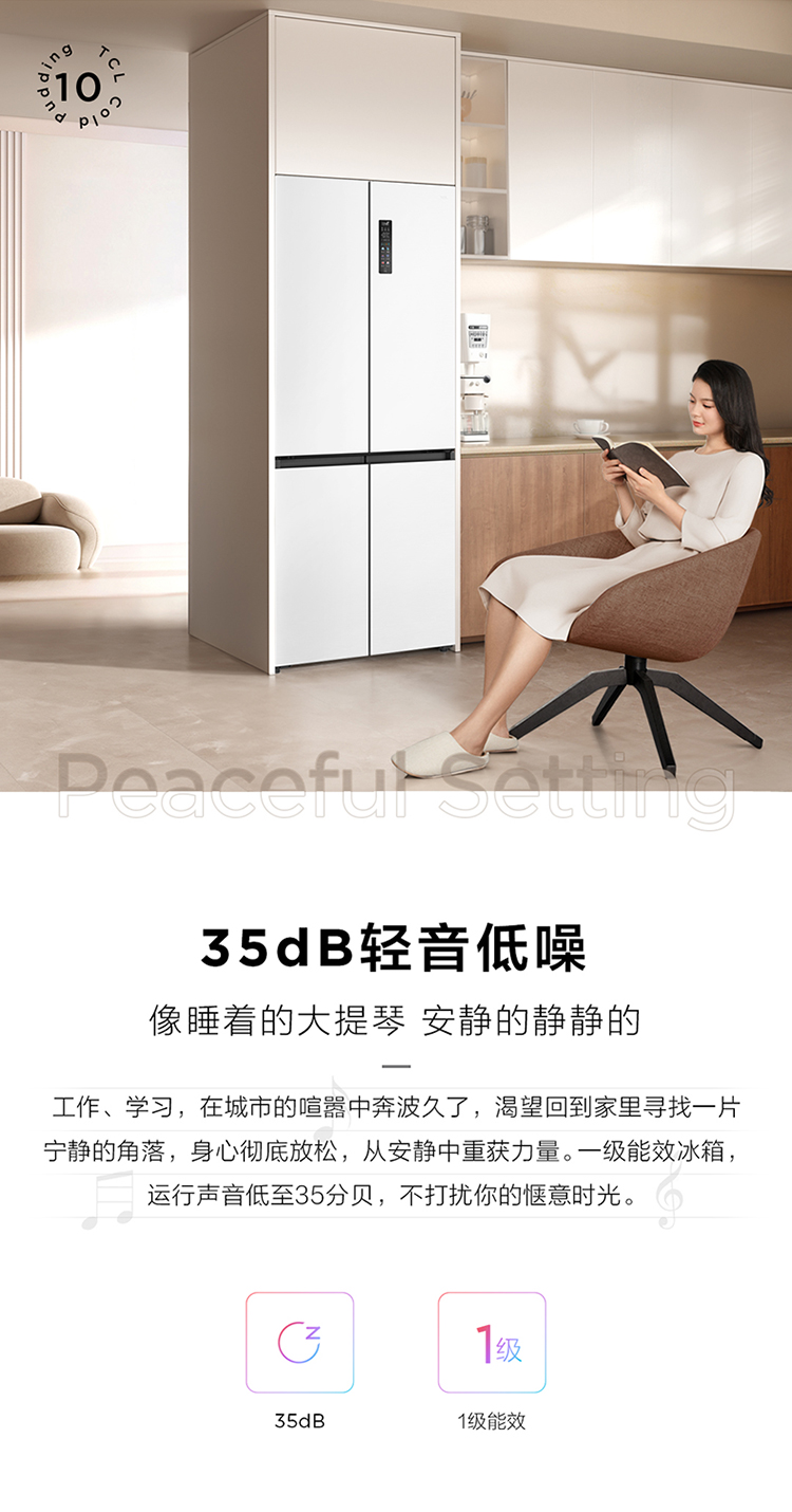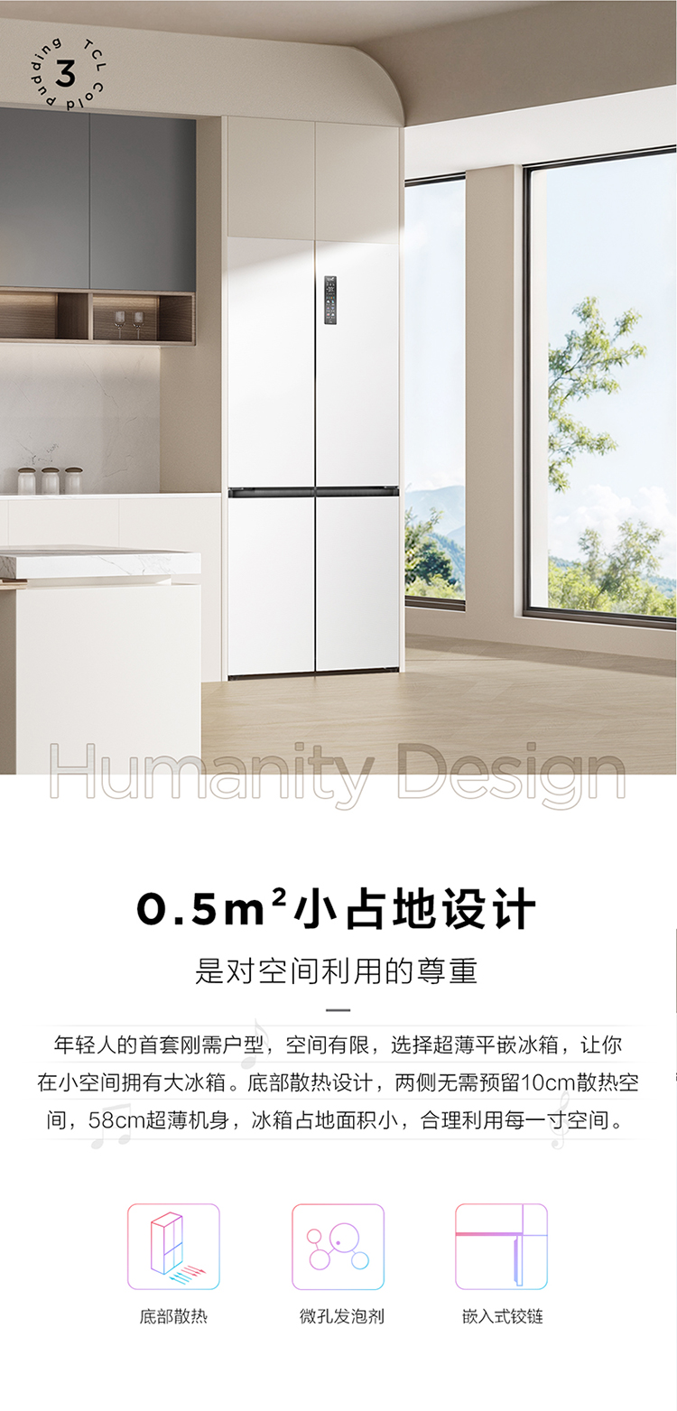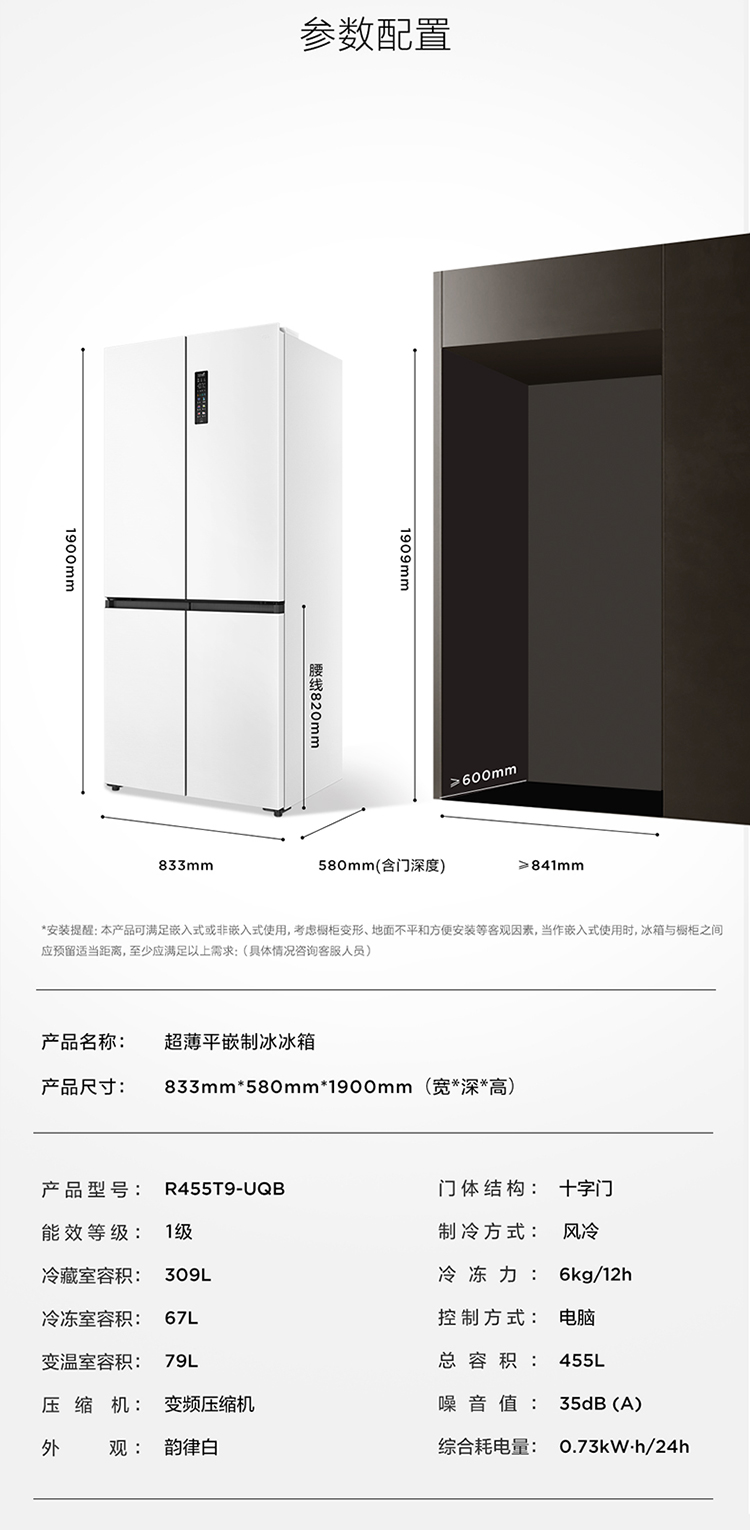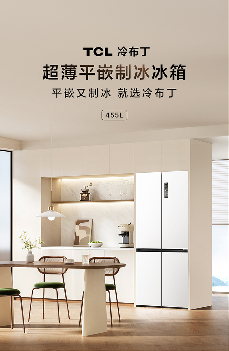 TCL冷布丁455升十字四开门58cm超薄零嵌全自动制冰-40度慢融冰冰箱R455T9-UQB