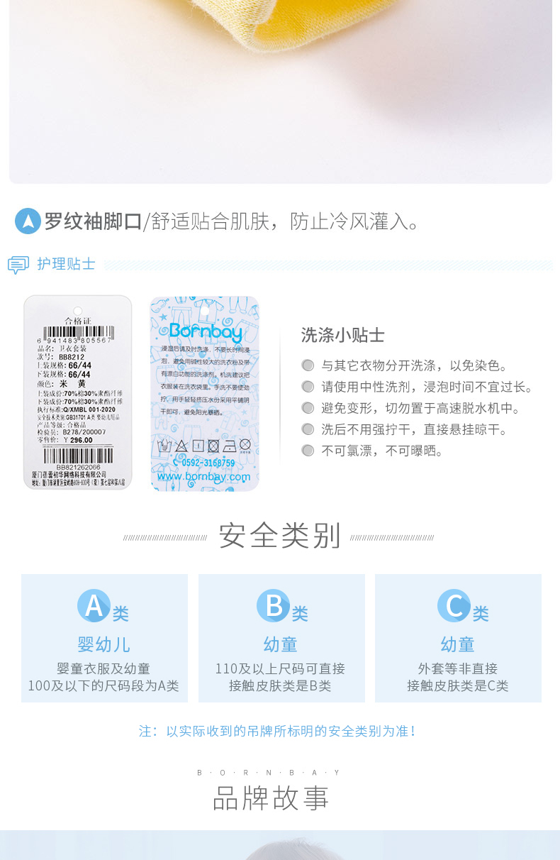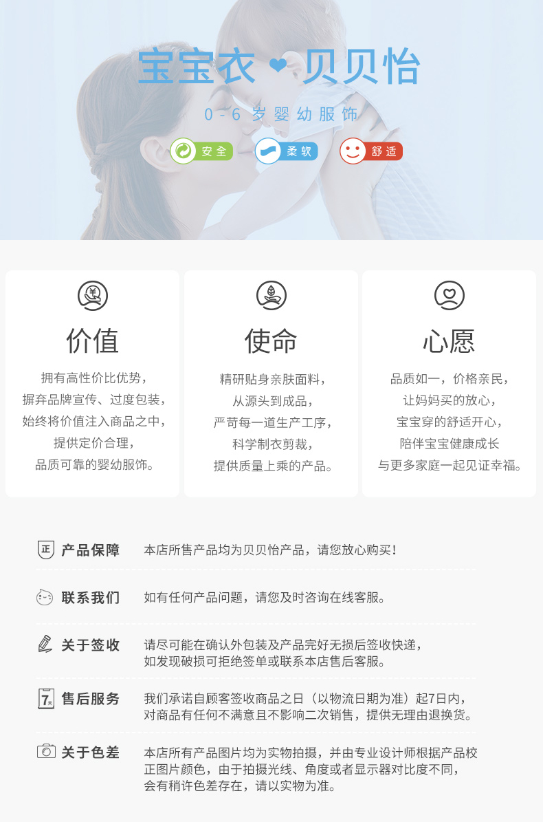 - 贝贝怡专注0-6岁婴幼儿服饰,坚持安全、柔软、舒适的产品理念,为千万中国家庭提供超高品质、安全可靠的婴幼儿服饰产品,妈妈放心,宝宝开心!