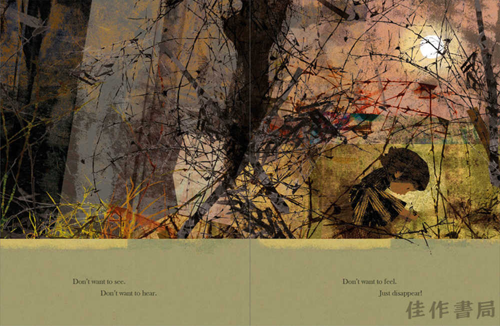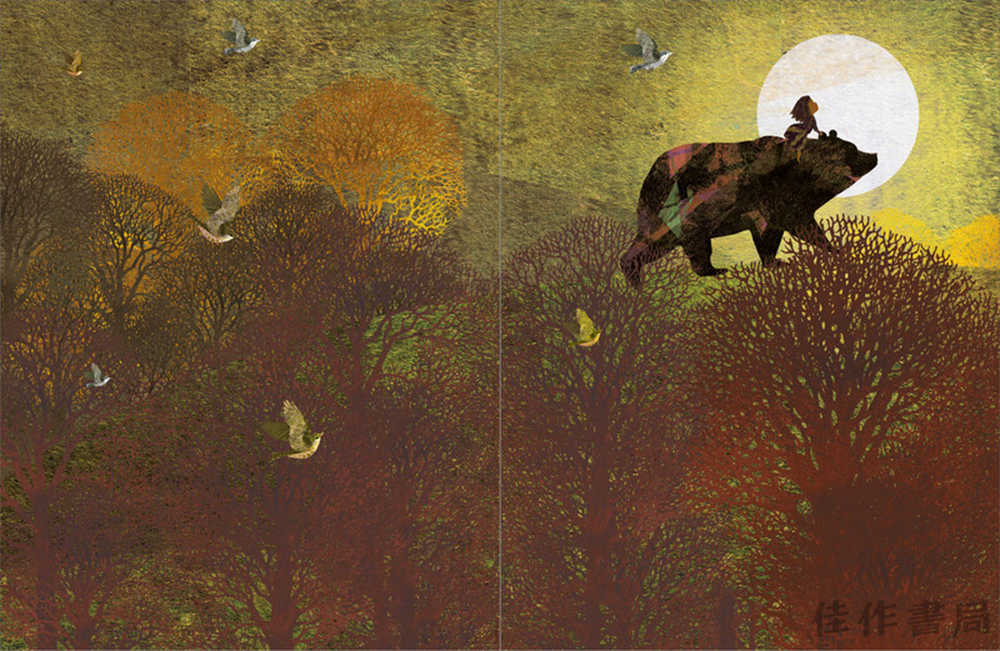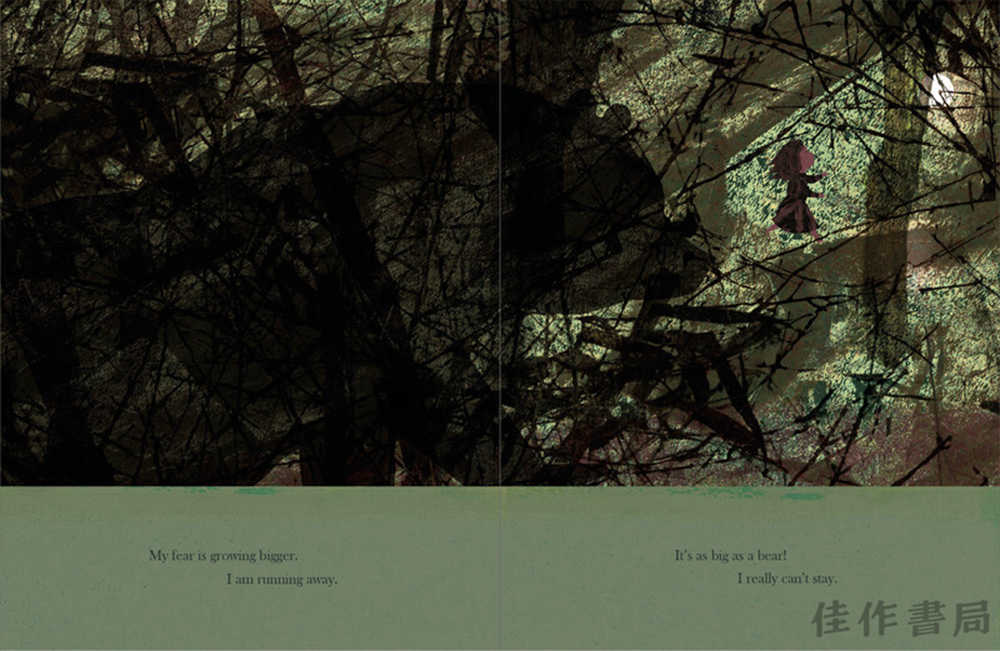 在《当我看到红色》中,布丽塔·特肯特鲁普(Britta Teckentrup)巧妙地表达了一个女孩的愤怒情绪。如今,作者以同样的智慧和敏感度,探讨了勇敢的含义。这本书充满了引人遐想的拼贴画插图和动态排版的文字,讲述了一个孩子在森林中漫步时,被一只熊吓了一跳的故事。起初,这只熊令人恐惧——它体型庞大且未知。但随着女孩在森林中前行,她成了熊的伙伴,而当他们走到森林尽头时,她已成为了熊的朋友。