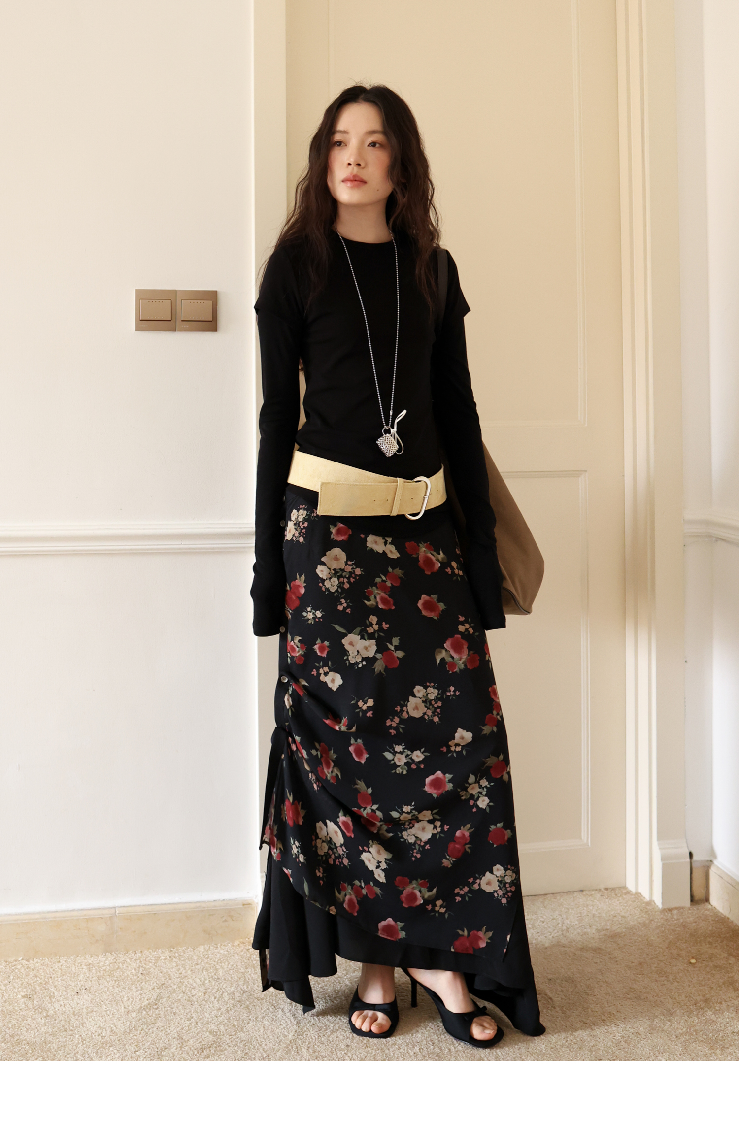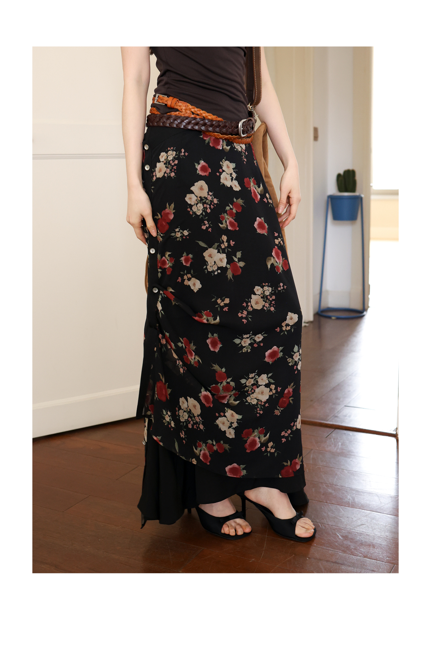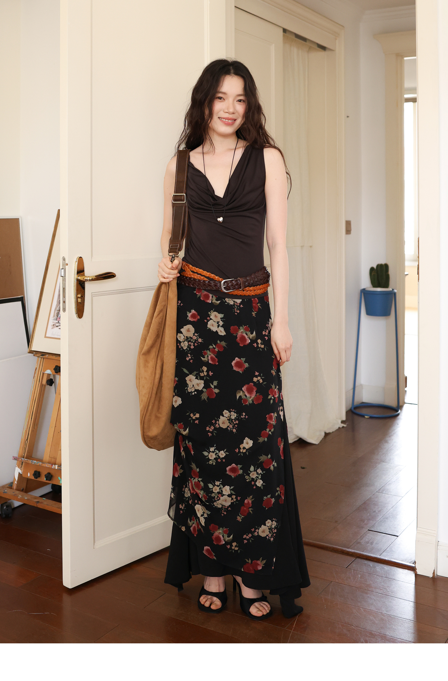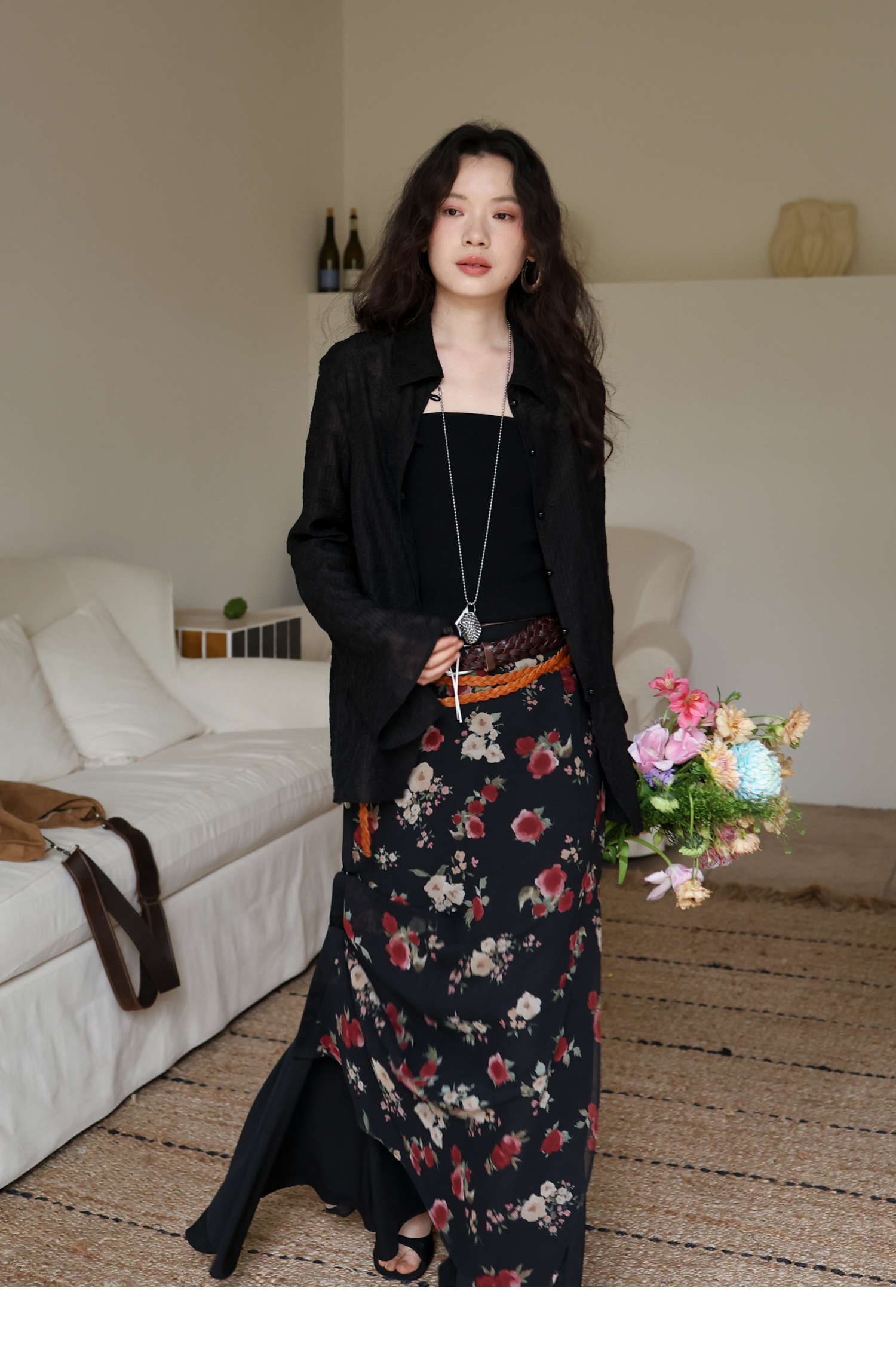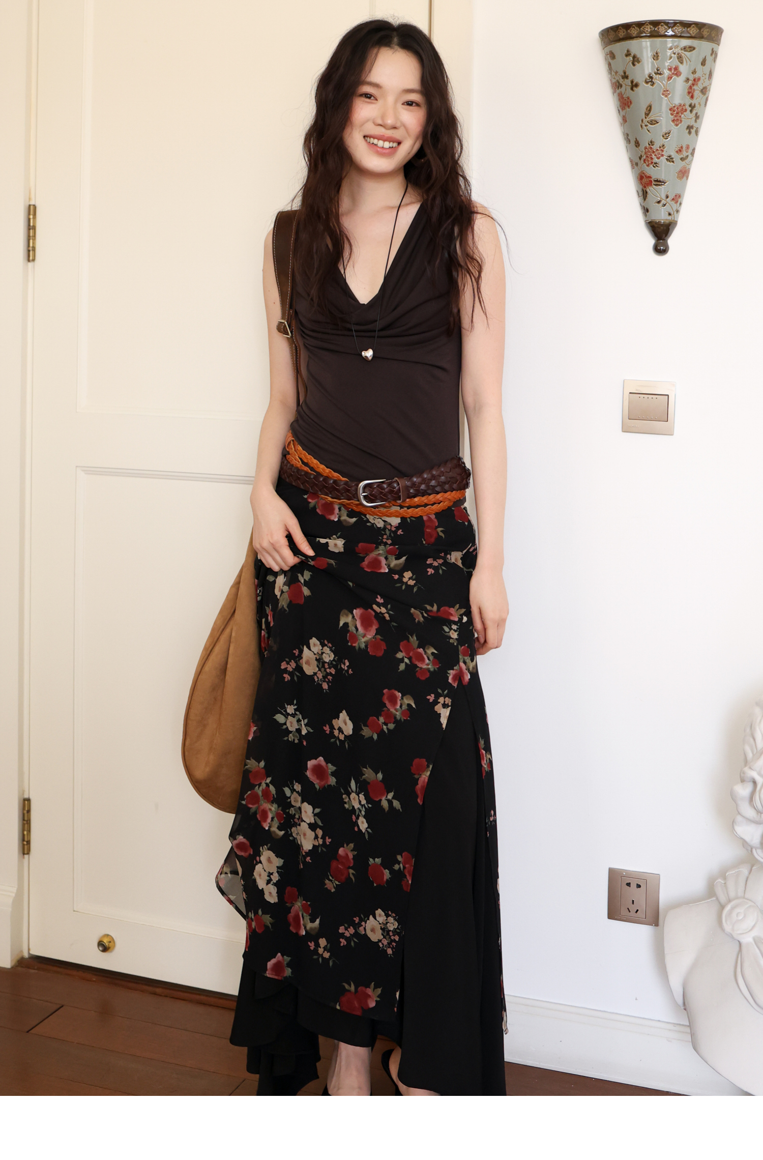 素舶 透气雪纺轻盈垂感玫瑰印花褶皱大裙摆长半裙SUPERSCAPE