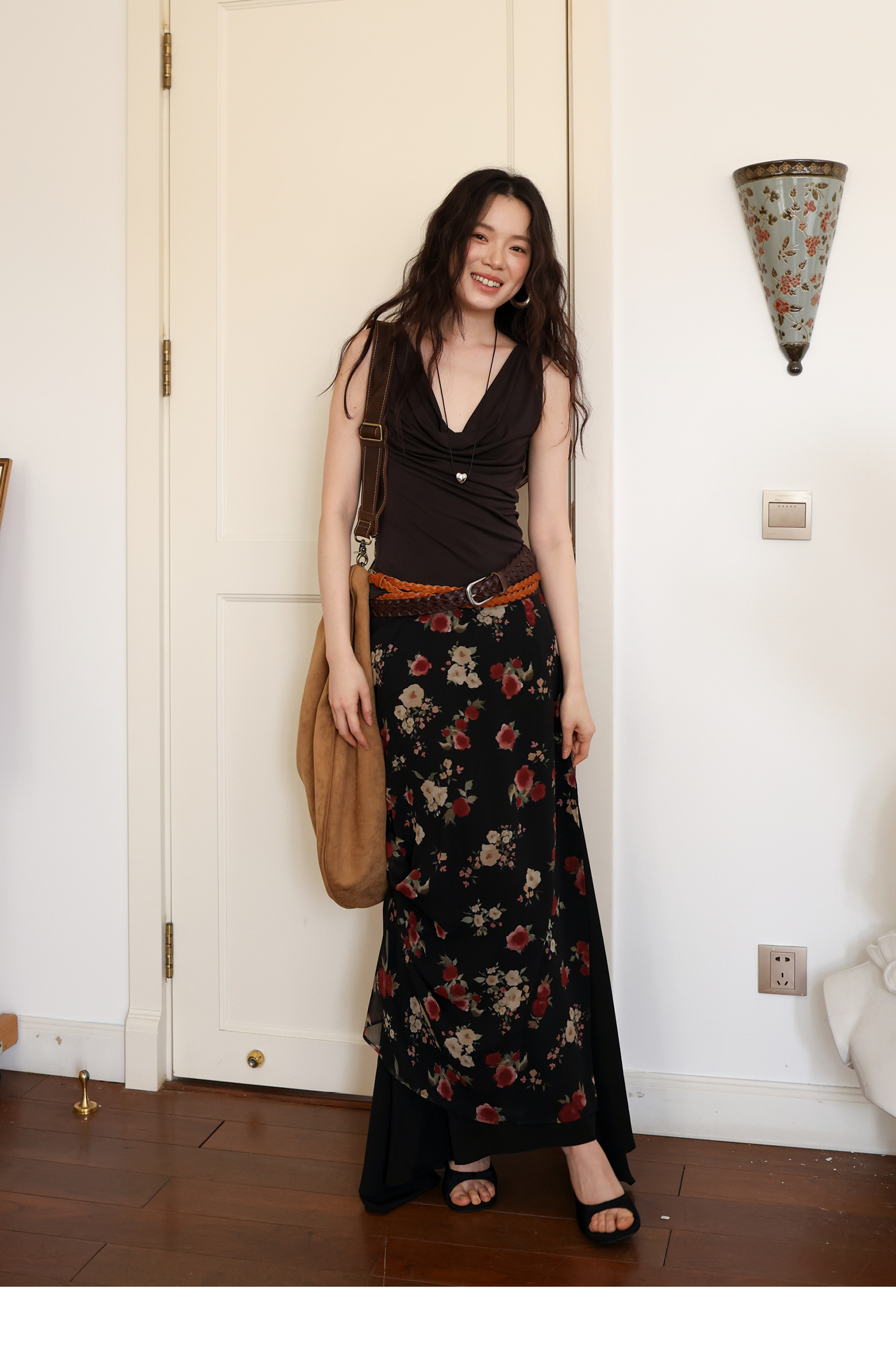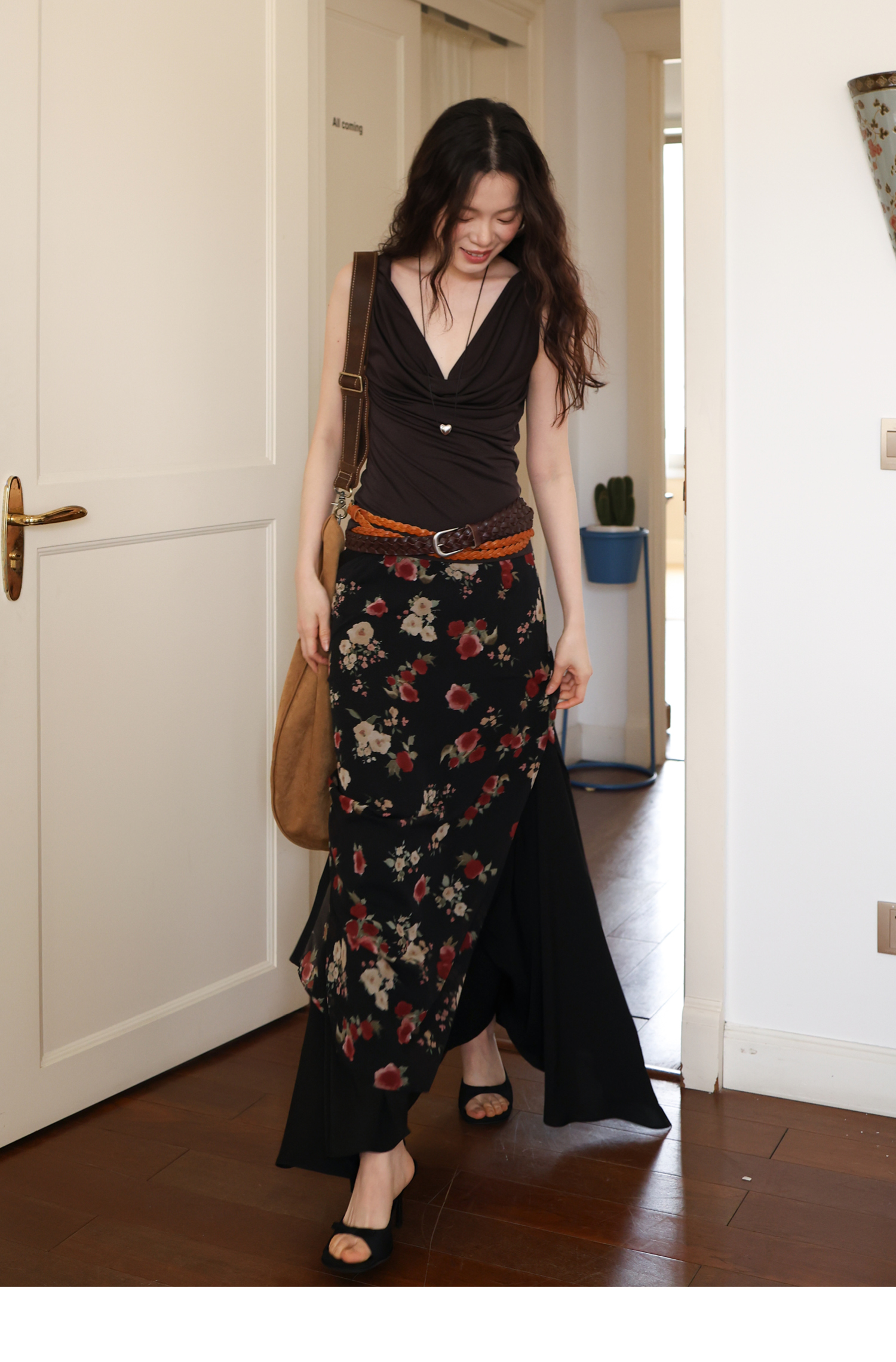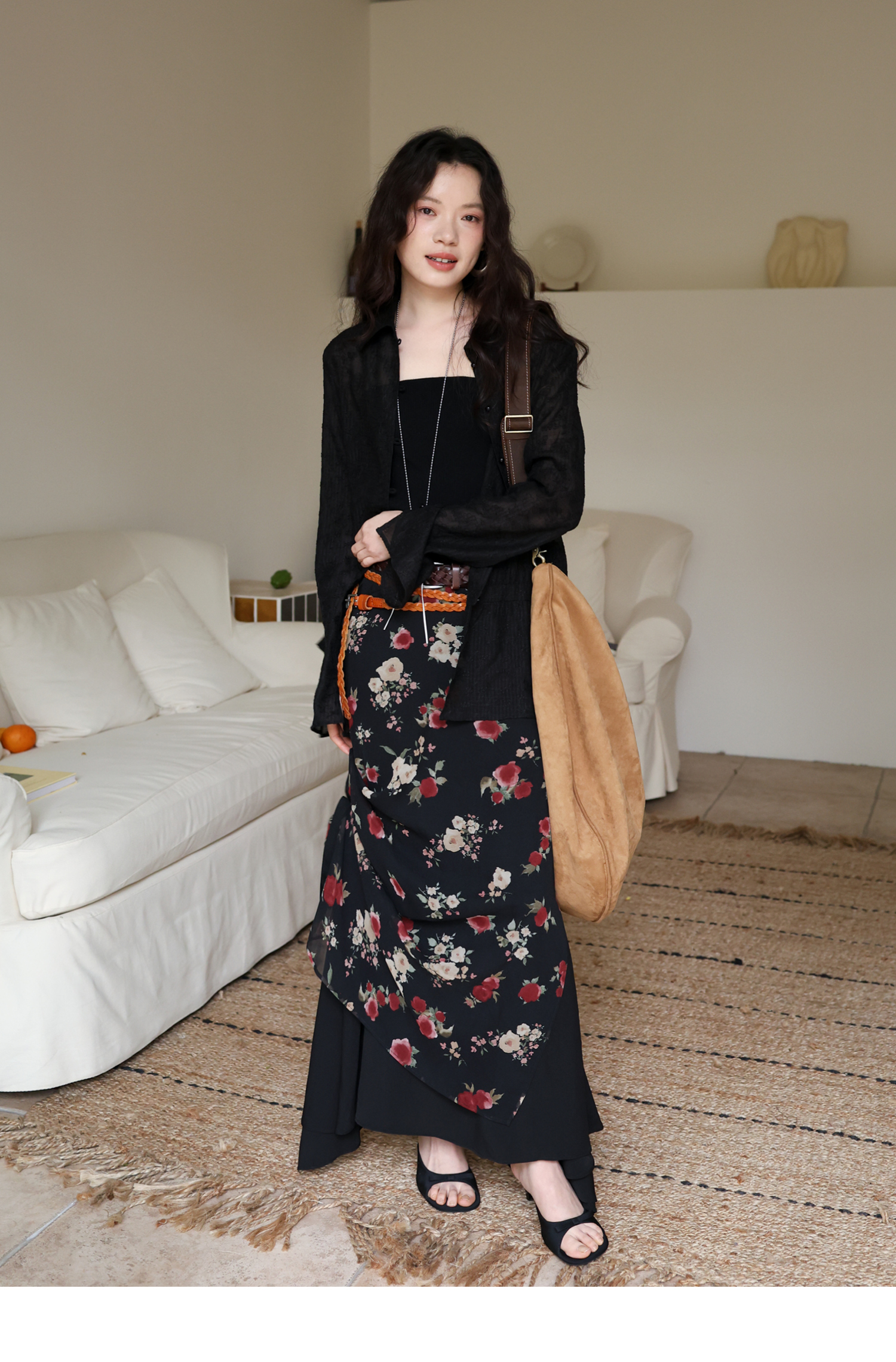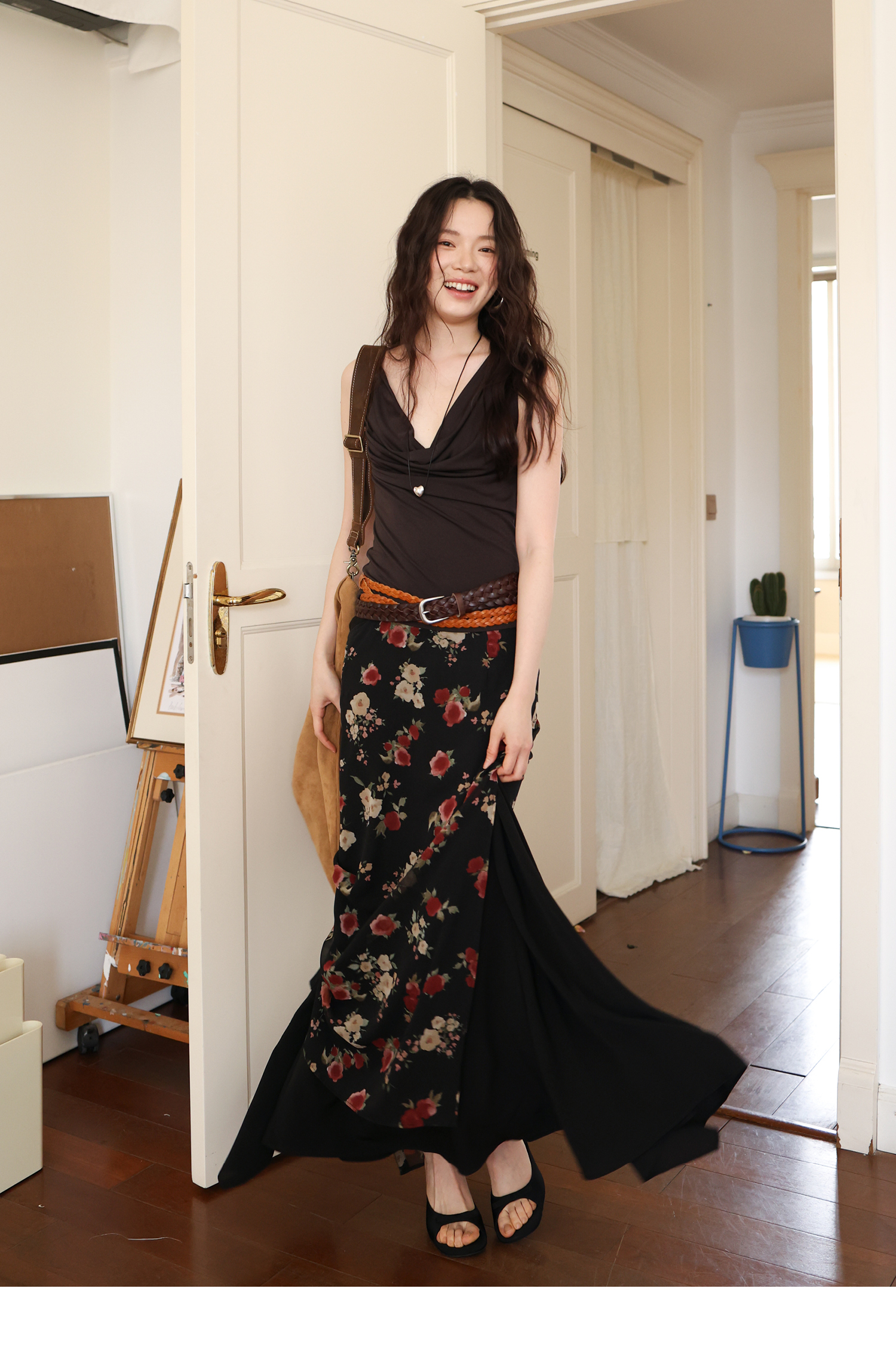 素舶 透气雪纺轻盈垂感玫瑰印花褶皱大裙摆长半裙SUPERSCAPE