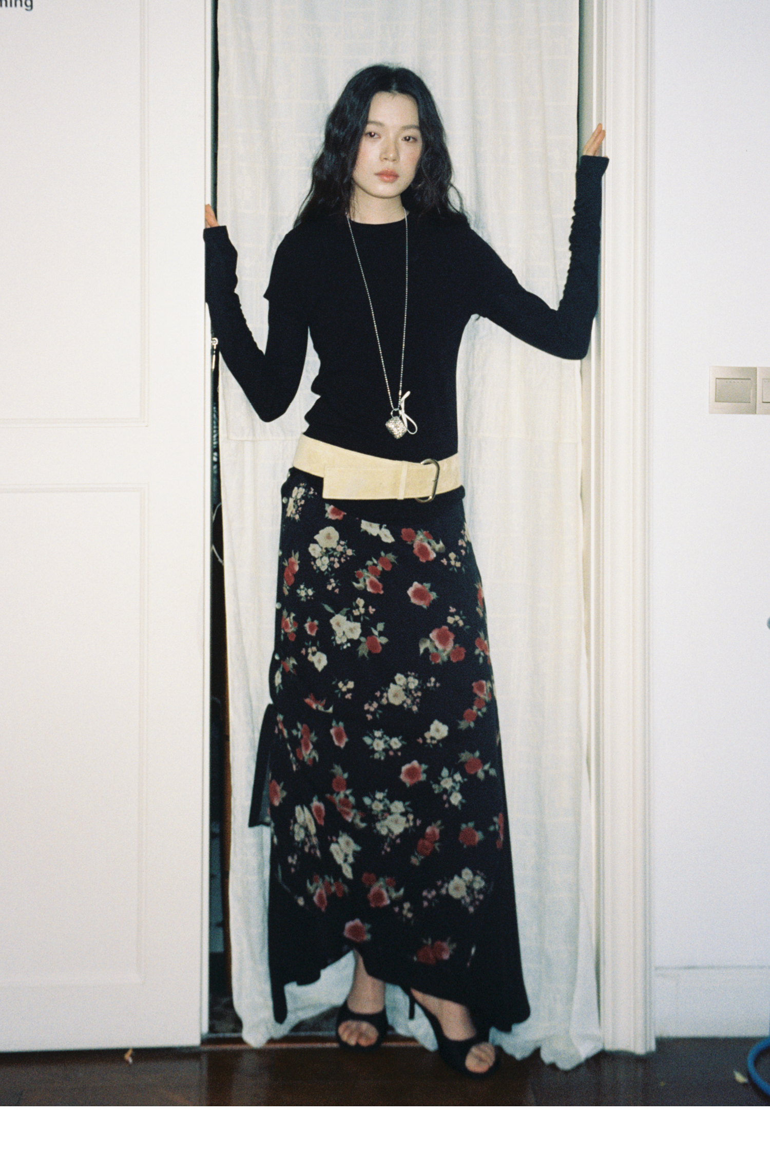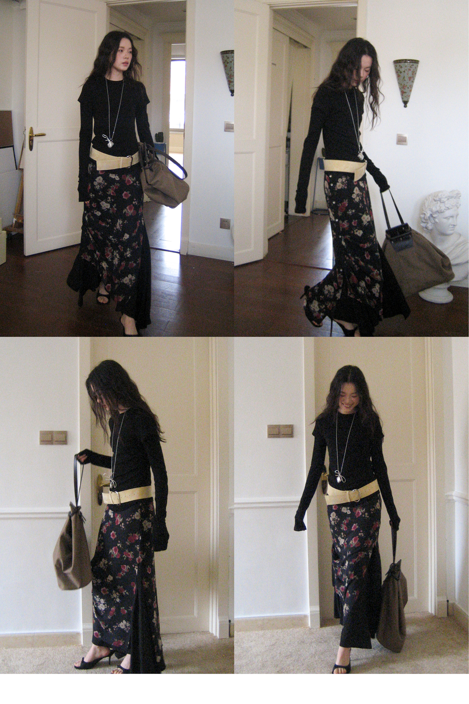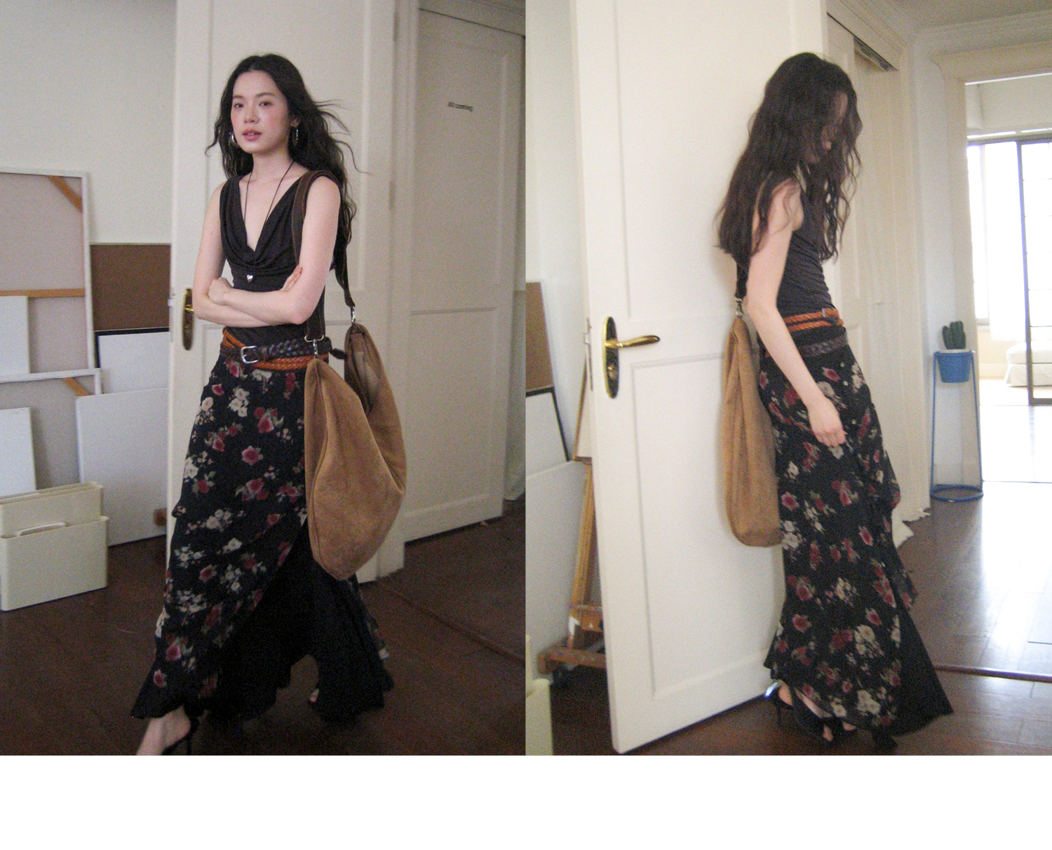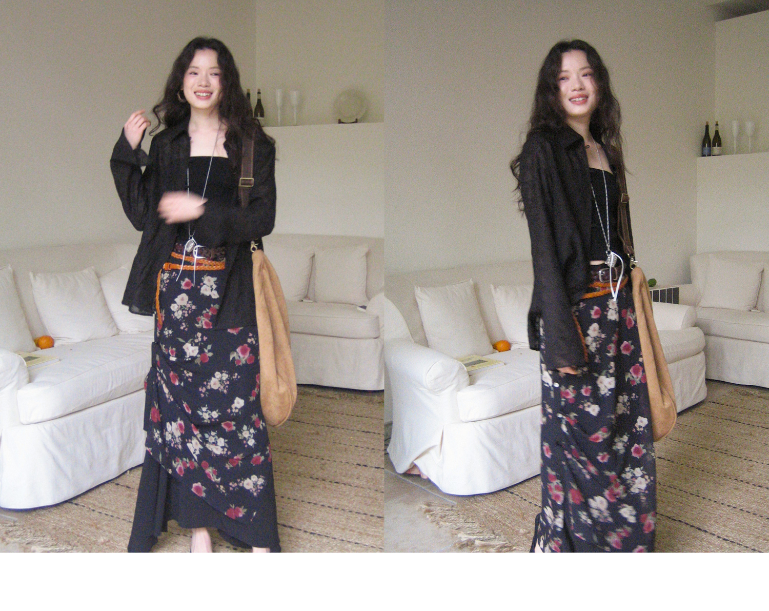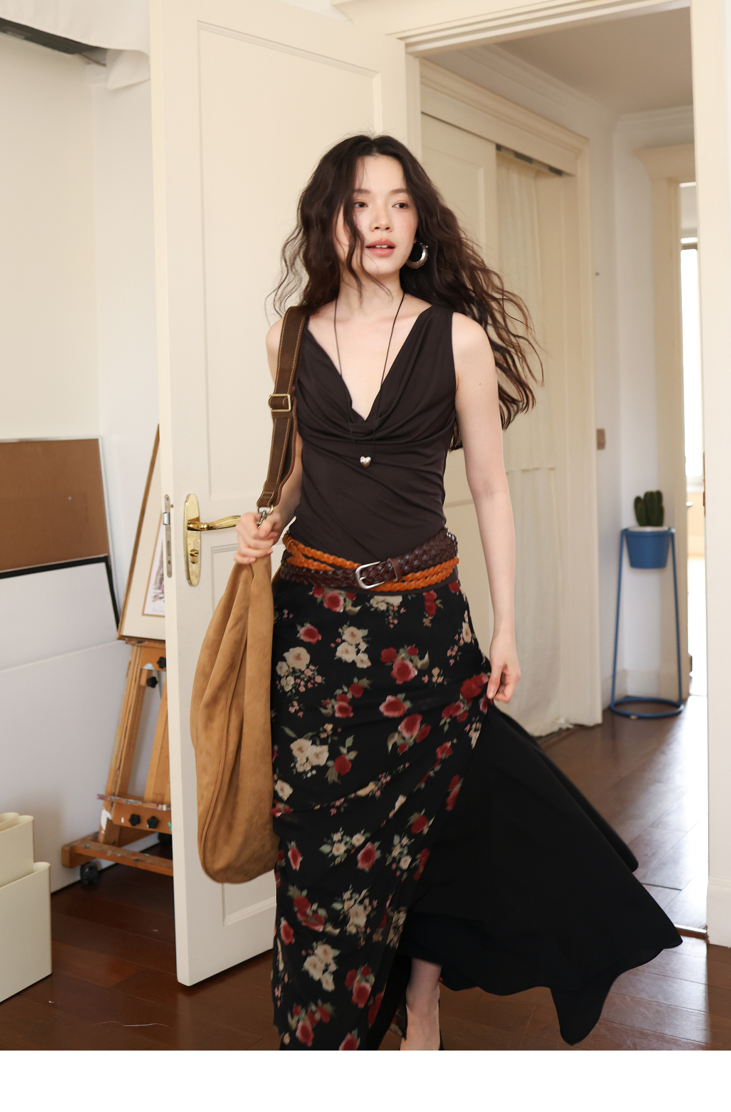 素舶 透气雪纺轻盈垂感玫瑰印花褶皱大裙摆长半裙SUPERSCAPE
