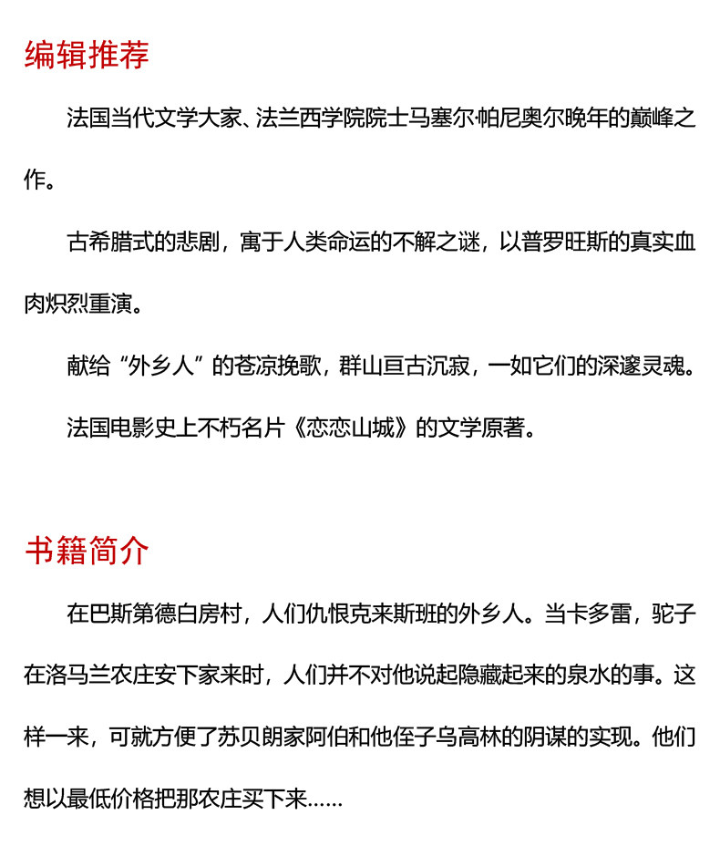 山泉 让·弗洛莱特 独角兽文库 法国不朽名片《恋恋山城》文学原著 马塞尔·帕尼奥尔晚年力作