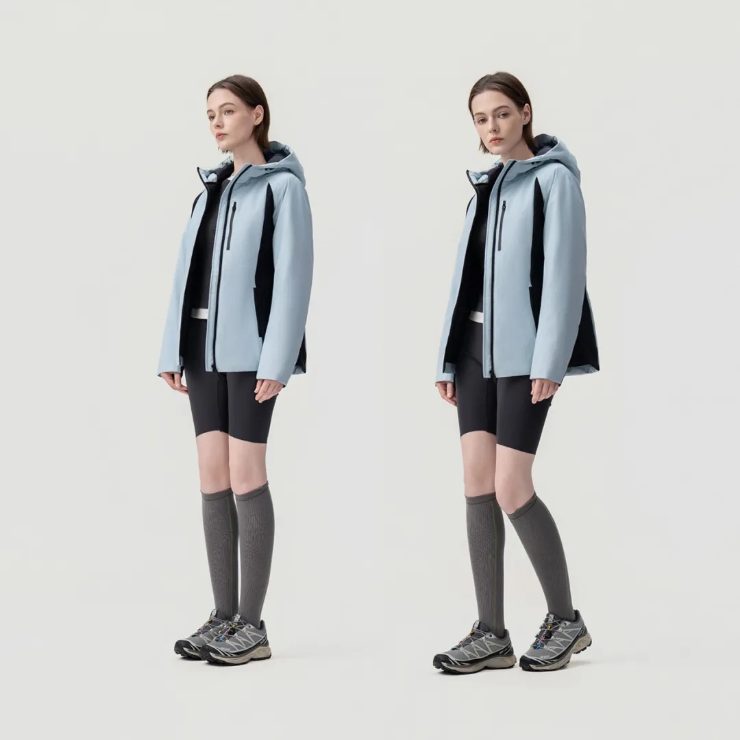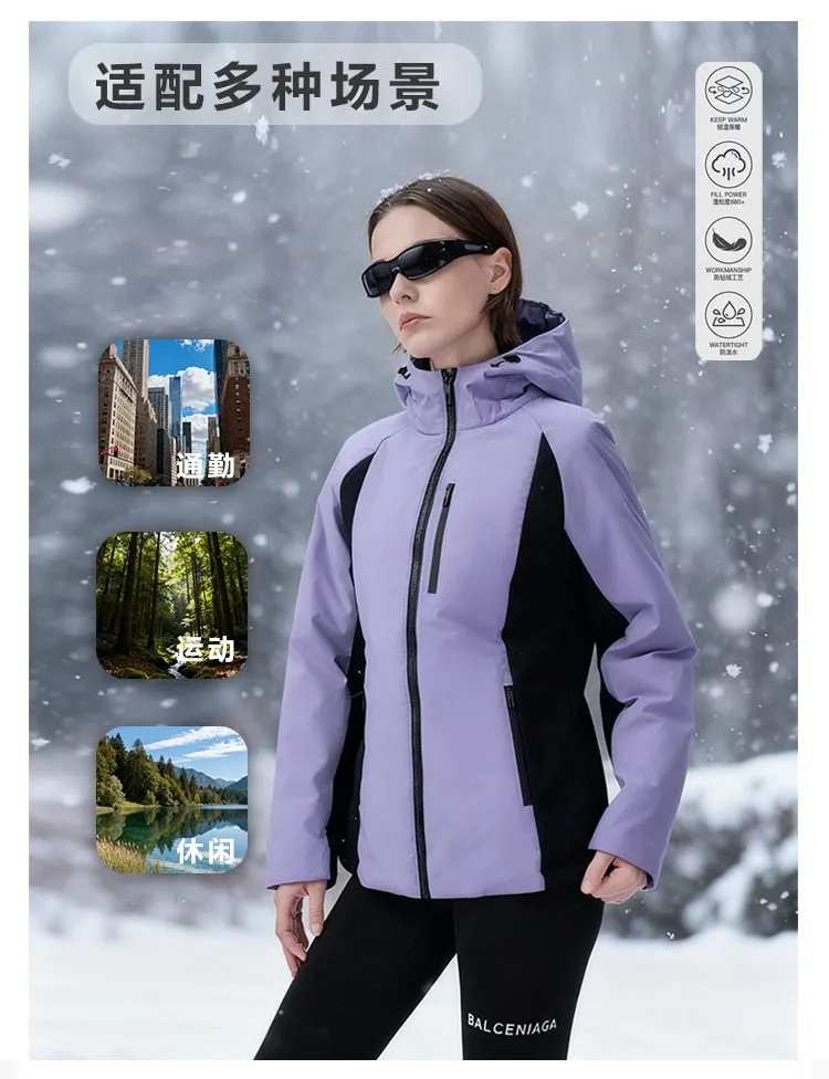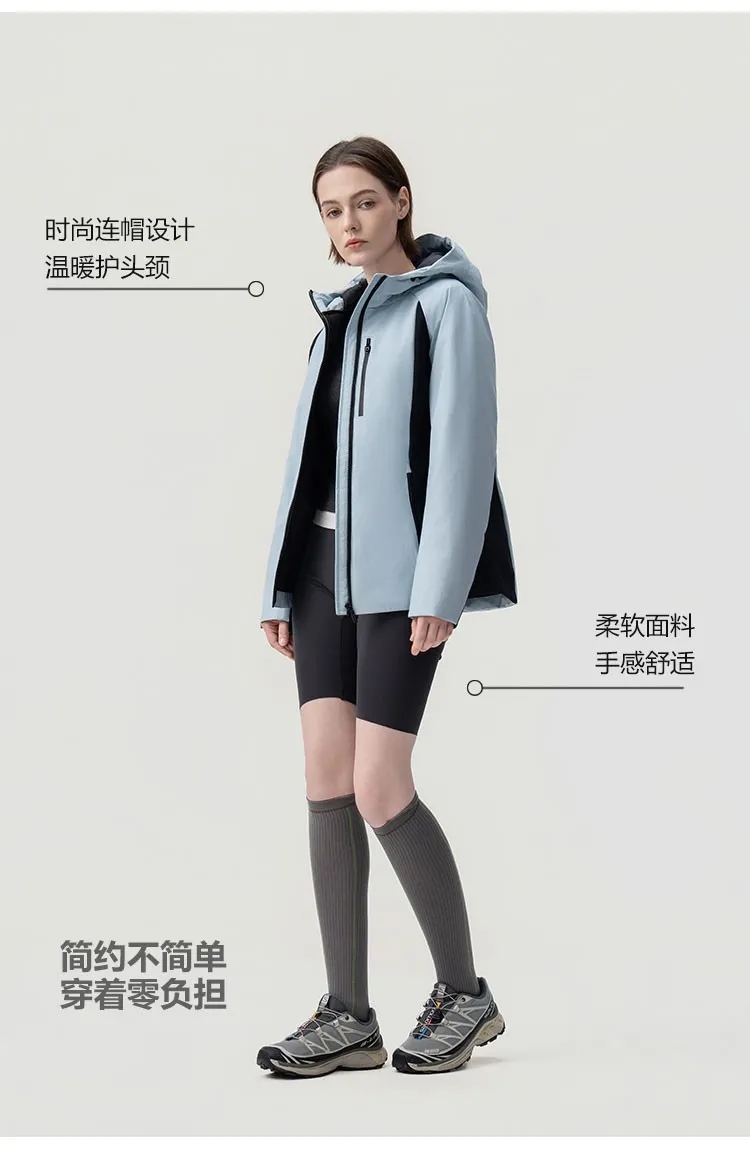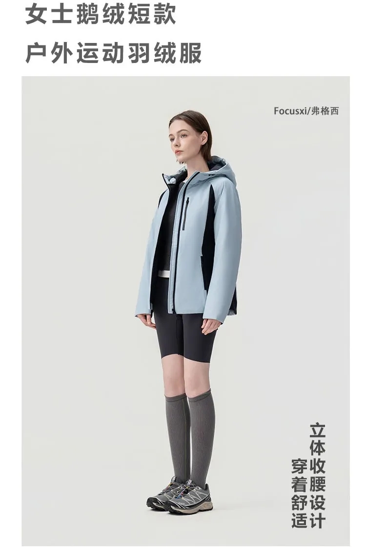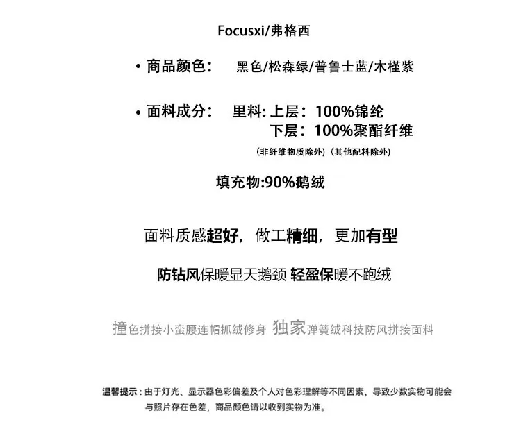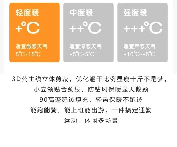 卖点:轻系90鹅绒撞色拼接小蛮腰连帽抓绒修身,弹簧绒科技防风拼接面料(弹到飞起)活动自由100,3D公主线立体剪裁,优化躯干比例显瘦十斤不是梦。小立领贴合颈线,防钻风保暖显天鹅颈,90高蓬鹅绒填充,轻盈保暖不跑绒。能跑能骑,能上班能出游,一件搞定通勤,运动,休闲多场景