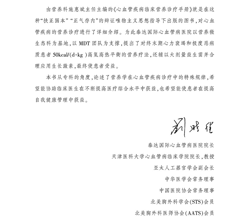 内容全面丰富。以心血管疾病营养代谢特点为基础,从专科角度论述了营养学在心血管疾病诊疗中的特殊规律,有助于临床医生提高医疗综合水平。