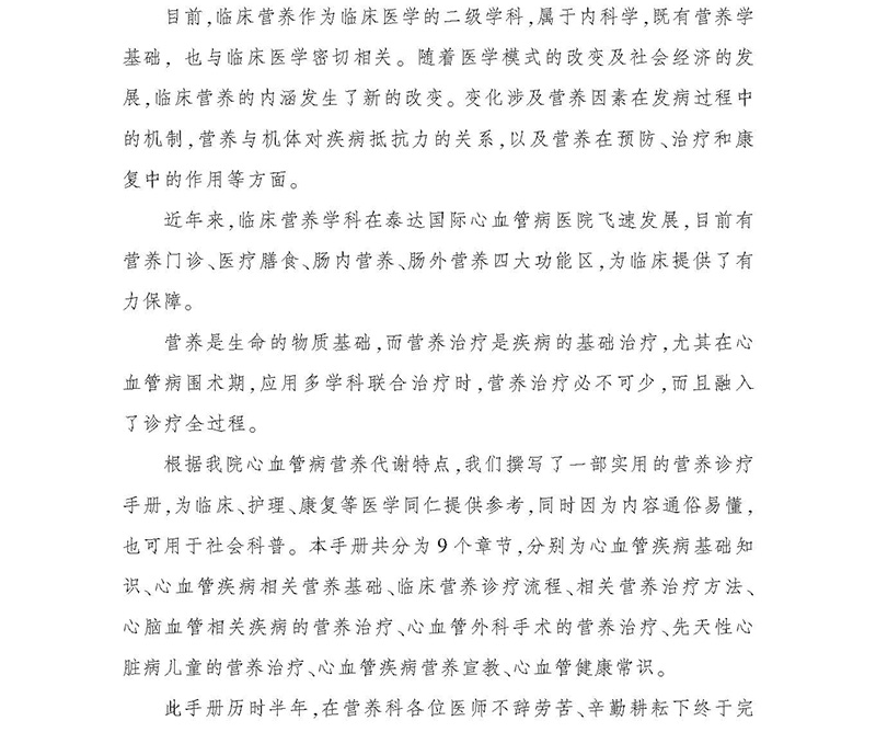 营养是各种治疗的基础。全书根据心血管疾病营养代谢特点,详细阐述了营养学理论知识及营养学在心血管疾病的预防、治疗、护理、康复及围术期等方面的实际应用,具体分析了营养学在心血管疾病诊疗全过程中的重要作用,可为临床、护理、康复等医护人员提供参考。