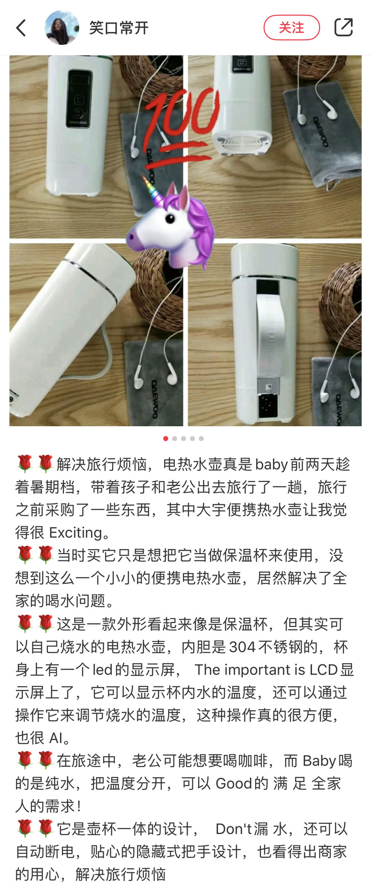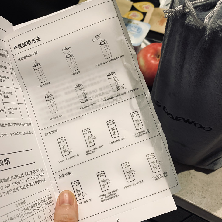 因为在家一直都用养生壶烧水,都快忘记普通热水壶的缺点了:烧水慢,一大壶水烧完,要是忘了装,不一会就凉了,重烧又得等很长时间。但是用大宇这款便携电热水壶就很方便了,它跟保温杯差不多大小,5分钟就能烧开一壶开水,还能在40℃-80℃(5℃一档)之间保温,真的可以说是秋冬出门必备了,行李箱、背包都能轻松塞下,占不了多大空间。而且密封性很好,不用担心放在包里或箱子里会漏水,经常要出差旅行的人,一定要入啊!