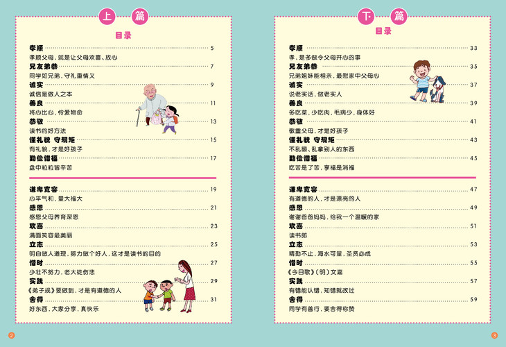 《〈弟子规〉教学读本》依据儿童年龄特点和认知能力,每册均围绕十三个和生活密切相关的主题:孝顺、兄友弟恭、诚实善良、恭敬、懂礼貌守规矩、勤俭惜福、谦卑宽容、感恩、欢喜、立志、惜时、实践,依次第引导儿童在生活中演示和实践,帮助儿童学会日常生活中应对进退应有的礼节,学会如何待人接物,养成基本的品德修养。