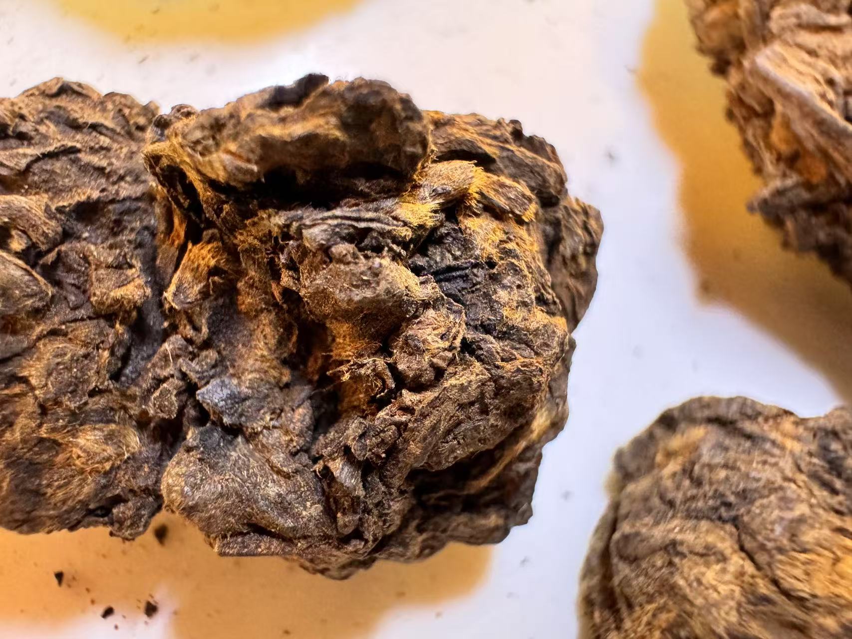 普洱茶在渥堆发酵时,会稀释出大量果胶,部分茶叶会凝聚成块。这样的茶块被称为”老茶头”,此类茶汤感饱满、醇厚、极耐泡、汤色明亮、香气更浓郁。