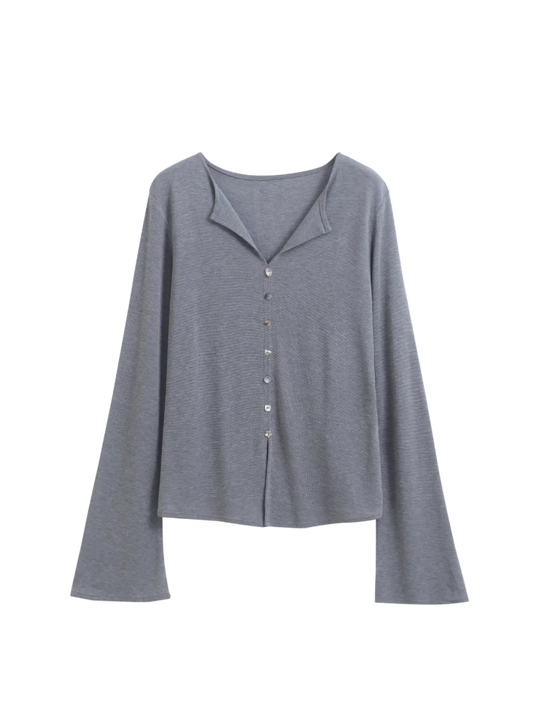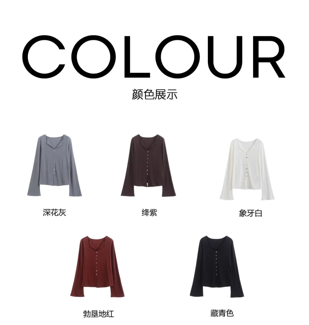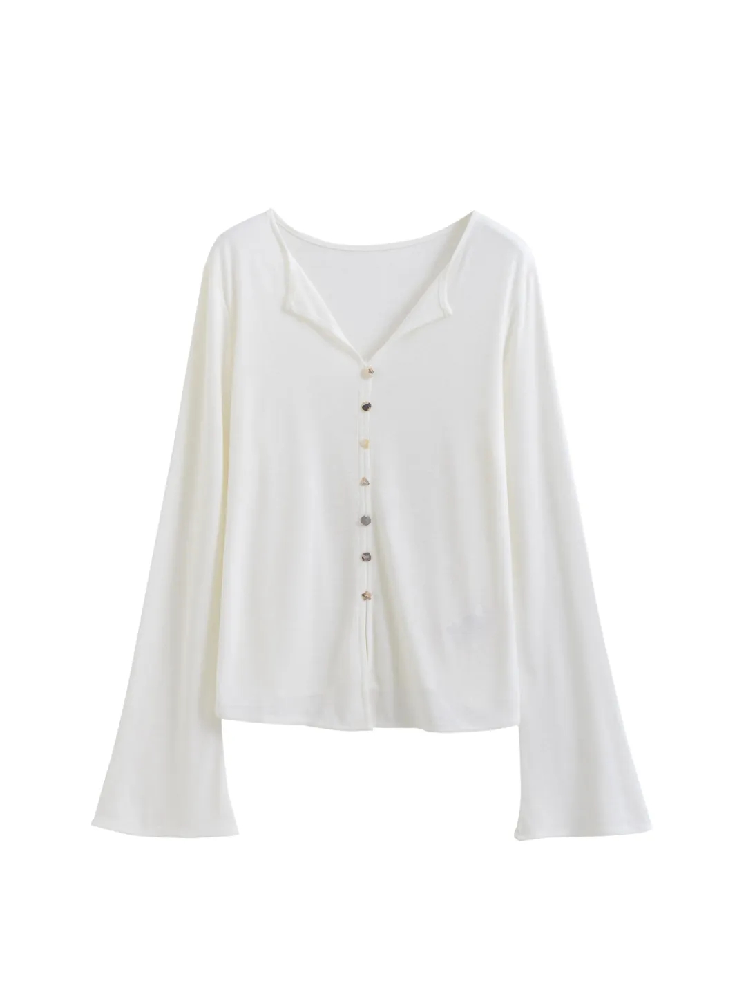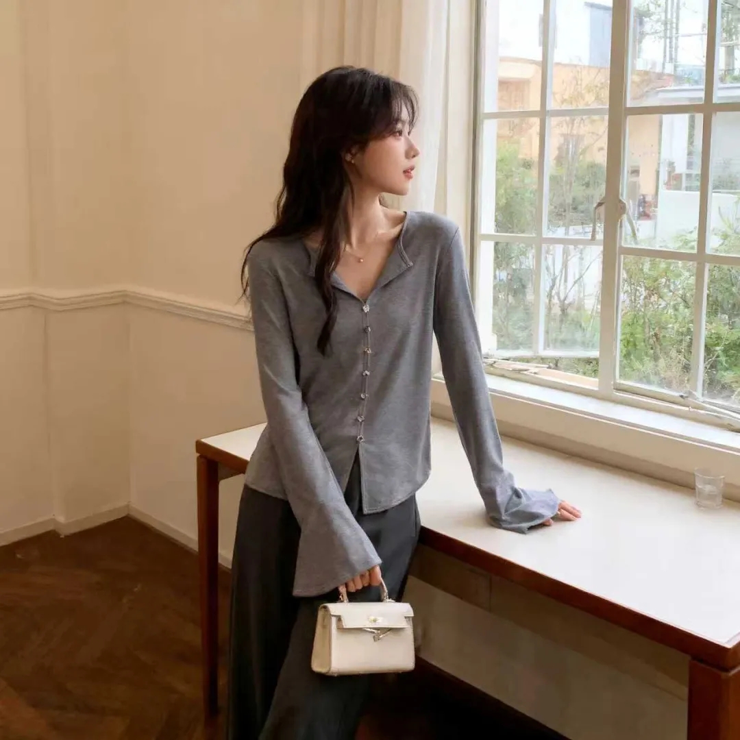 F030607慢氧时光天丝醋酸羊毛贝壳修身V领喇叭袖打底衫