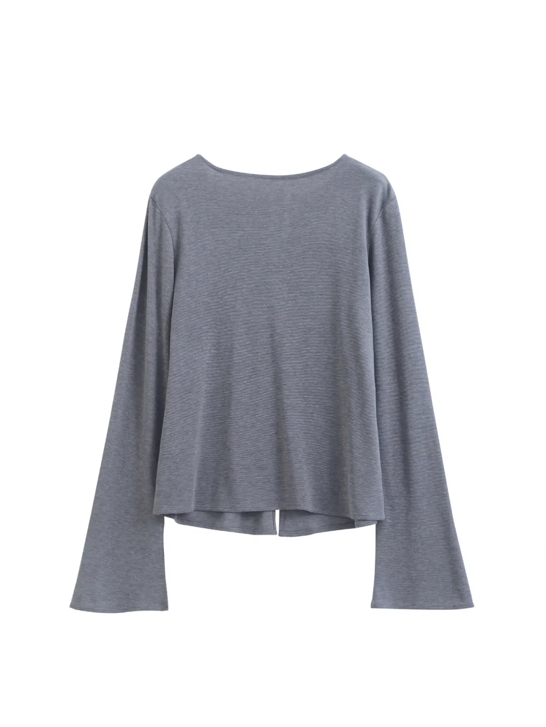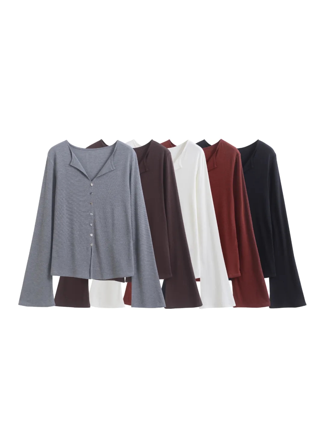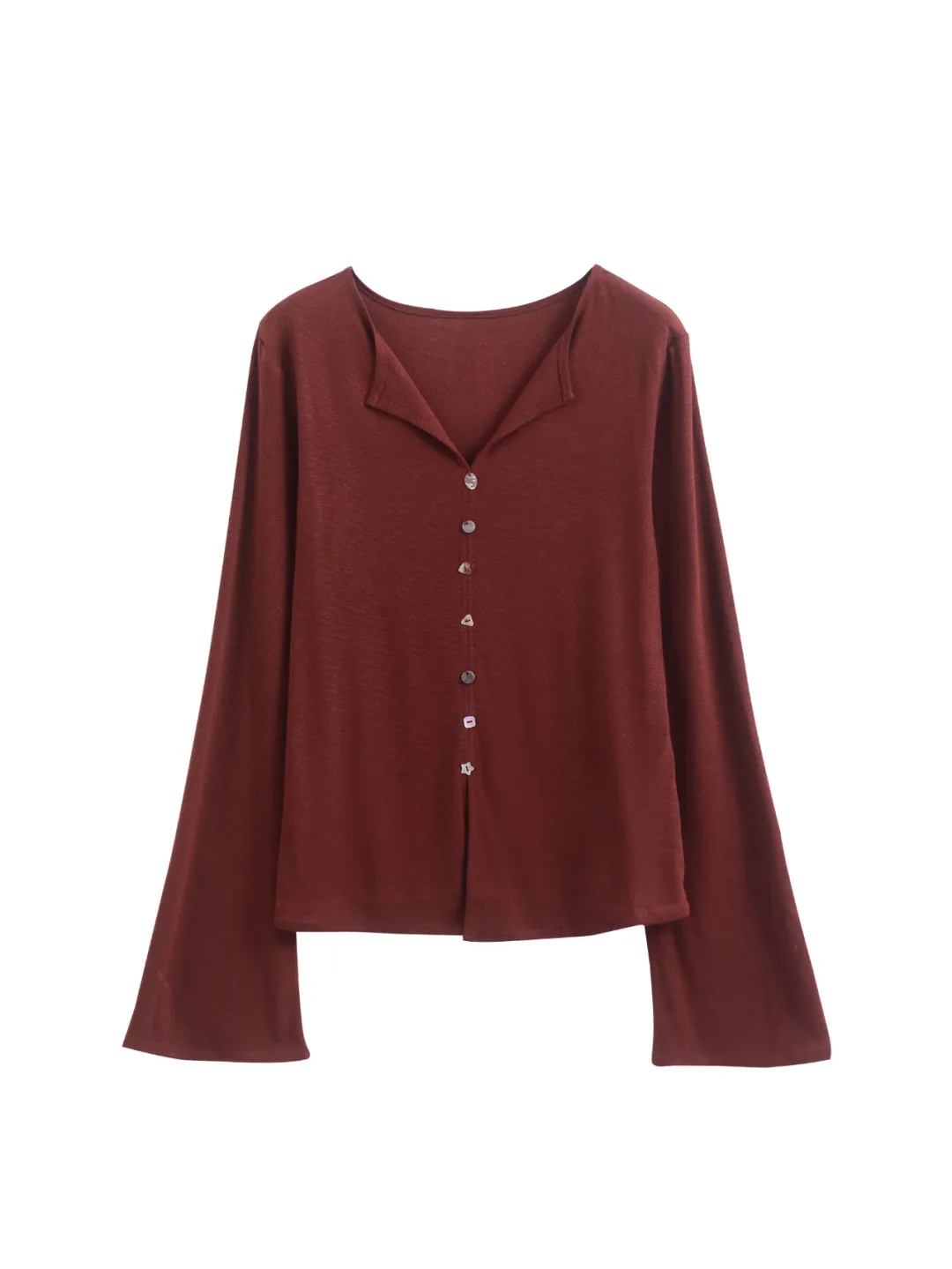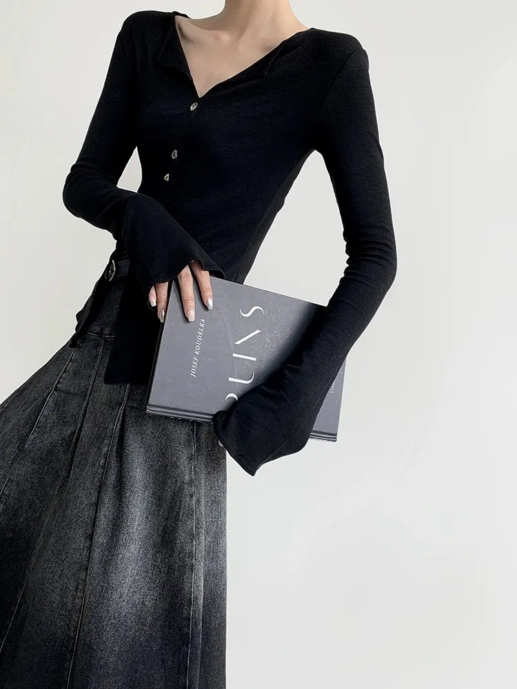 F030607慢氧时光天丝醋酸羊毛贝壳修身V领喇叭袖打底衫