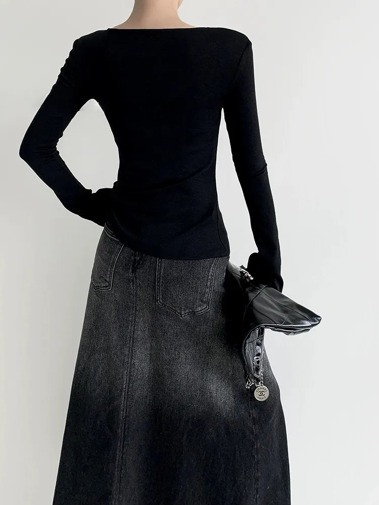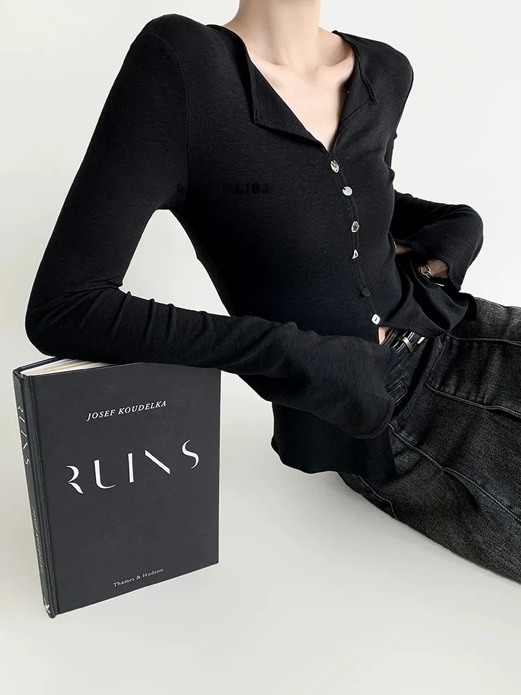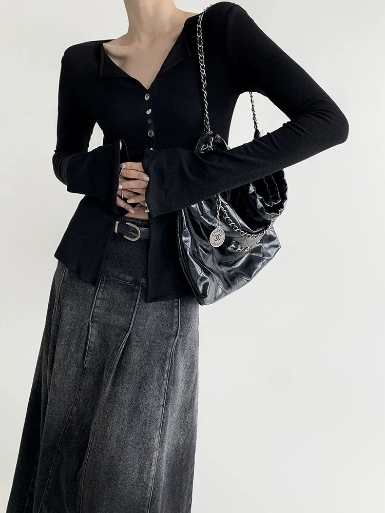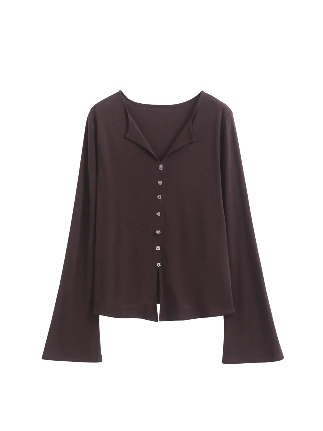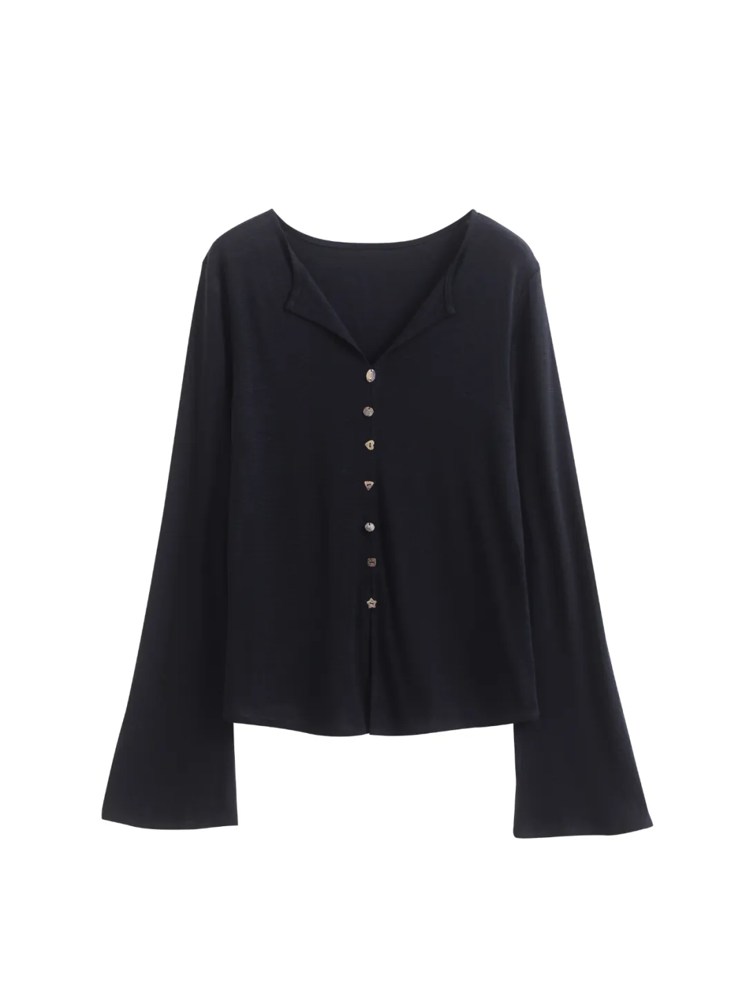 F030607慢氧时光天丝醋酸羊毛贝壳修身V领喇叭袖打底衫