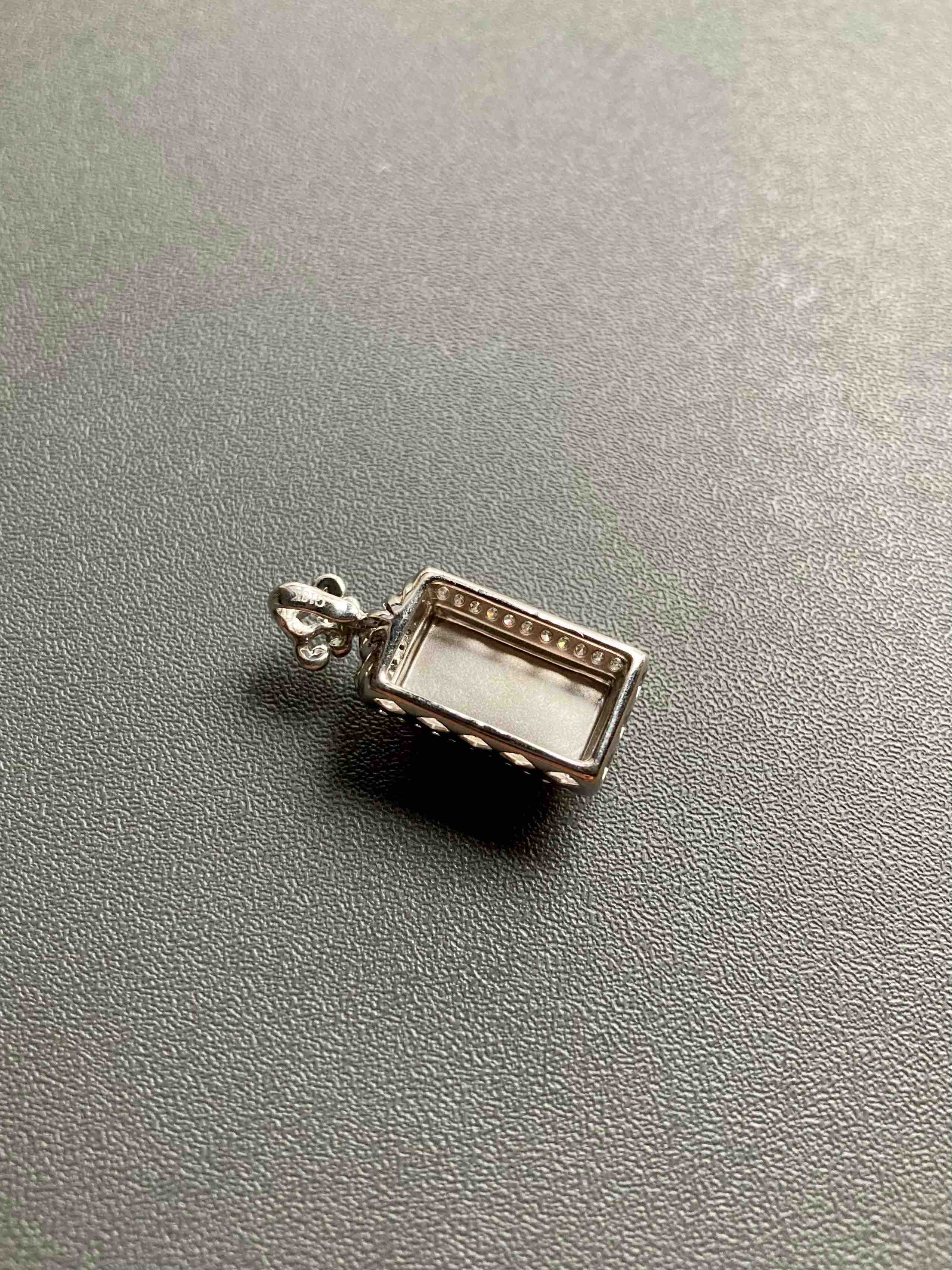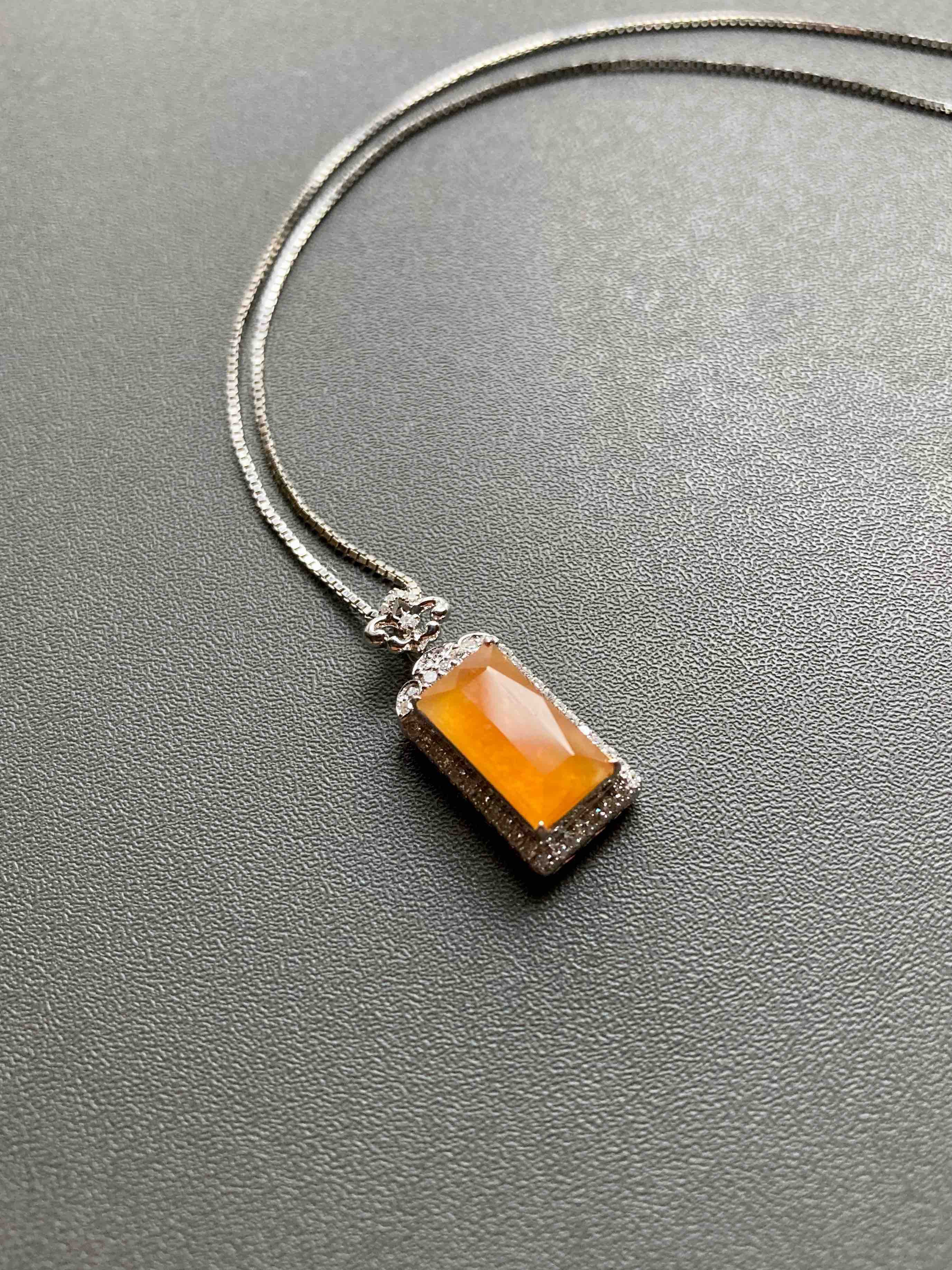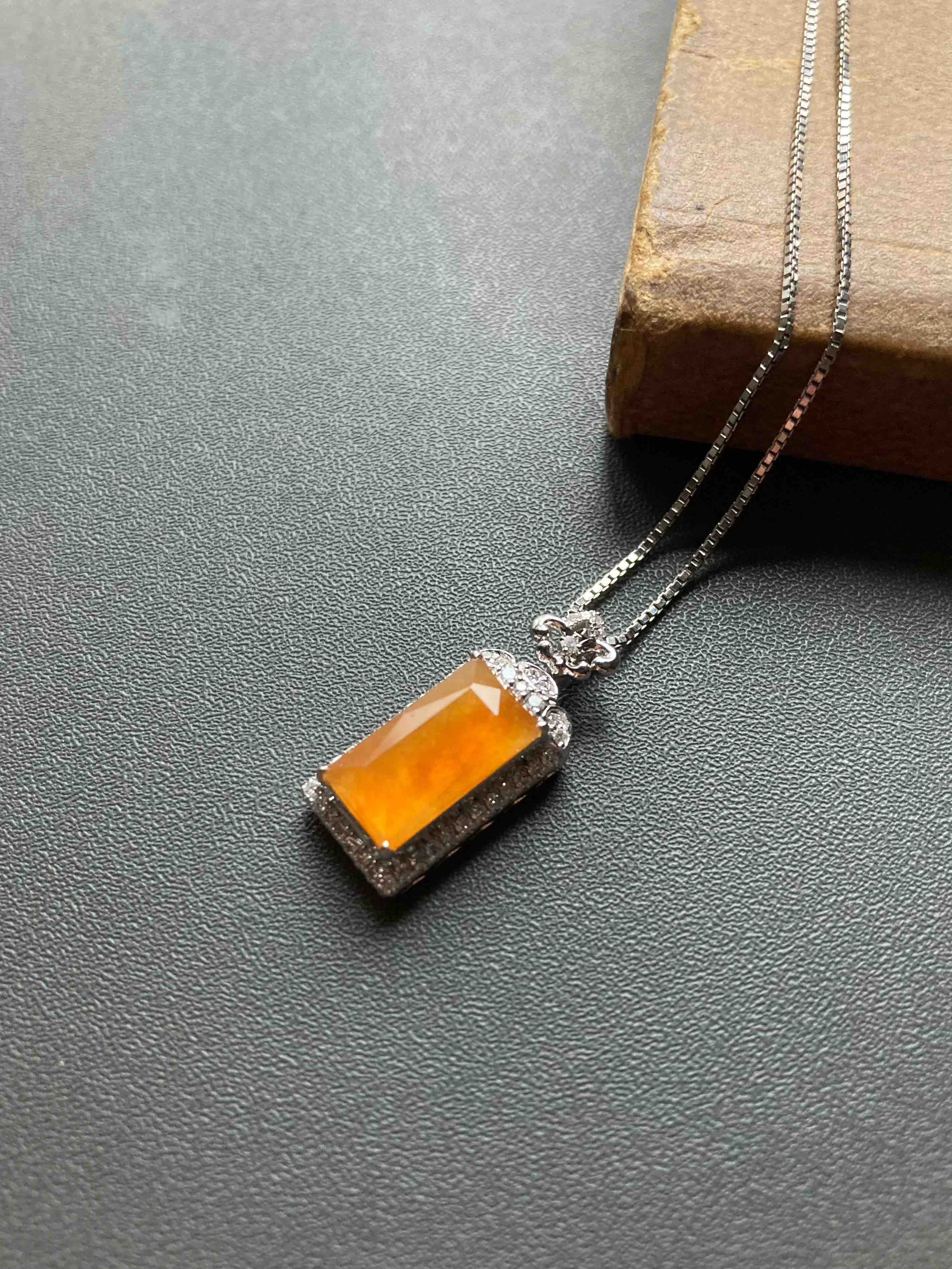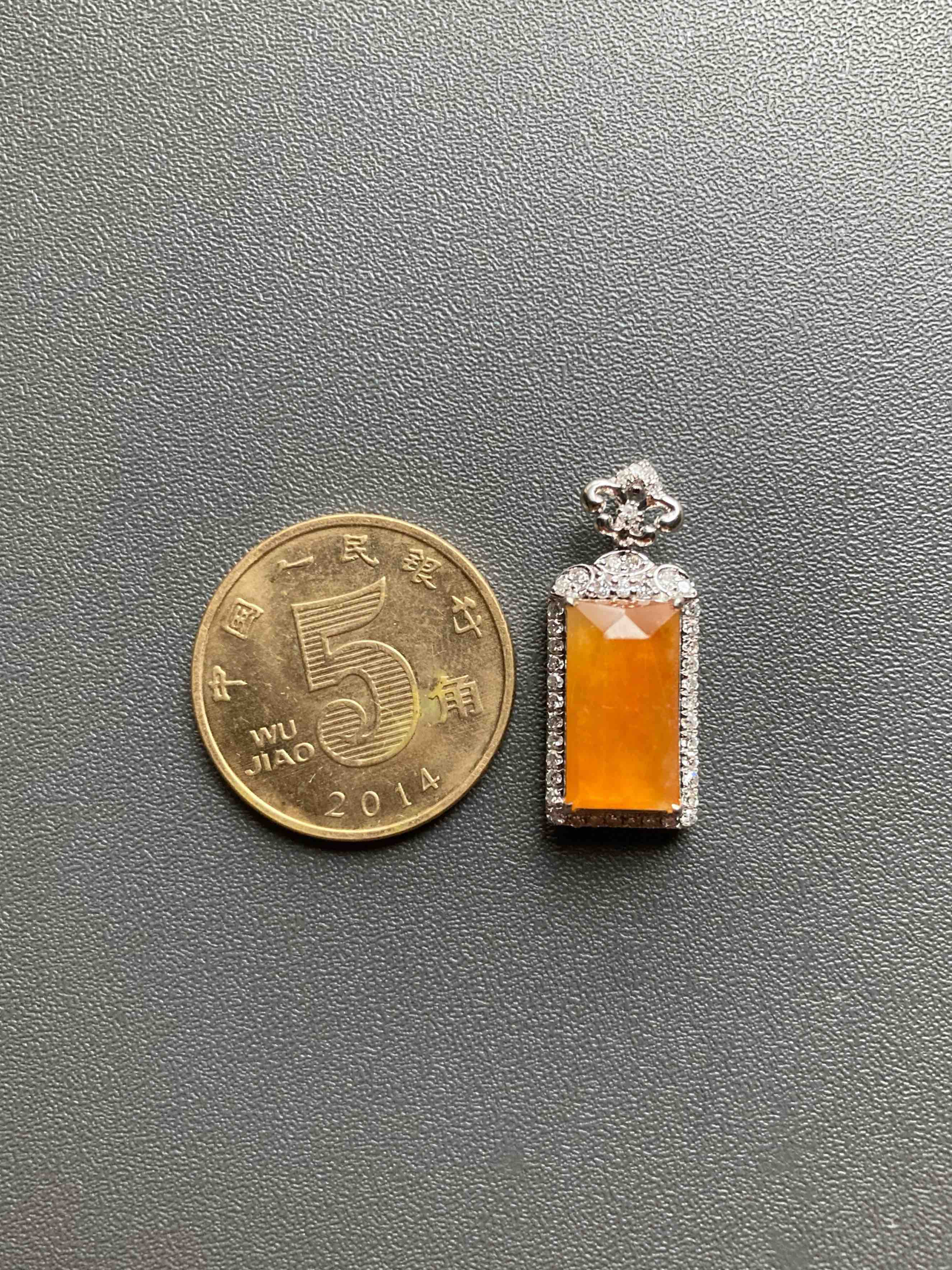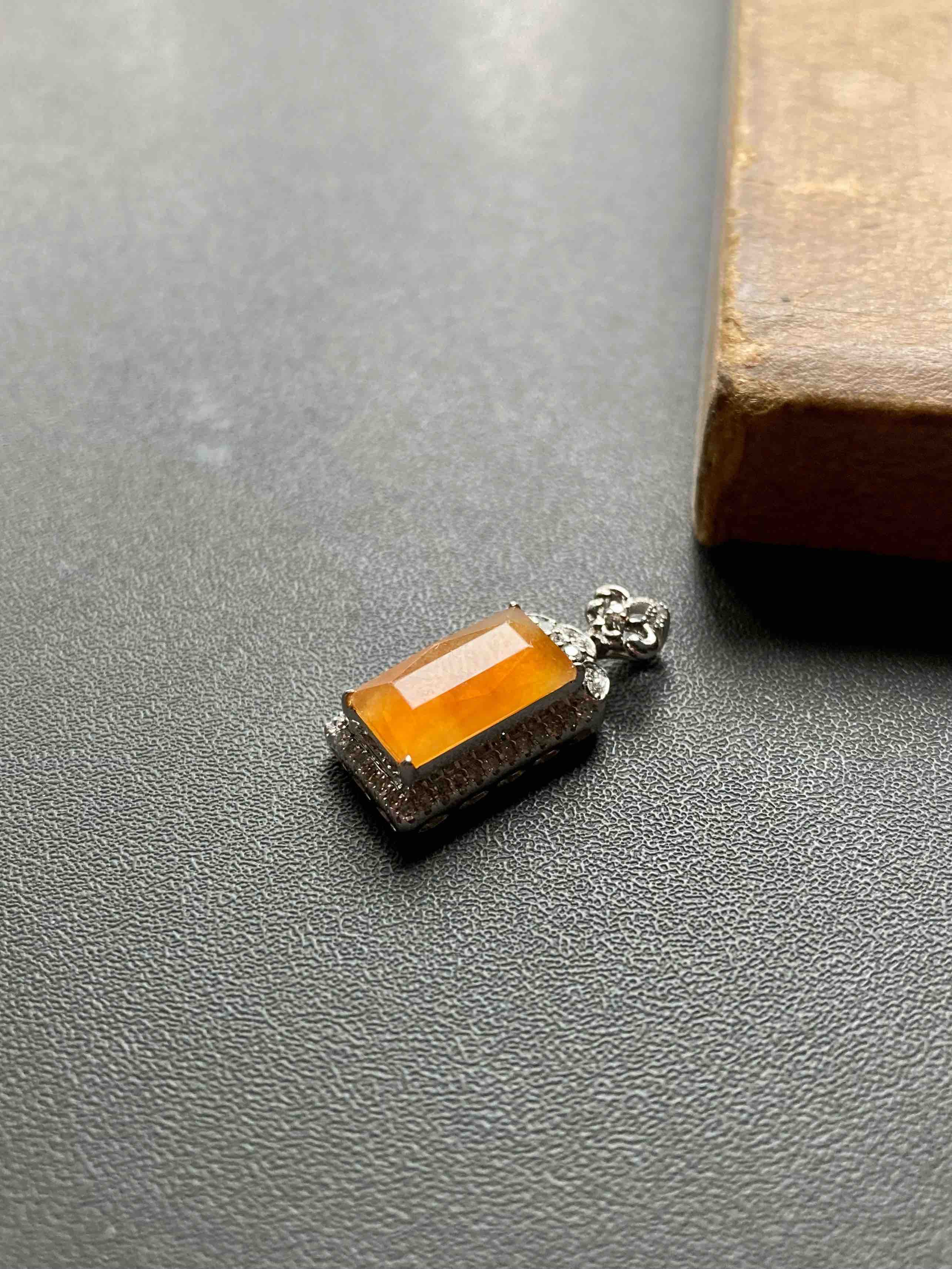属于高阶翡翠玩家的独特之物,高冰种黄翡芬达色吊坠,少见的方形祖母绿切割,种水晶莹剔透,橘黄色艳丽无比,18k白金钻石镶嵌,款式时尚,干净利落,稀有品,行家货,裸石12.9×6.6×2.5mm,镶嵌后22.8×9.3×7.2mm