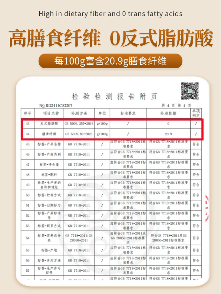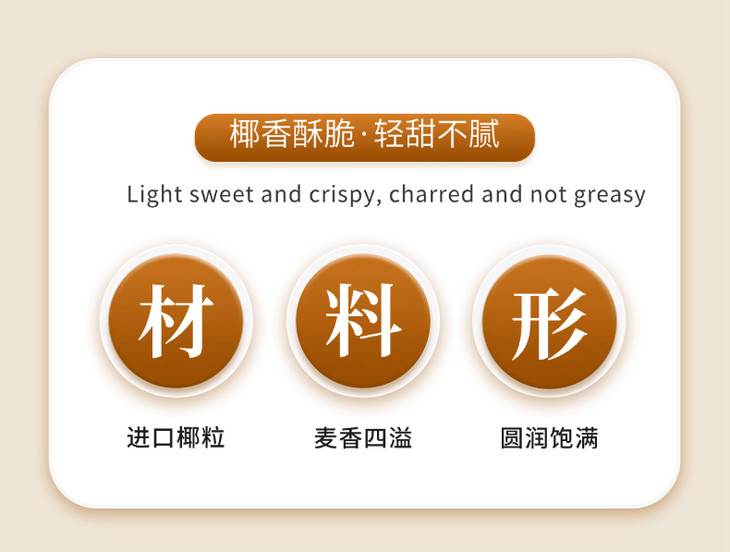 榴小满碳烤椰粒酥,用的是优质高筋小麦粉和新鲜鸡蛋,融合非遗古法工艺与纯手工发酵的精髓,再加入菲律宾进口椰粒,经过慢火烤制,层层叠加,使得每一口都能感受到酥脆非凡的口感与浓郁扑鼻的香气。品牌更是坚持纯净配方,拒绝任何添加剂,包括色素、香精、防腐剂,更不含反式脂肪酸,还富含高达20.9g/100g的高膳食纤维,让食物回归本真味道。已通过多项严格检测哦,安心!