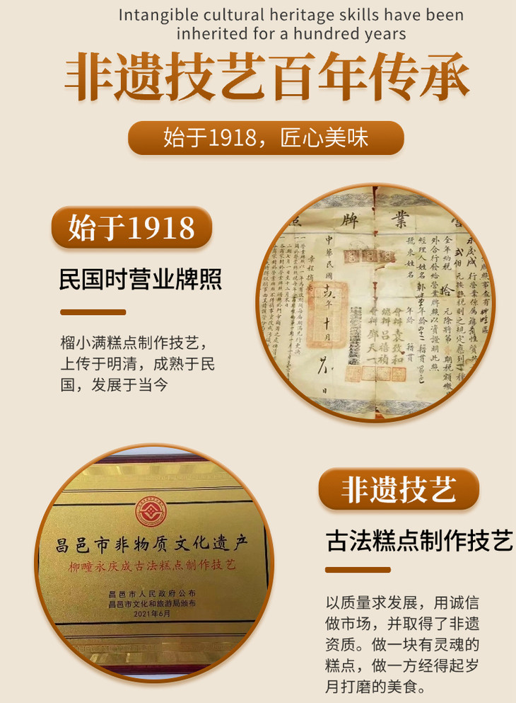 榴小满,源自1918年,承载着百年匠心与传承的精髓。榴小满糕点技艺,其根源可追溯至明清时期,历经民国时期的磨砺,最终在20世纪初期迎来了显著的发展。韩氏家族中的韩洪尧,以勤劳与踏实著称,对糕点技艺的追求达到了精益求精的境界。他遍访各界大师,汲取精华,创作出了众多美味可口的糕点,赢得了广泛的赞誉,迅速在当地市场上崭露头角,占据了一席之地。时至今日,榴小满作为家族传承的百年老字号,始终秉持着安全绿色、卫生健康的经营理念,坚决抵制任何对人体有害的原材料和添加剂使用。公司坚持质量至上,以诚信赢得市场,并成功获得了非物质文化遗产的资质认证。榴小满致力于将每一块糕点都赋予灵魂,让这份美食能够经受住岁月的考验,成为一代又一代人心中难以忘怀的美味记忆!