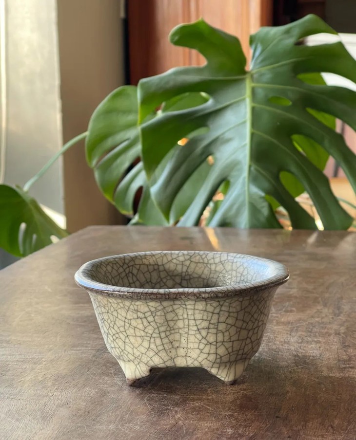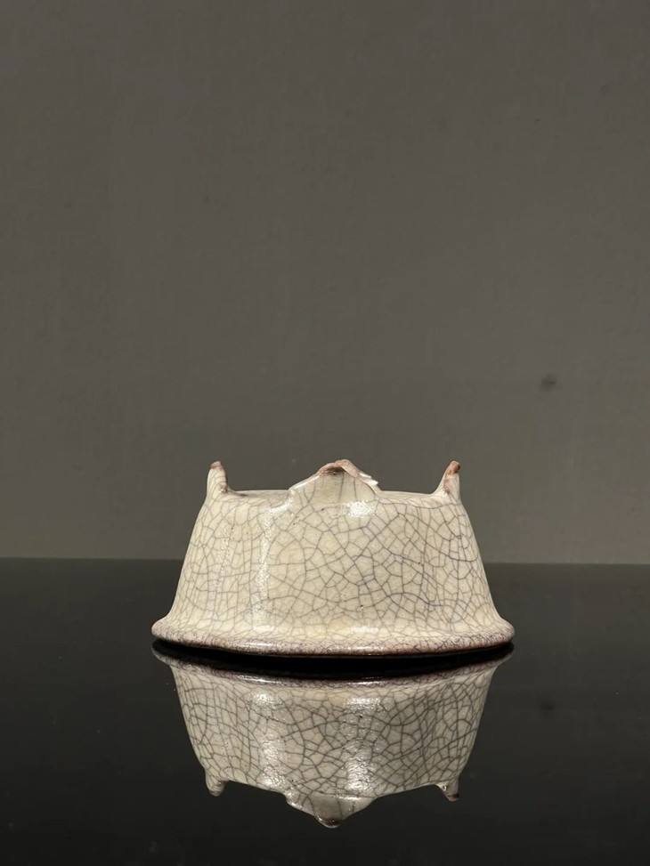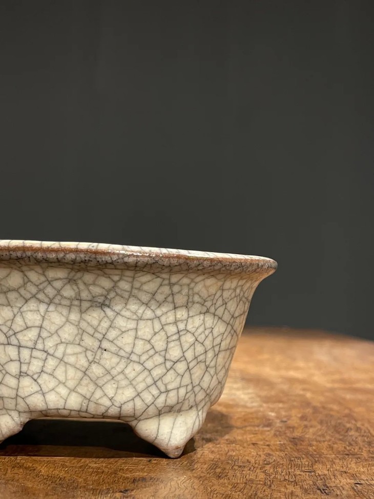 此哥窑灰青釉海棠形四足炉,应是仿古陶瓷佳作,当时此类仿宋代名瓷制作严谨,造型依循古器,釉色仿真极其到位,是当时古玩陶瓷作坊以窑址出土真品销售的高仿宋瓷,颇多欧美与日本藏家购买此类仿古宋瓷后,仍然自认为是真品珍藏至今。如此气质优雅的仿古褐胎哥窑灰青釉海棠形四足炉,不但是精美的案头摆设与实用的香炉外,也是高贵典雅,能够让宾客印象深刻之精美陶瓷藏品。