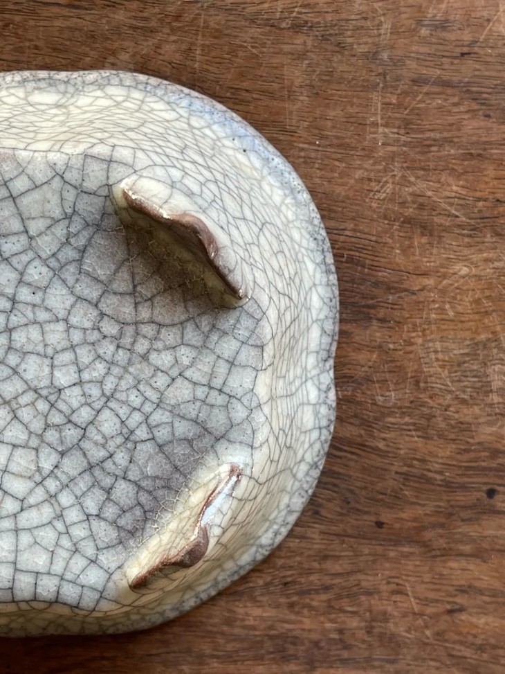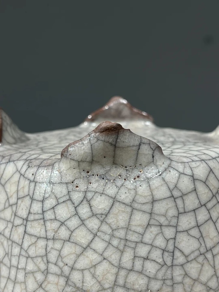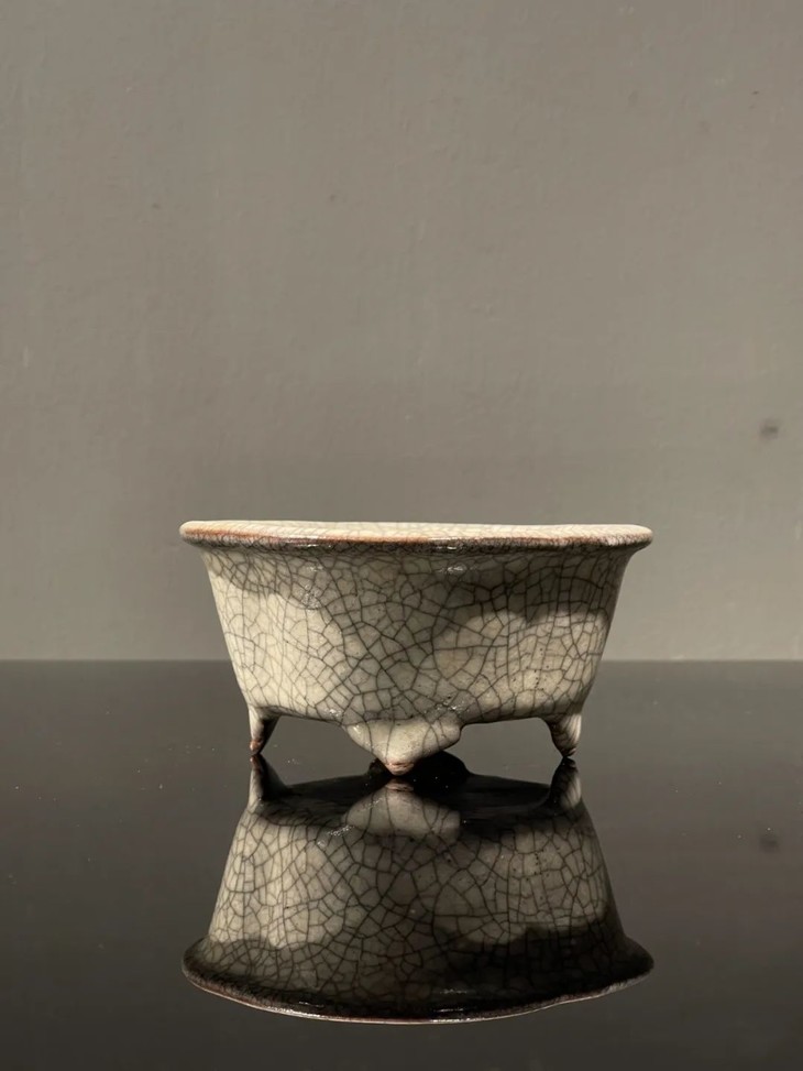 此褐胎哥窑灰青釉海棠形四足炉,造型优雅细腻,灰青色釉质温润如玉,釉面具深黑色与淡褐色细网状开片,呈现古人描述哥窑釉”金丝铁线“的开片特质,除四足底端无釉露褐色胎体外满釉覆盖全器,海棠口瓜棱炉身四撇足的造型精緻细腻,釉色温润、双层开片流畅自然,整体风格精致贵气。