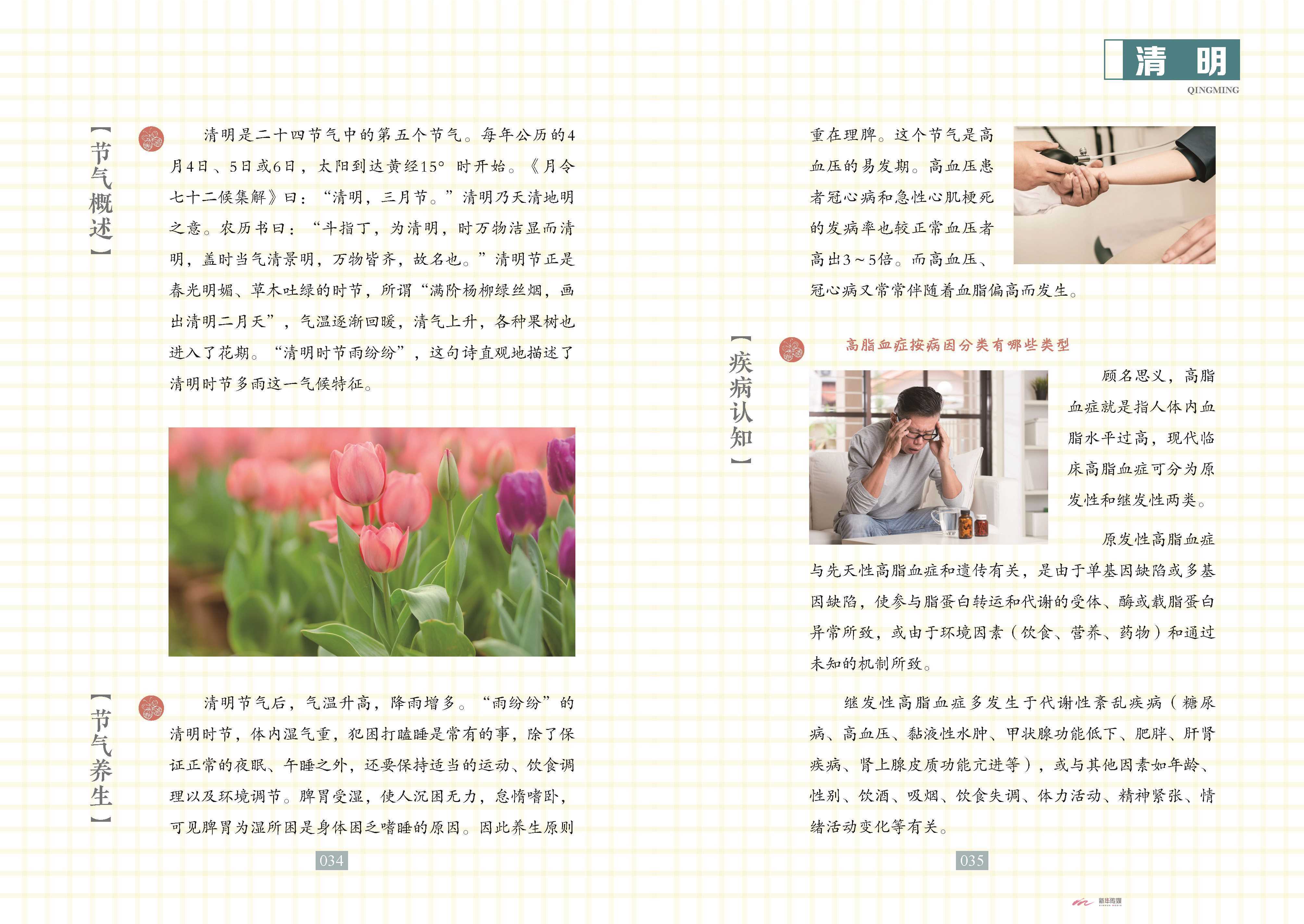 ●立春节气概述节气养生疾病认知中医视角中医调治应时而食药膳厨房雨水节气概述节气养生疾病认知中医视角穴位调治应时而食药膳厨房惊蛰节气概述节气养生疾病认知中医视角中医调治应时而食 【前言】高脂血症,常被称为;高血脂,医学上又称;血脂异常,通常指血浆中的甘油三酯和总胆固醇升高,也包括低密度脂蛋白胆固醇升高和高密度脂蛋白胆固醇降低。高脂血症亦可诱发动脉粥样硬化、心脑血管疾病、消化系统疾病、肾脏疾病,这些疾病都严重危害着人们的身体健康。近年来,随着人们饮食结构的调整,以及人口老龄化趋势愈加明显,高脂血症的发病率越来越高,我国成年人的总体患病率达到了40.4%。一年中,春夏秋冬四时交替,二十四节气在其中循环往复。二十四节气与人们的生活存在着普遍的联系,作为自然界中的一员,我们的五脏六腑、四肢百骸、五官九窍、筋骨皮肉等组织的功能活动也同样受着节气变化的影响。根据二十四节气不同的气候特性,为人们的养生保健提供了现实依据,因此,古往今来的养生家们都十分注重节气养生,并把天人合一的养生观作为不违天时、顺道而行的重要法则。司马迁在《史记太史公自序》中说:;夫春生夏长,秋收冬藏,此天道之大经也。弗顺则无以为天下纲纪。《黄帝内经素问》中也说:;故阴阳四时者,万物之终始也,死生之本也,逆之则灾害生,从之则苛疾不起,是谓得道。因此,人们无论是养生还是治病都要遵循天人合一的传统养生理念,顺从四时阴阳节气的变化,懂得如何根据气候的变化,有效保养身体,防御疾病的侵害。全书以二十四节气为主线,详细介绍了每个节气的气候特点和变化规律,以及血脂异常的读者在这个节气里如何顺应时令变化进行起居、运动、情志养生。另外,本书还有疾病认知、中医视角、中医调治、应时而食、药膳厨房等内容,指导读者进行自我健康教育、养生保健和食疗。本书集科学性、实用性于一体,图文并茂,通俗易懂,详细介绍了日常健康保养和疾病调治过程中应该了解的医学常识,对于指导读者在一年中不同节气的饮食、运动、起居与情志调节有一定的意义。由于编写水平有限,若书中存在错误和不足之处,敬请读者批评指正。