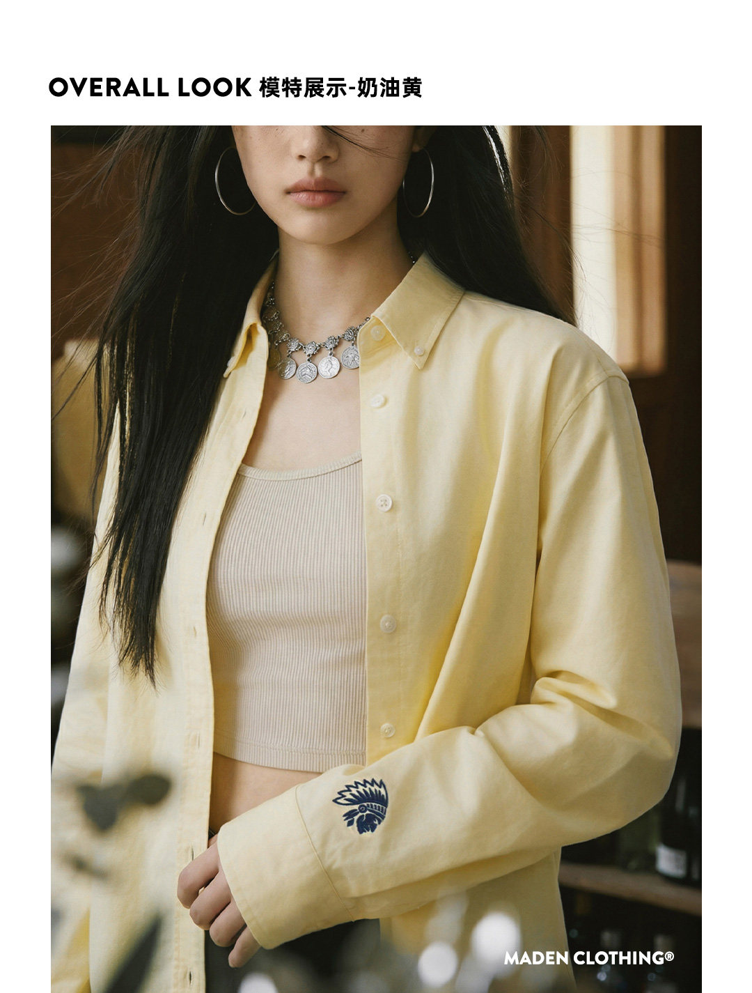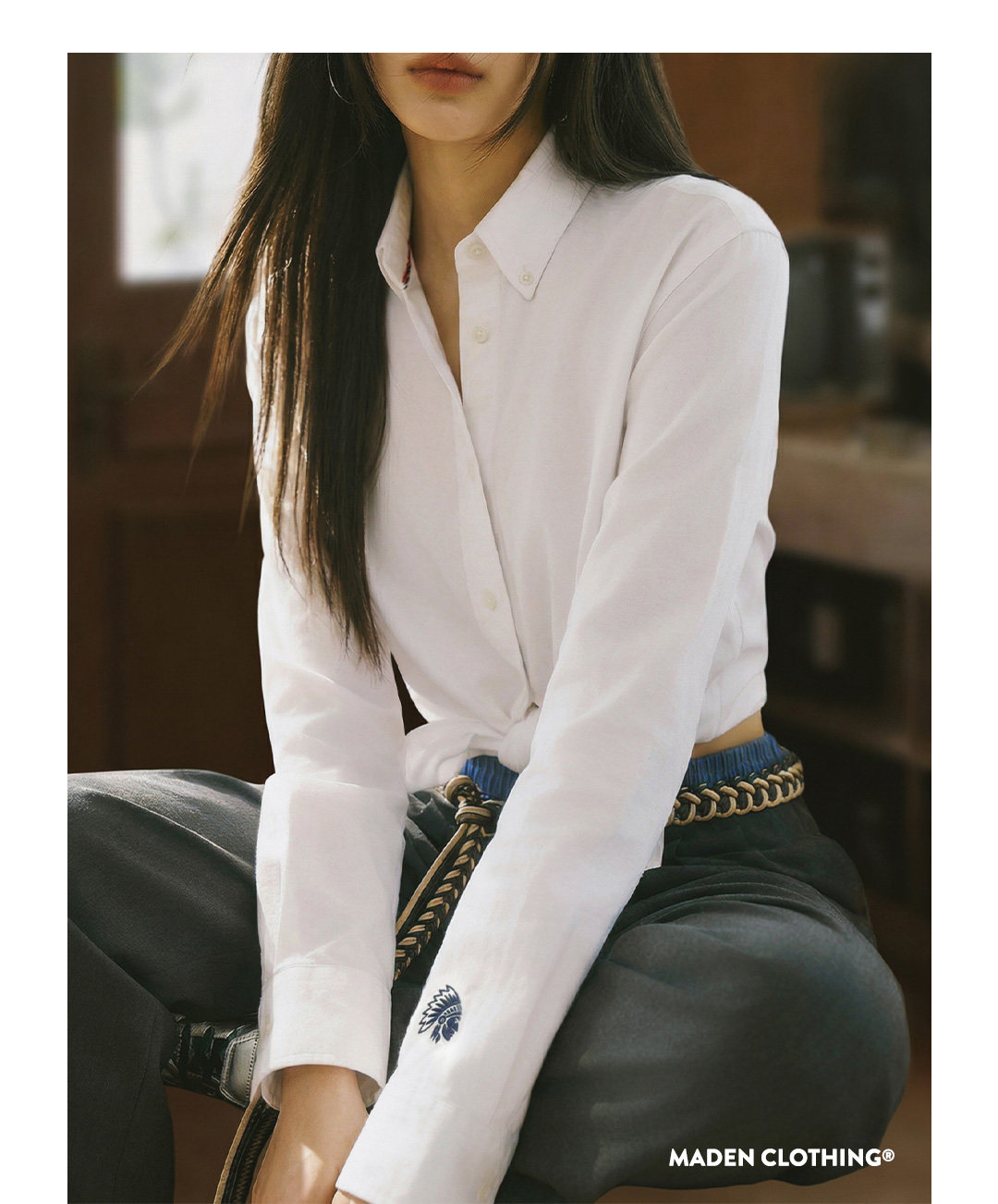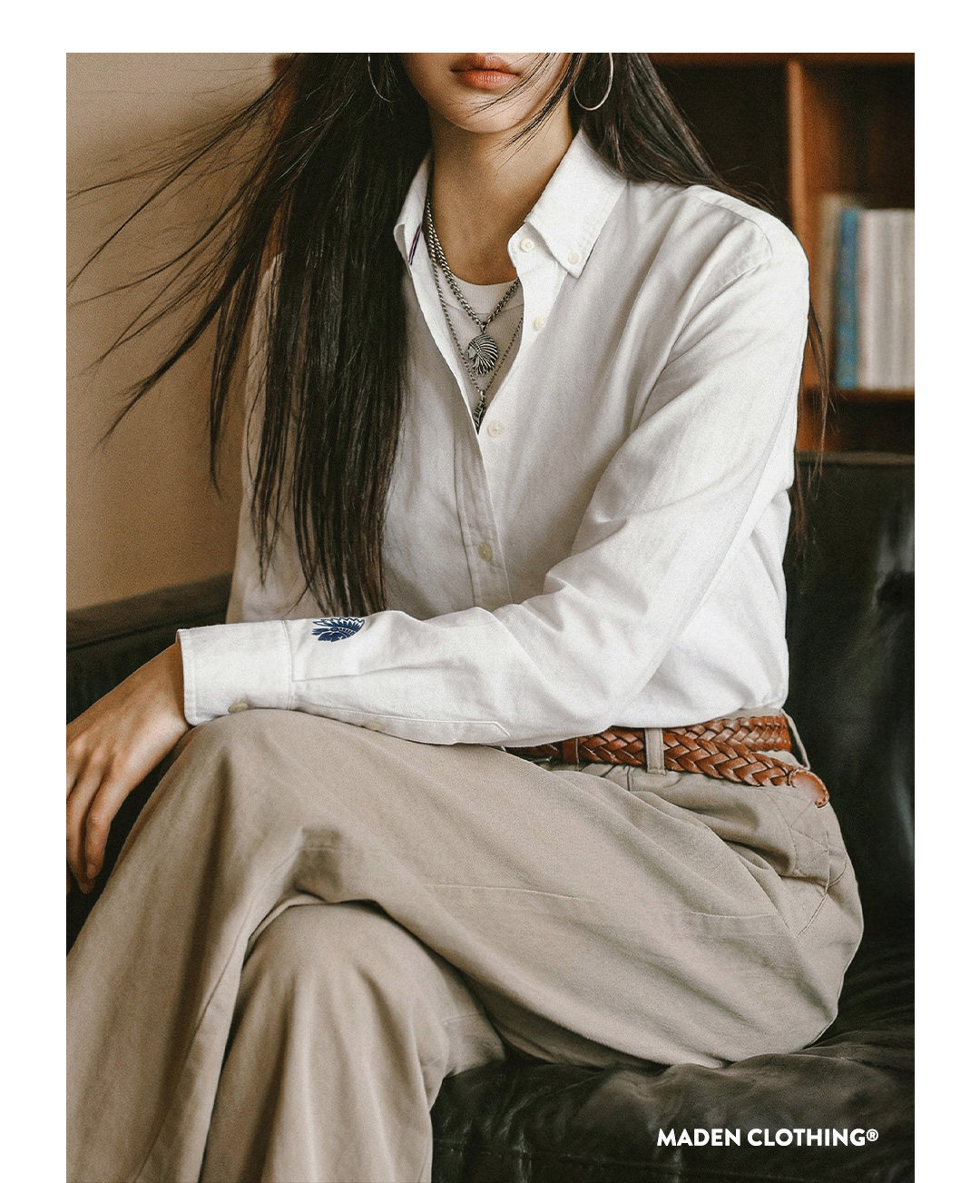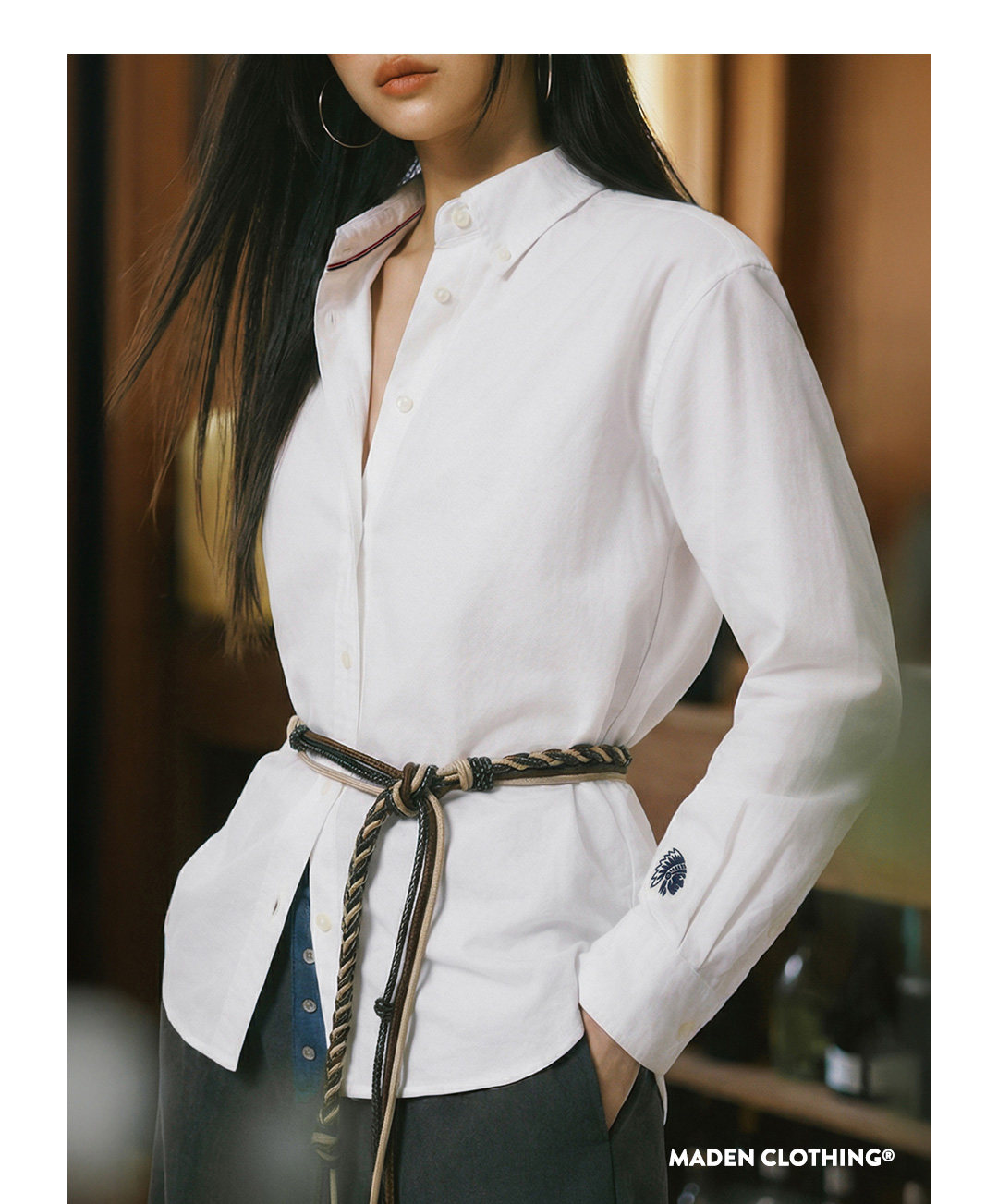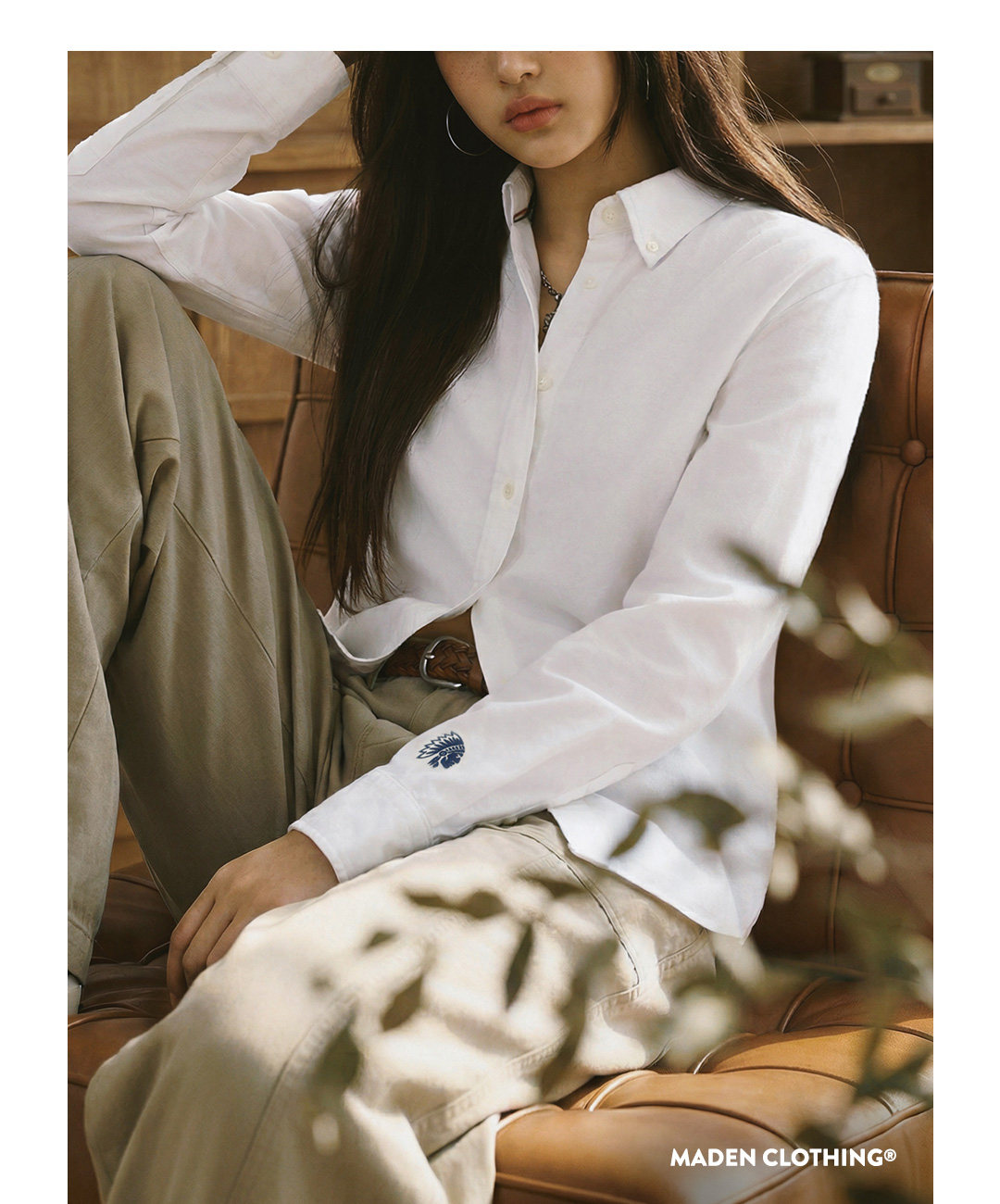 马登白色全纯棉翻领西装牛津纺衬衫刺绣叠穿长袖内搭上衬衣女士春