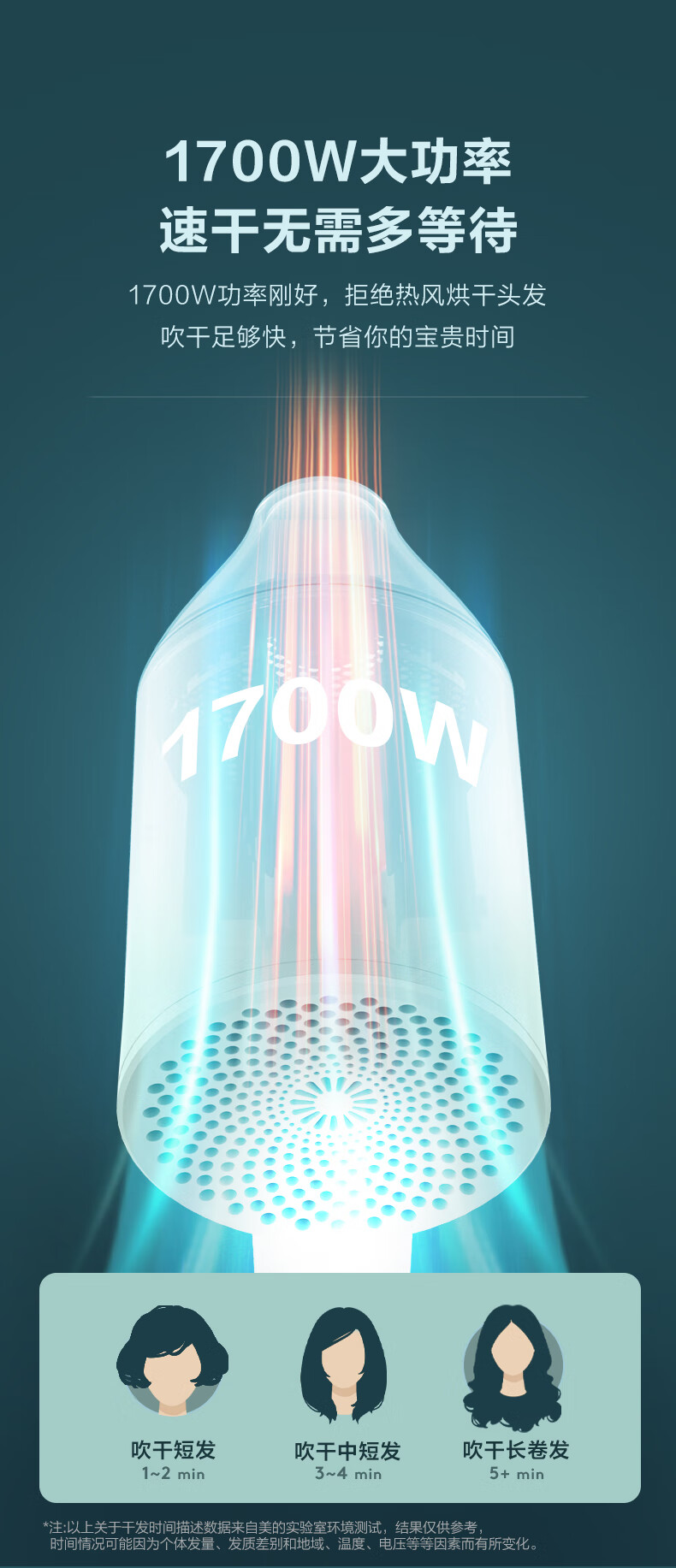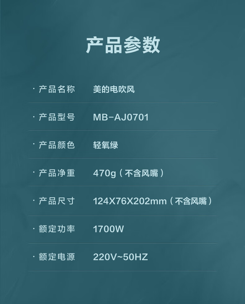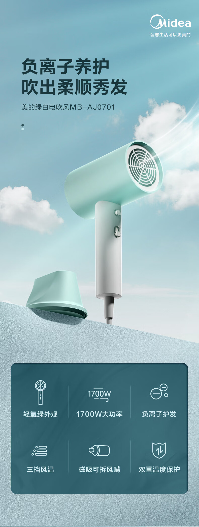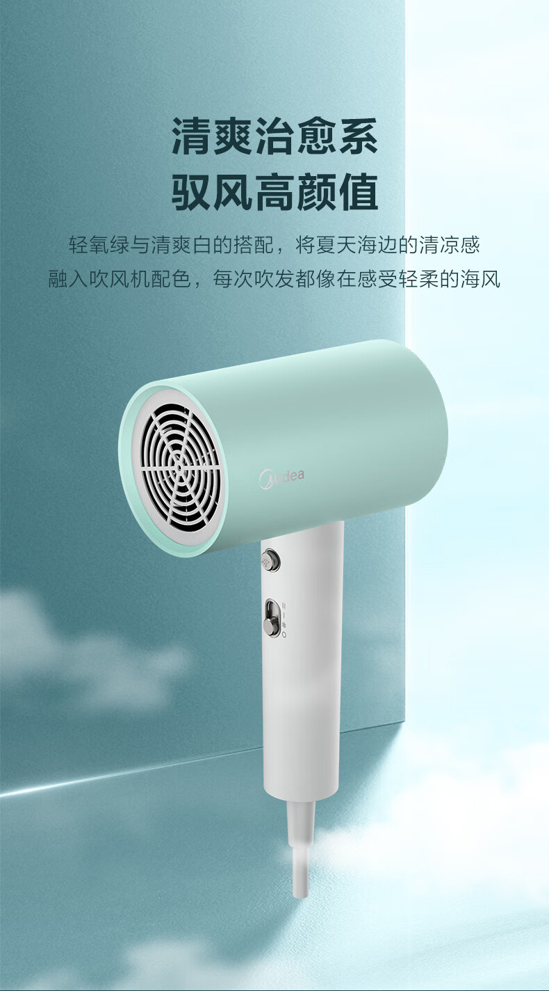 美的(Midea) 电吹风家用大功率吹风筒便携恒温护发速干低噪 MB-AJ0701 轻氧绿