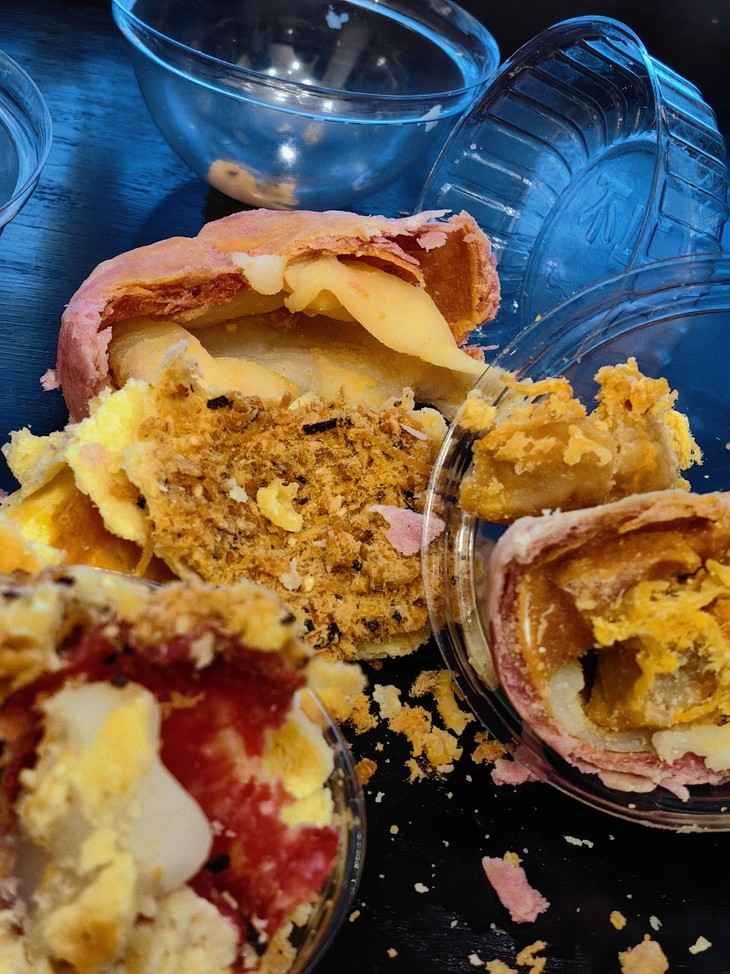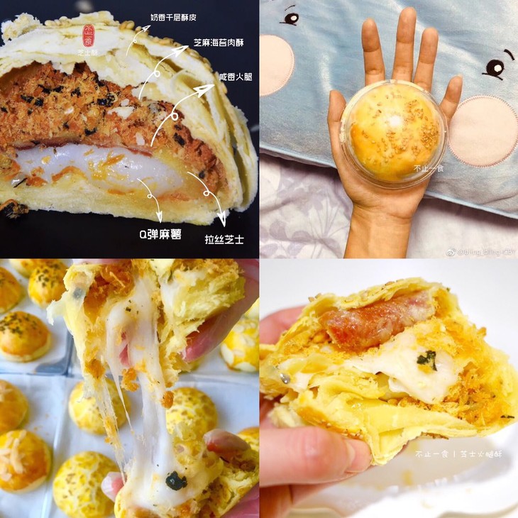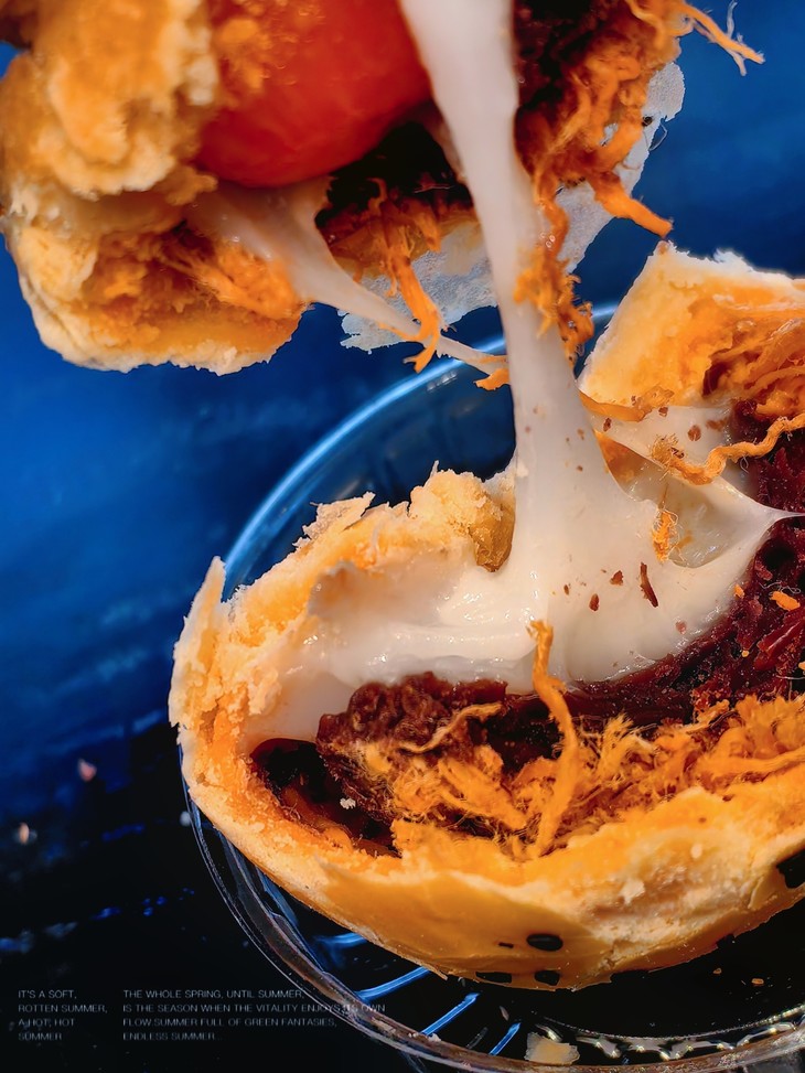 芝士酥:内里依次是美国米格农场芝士、台湾新东阳海苔芝麻肉松、西班牙萨拉米和台湾糯麻薯。软甜的芝士与咸香的肉松和萨拉米完美结合,加热后口感更是妙不可言。浓郁的芝士风味与其他食材在口中交融,带来极致享受!