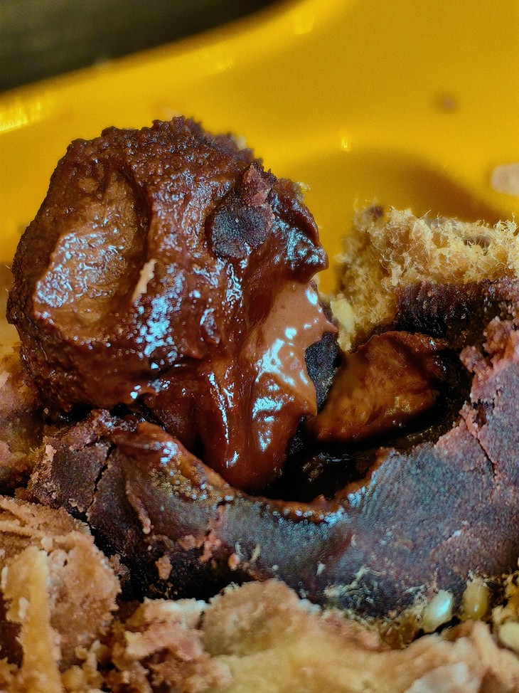 巧心炸弹:层次极为丰富,法芙娜可可酥皮带来酥脆开场,台湾新东阳芝麻海苔肉酥的鲜香紧随其后,木糖醇绵密豆沙的细腻温柔包裹,再加黑巧秘制流心在口腔中爆开,甜糯麻薯又带来软糯余韵,多种口感相互碰撞,实在是绝妙无比!