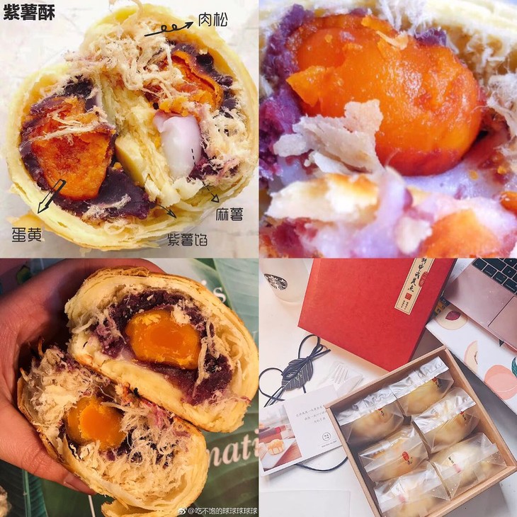 紫薯大酥:低卡鸡丝肉松的清爽、粗纤维紫薯的质朴、沙沙流油秘制大蛋黄的浓郁以及糯香味十足麻薯的软糯,再点缀上大杏仁,真的让人欲罢不能,鸡丝肉松的轻盈,紫薯的香甜与蛋黄的咸香在舌尖散开,麻薯软糯弹牙,杏仁还增添香脆口感!独家健康低糖秘方,老人、小孩也可以偶尔尝尝!