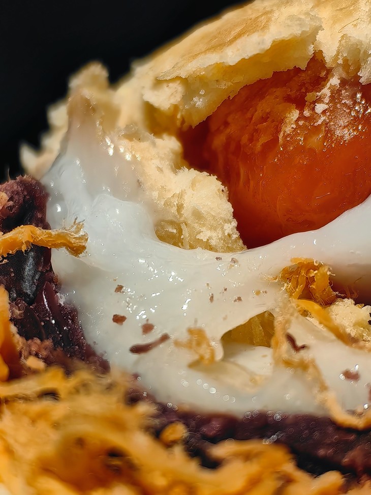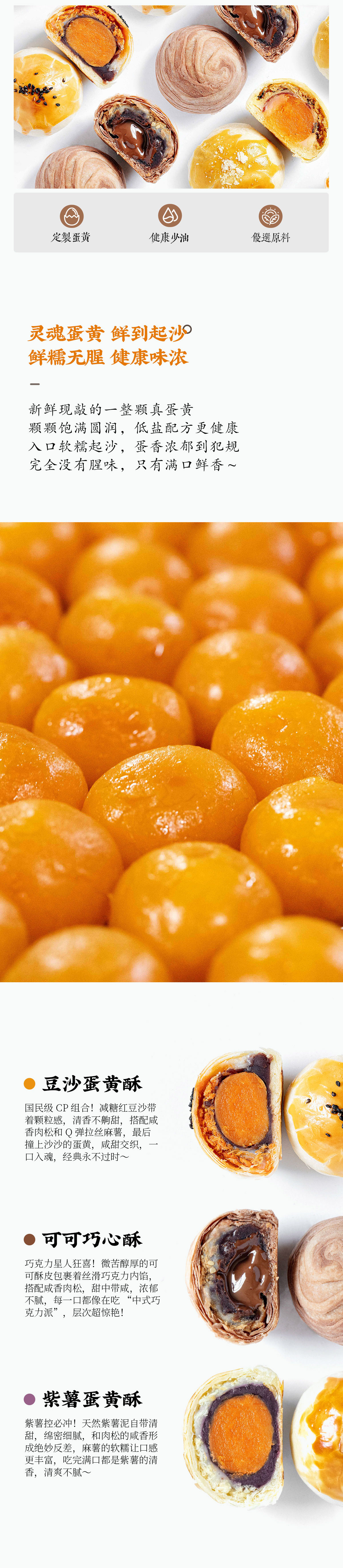 豆沙大酥:让纯肉金丝猪肉松的鲜香、木糖醇豆沙的细腻、超大个秘制咸蛋黄的醇厚咸香以及拉丝麻薯的Q弹软糯集合在了一起,肉松的蓬松口感和豆沙的绵密与咸蛋黄的沙沙质感交融,最后是麻薯带来奇妙的嚼劲,整体口感丰富,还是低糖配方哦!