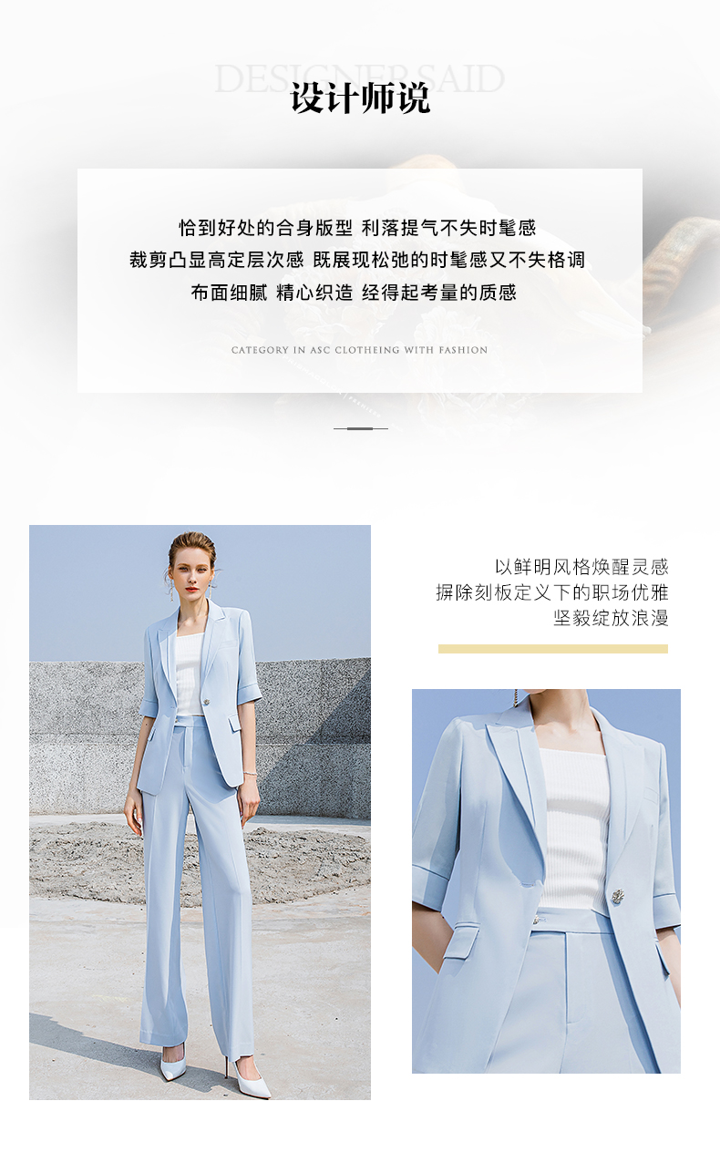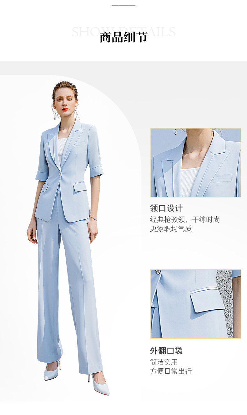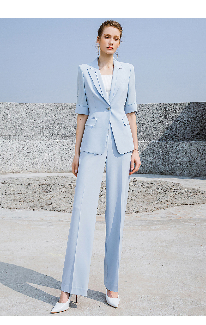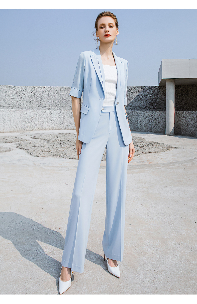 高端时尚淡蓝色西装微喇裤套装女夏气质短袖西服职业装正装外套
