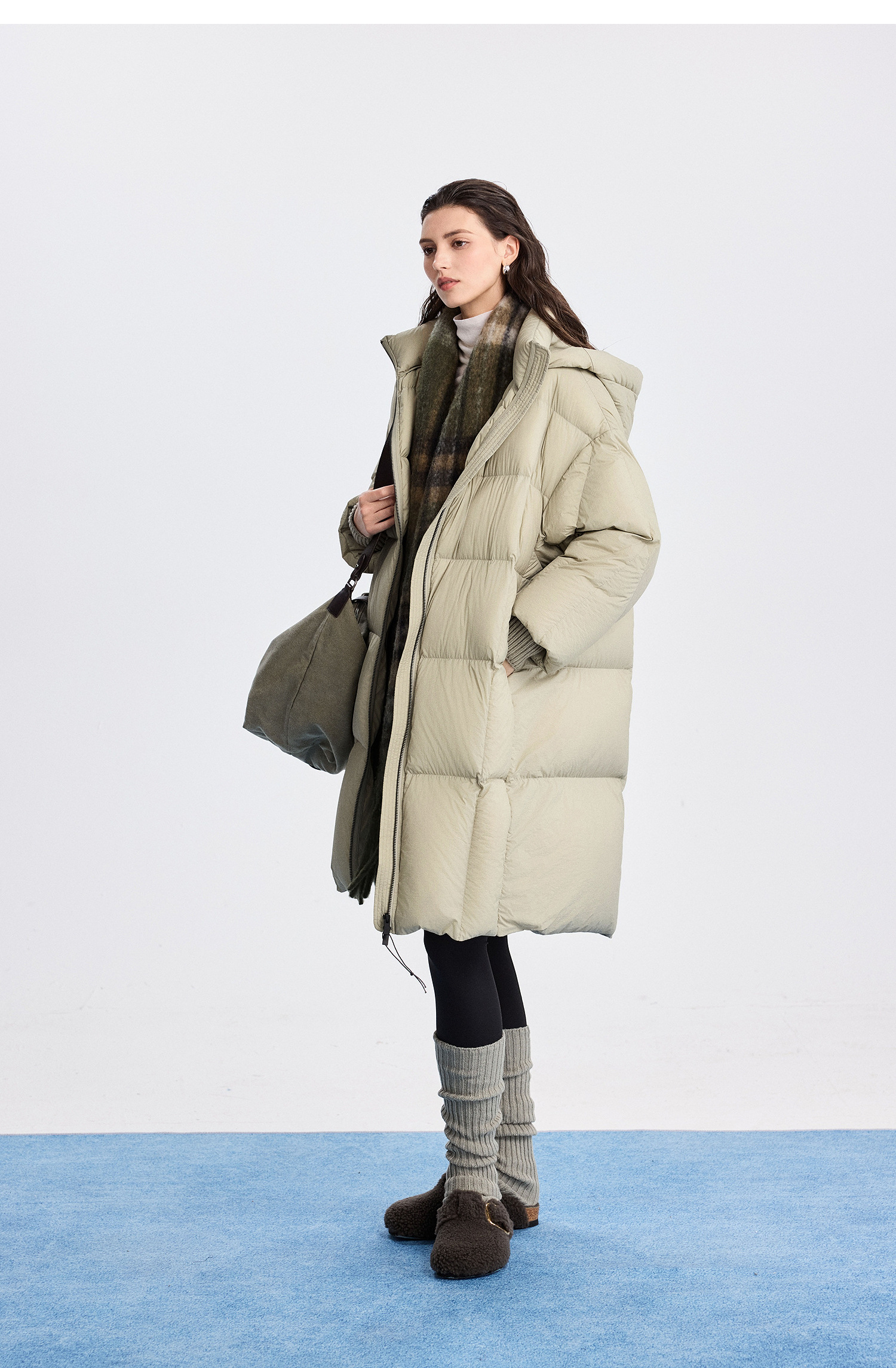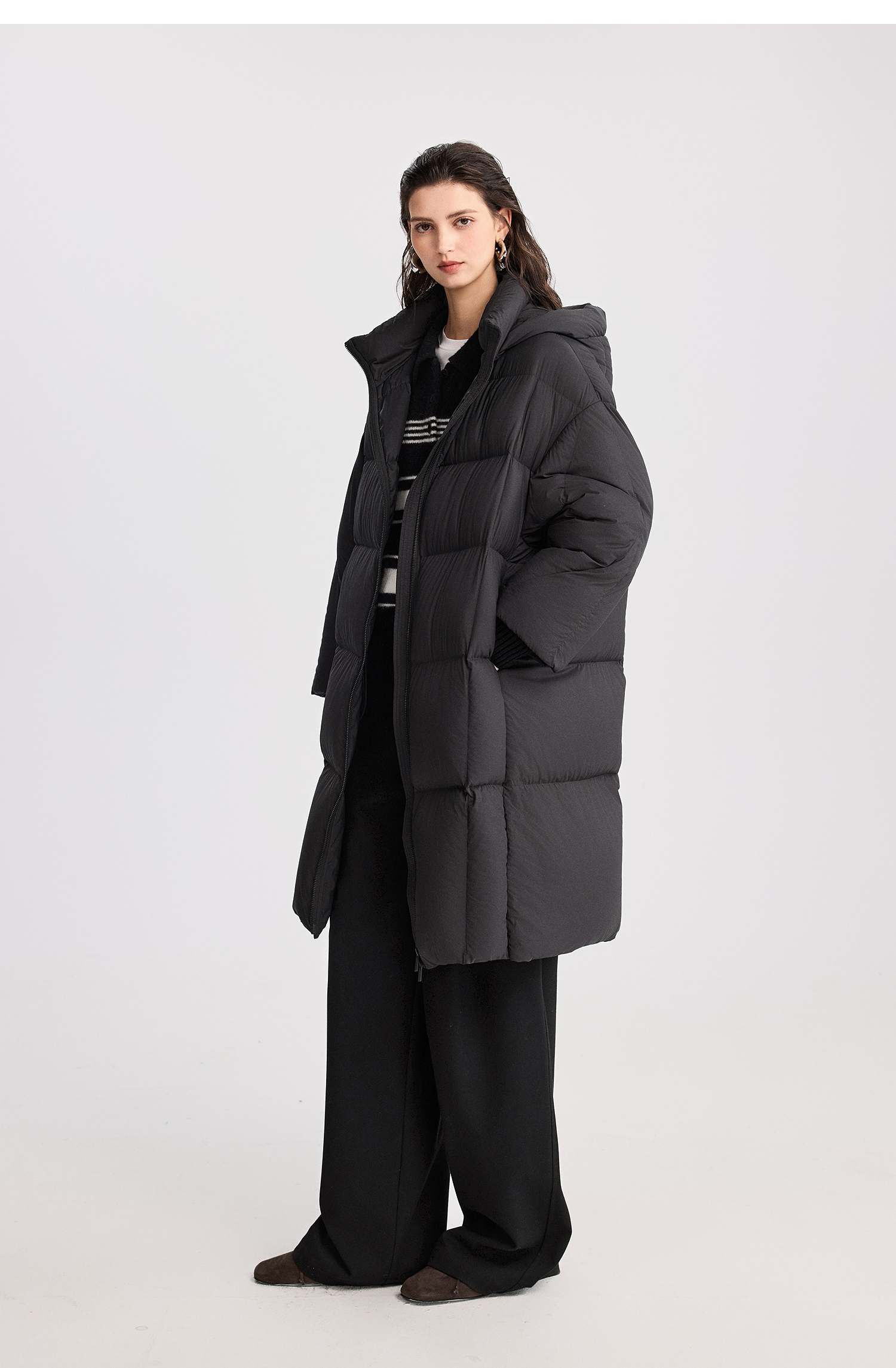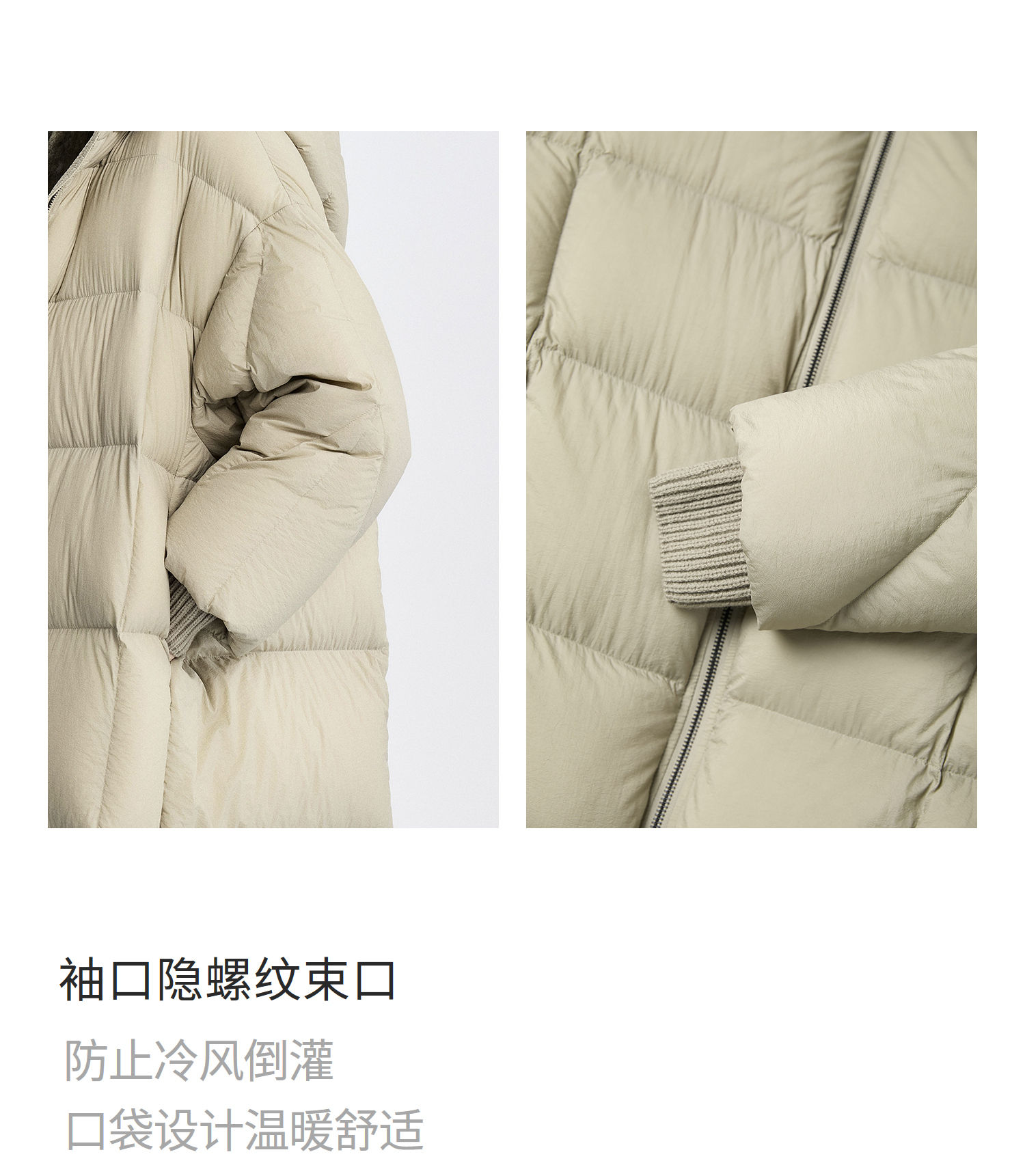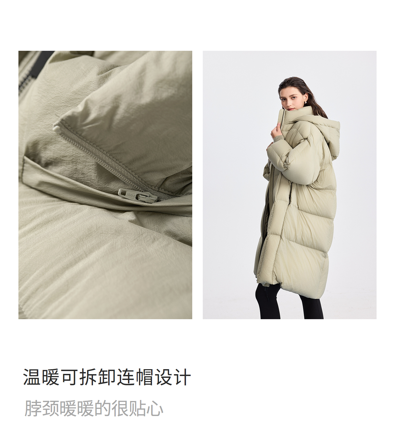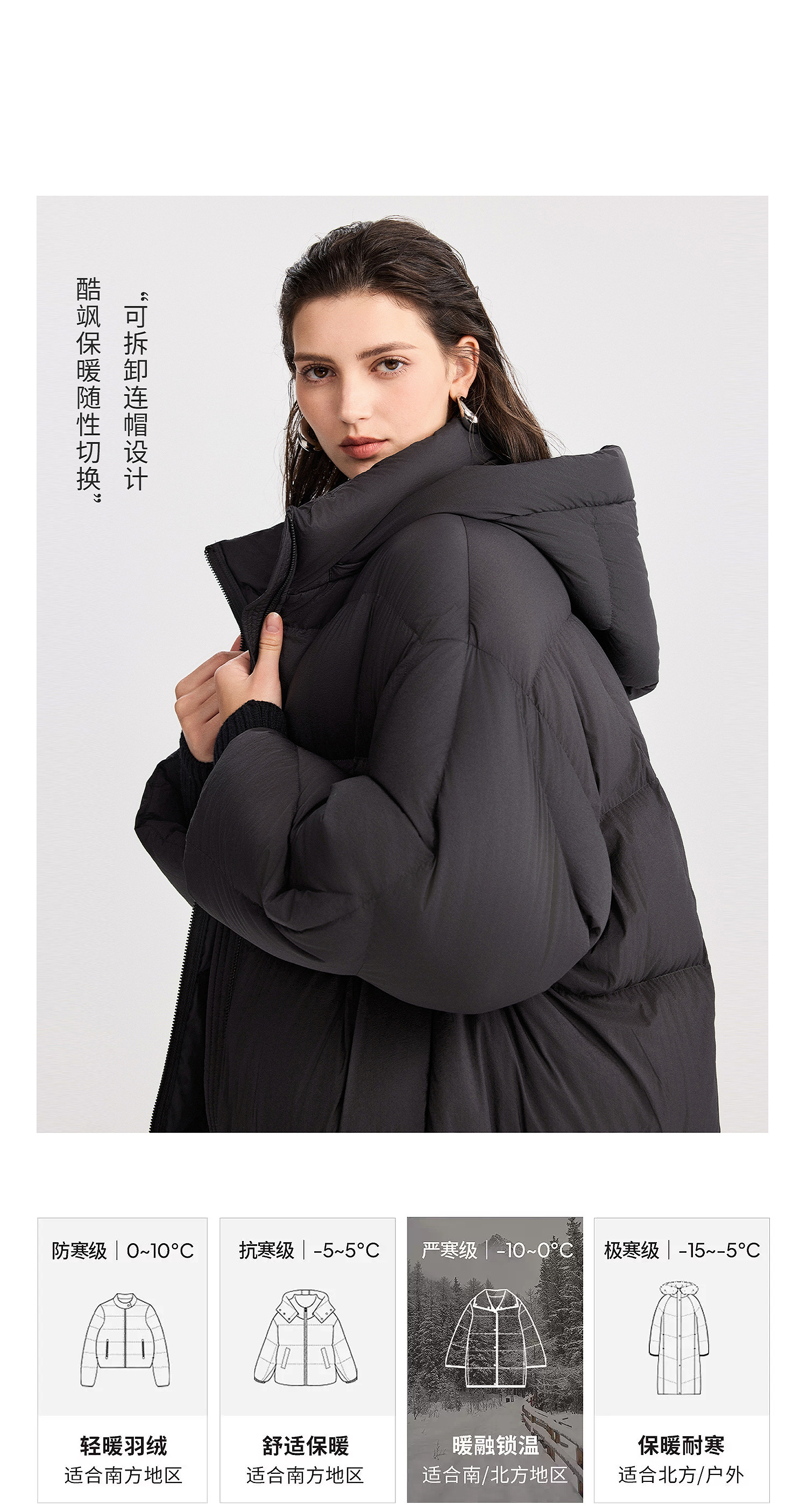 棉仓366615021-【90白鹅绒】褶皱肌理感连帽羽绒服女25秋冬中长款过膝外套